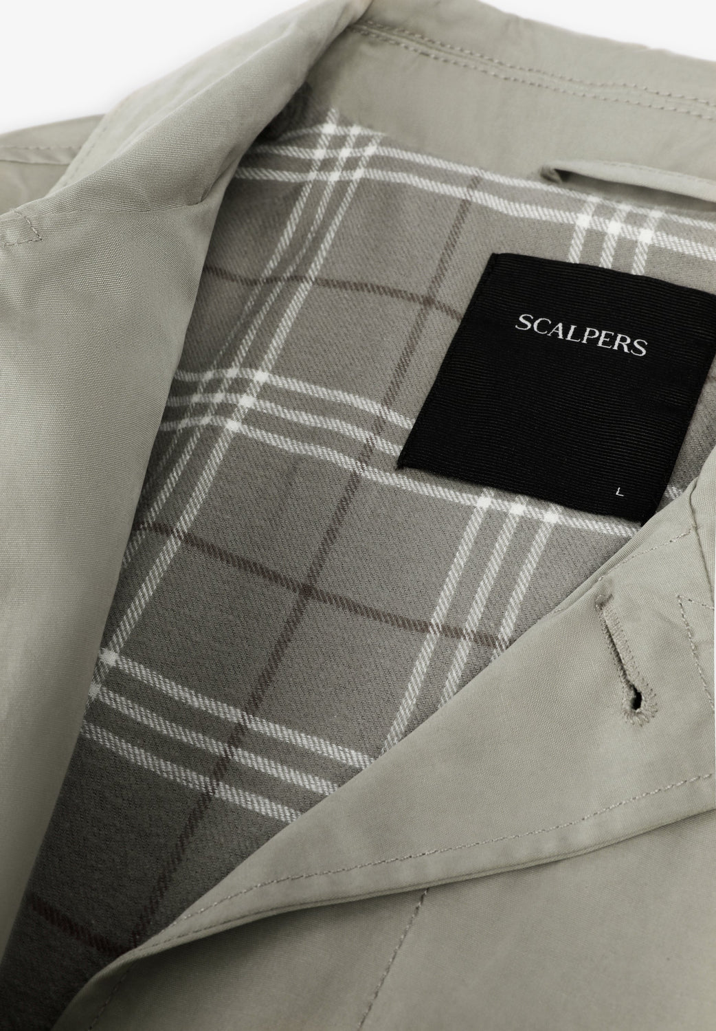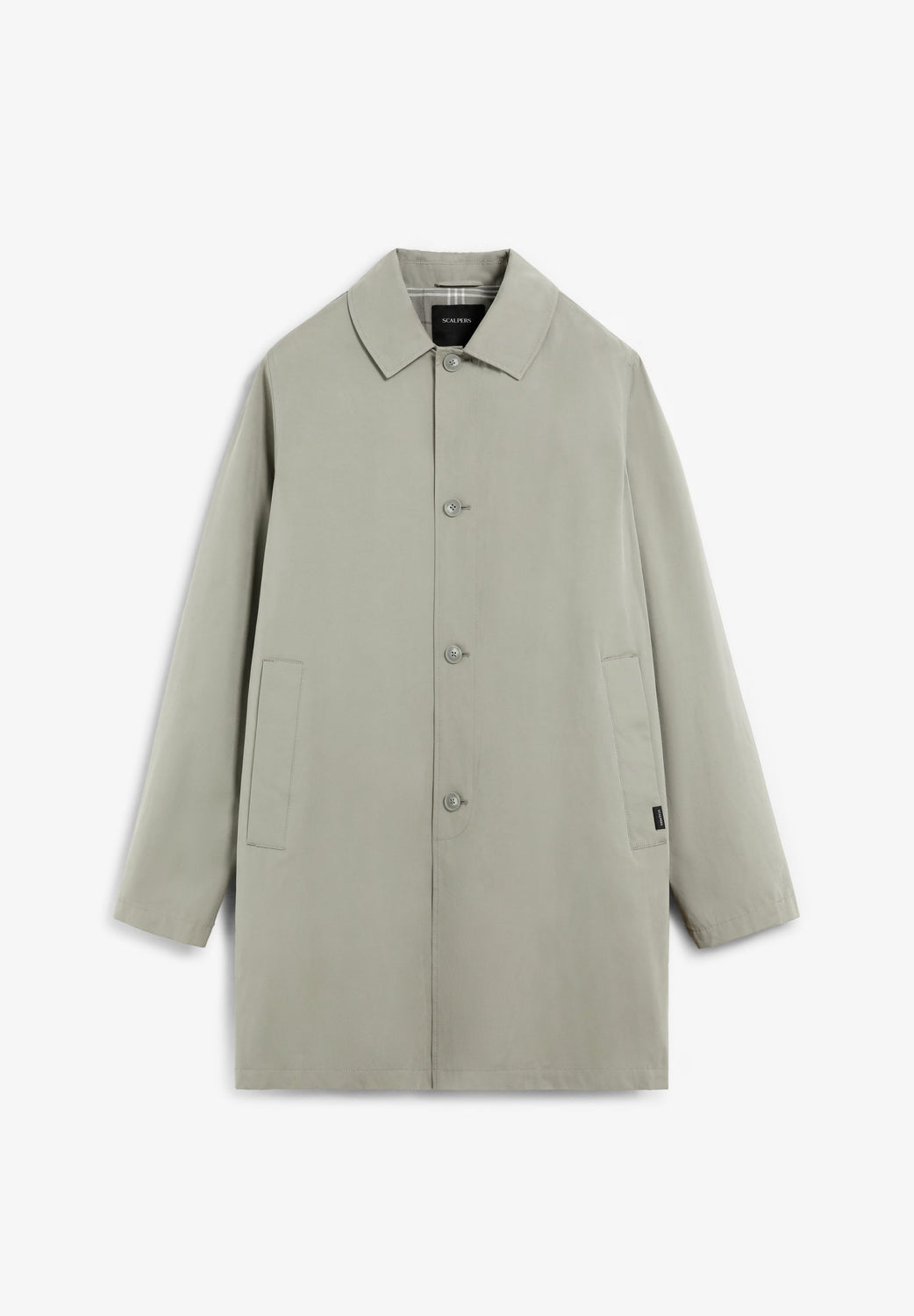 Trench coat with front button fastening. Shirt collar. Two front slant pockets. Stitching details along the length of the garment. Front button fastening. Checked lining. Logo label detail on pocket and inside pocket and skull print on sleeve.