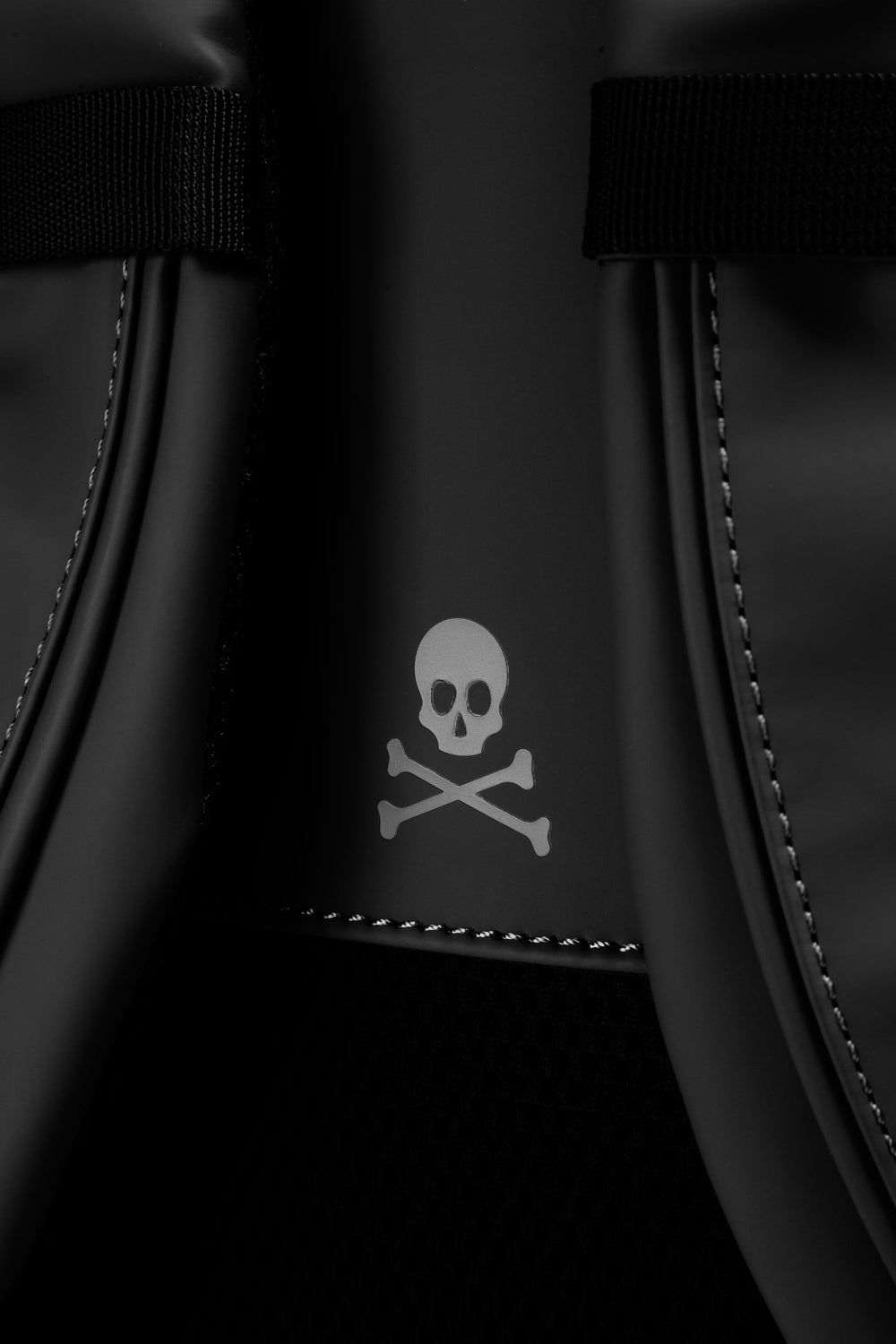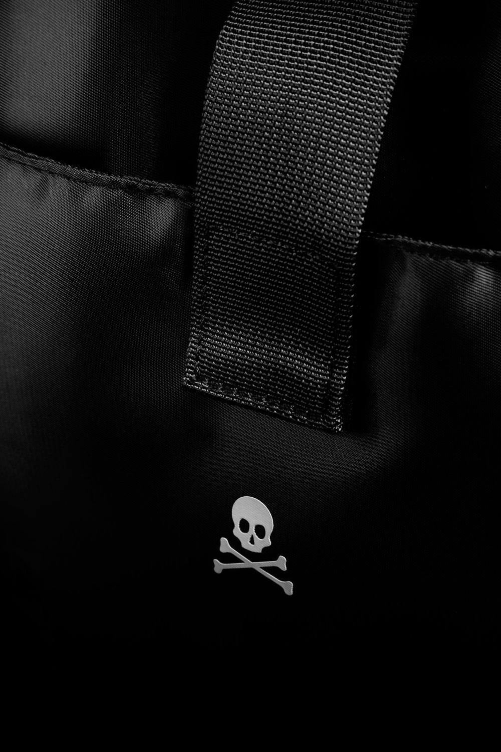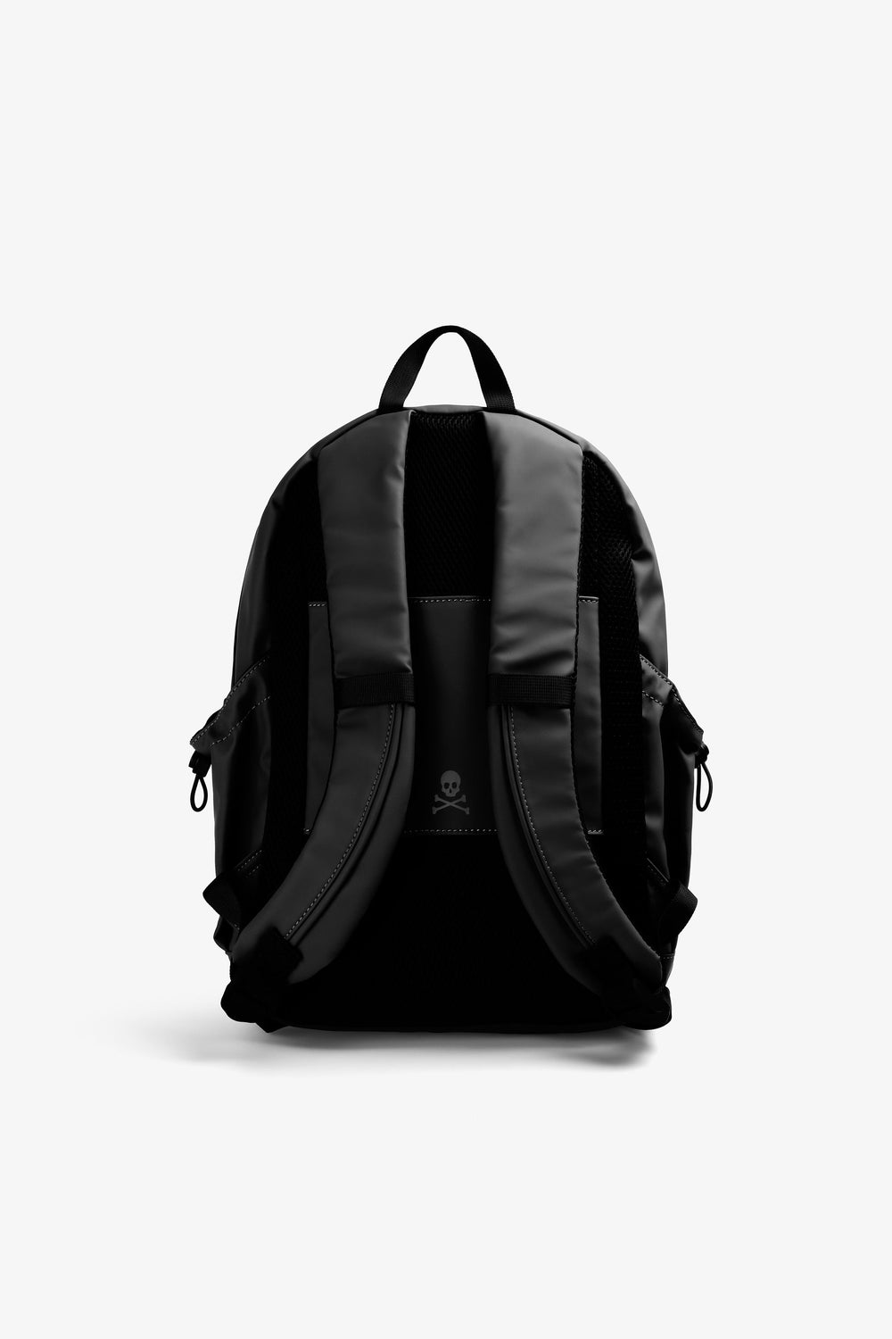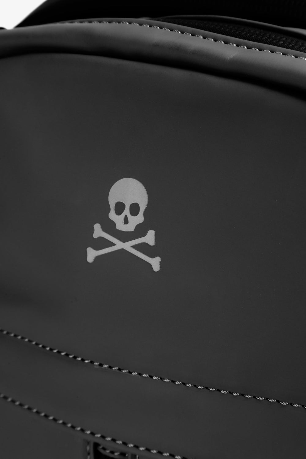 Backpack made of a technical fabric. Double exterior front pocket. Adjustable buckle fastening. Skull detail on front and back print. Top handle. Side and back fastening adjustments. Padded reinforced back.