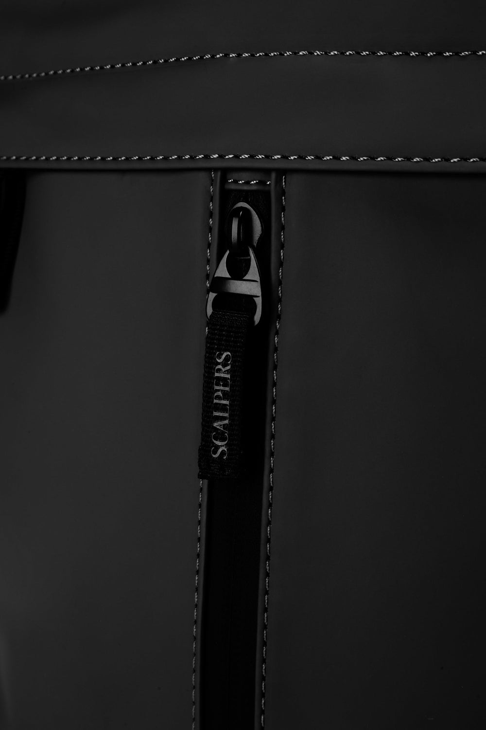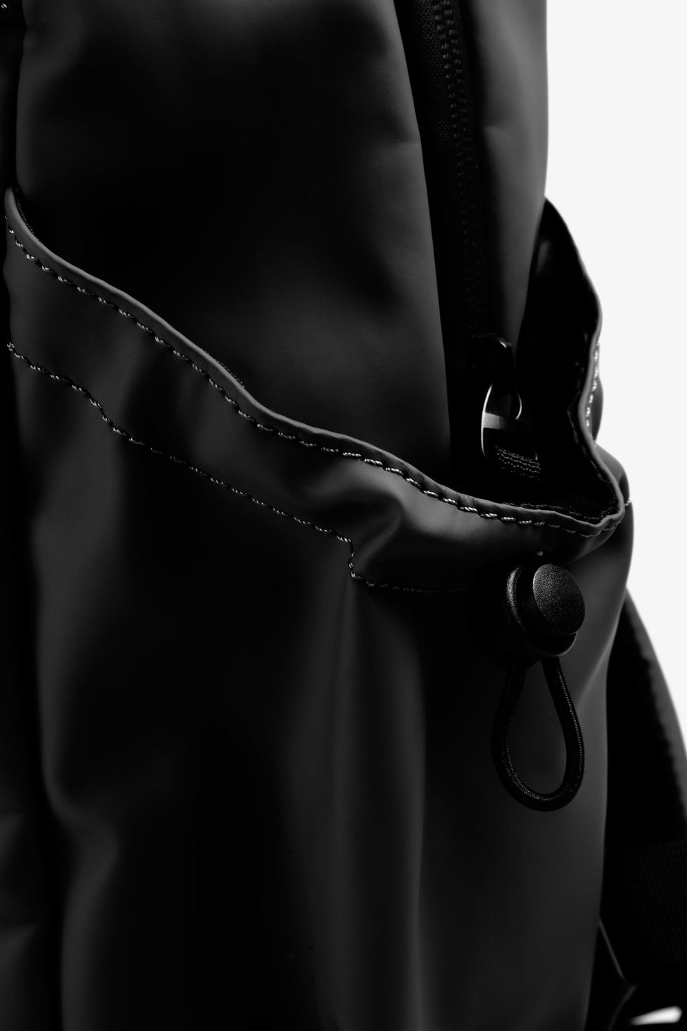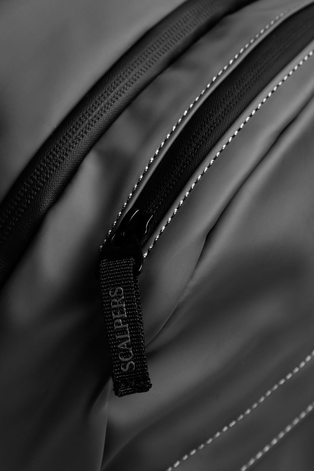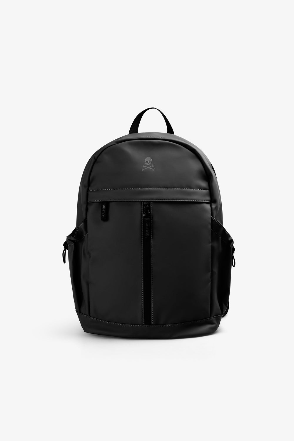 Backpack made of a technical fabric. Double exterior front pocket. Adjustable buckle fastening. Skull detail on front and back print. Top handle. Side and back fastening adjustments. Padded reinforced back.