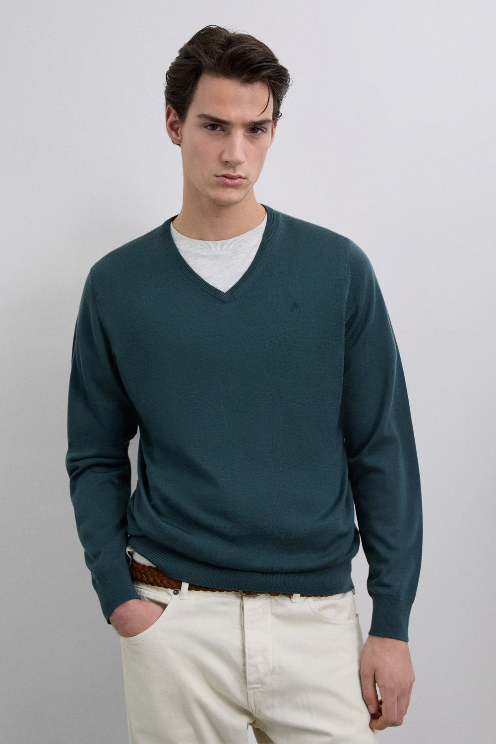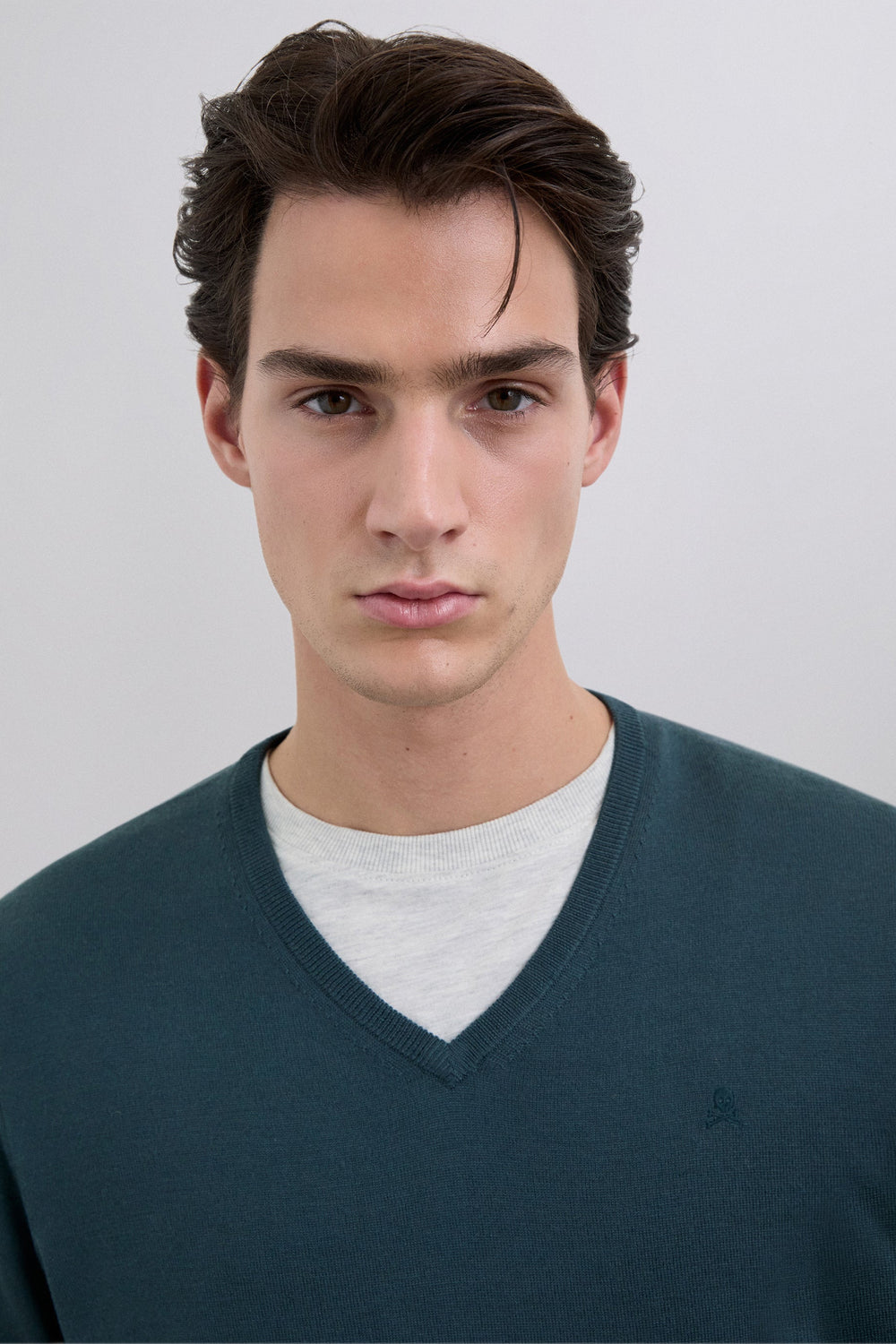 Sweater made of 100% wool. Regular Fit. V-neck. Long sleeves. Matching embroidered skull detail on the chest. Ribbed trim.