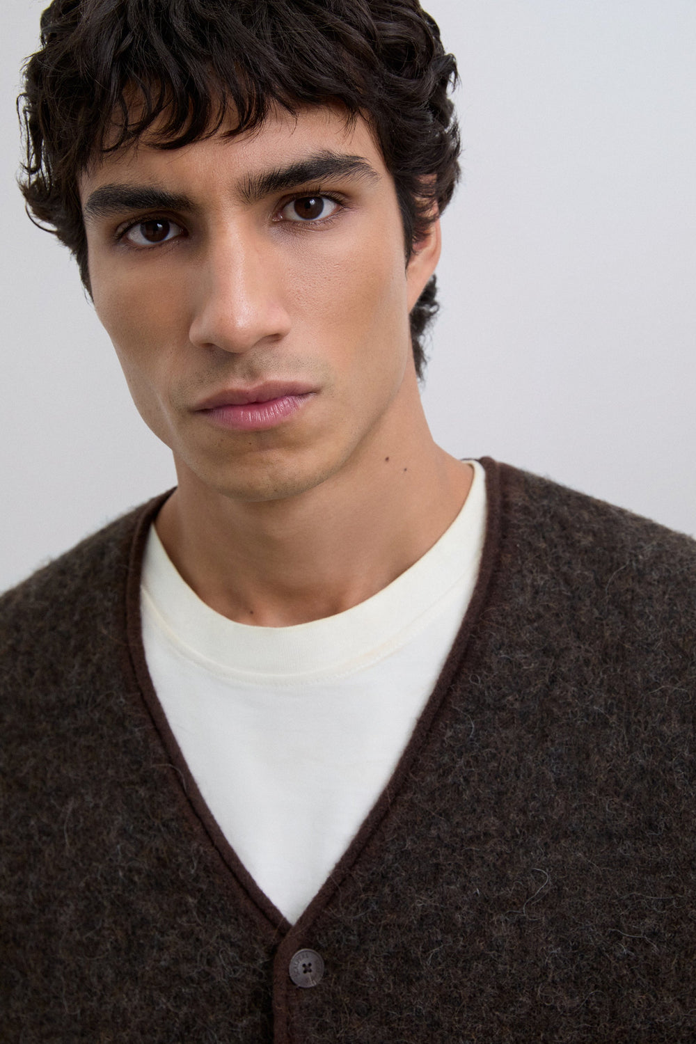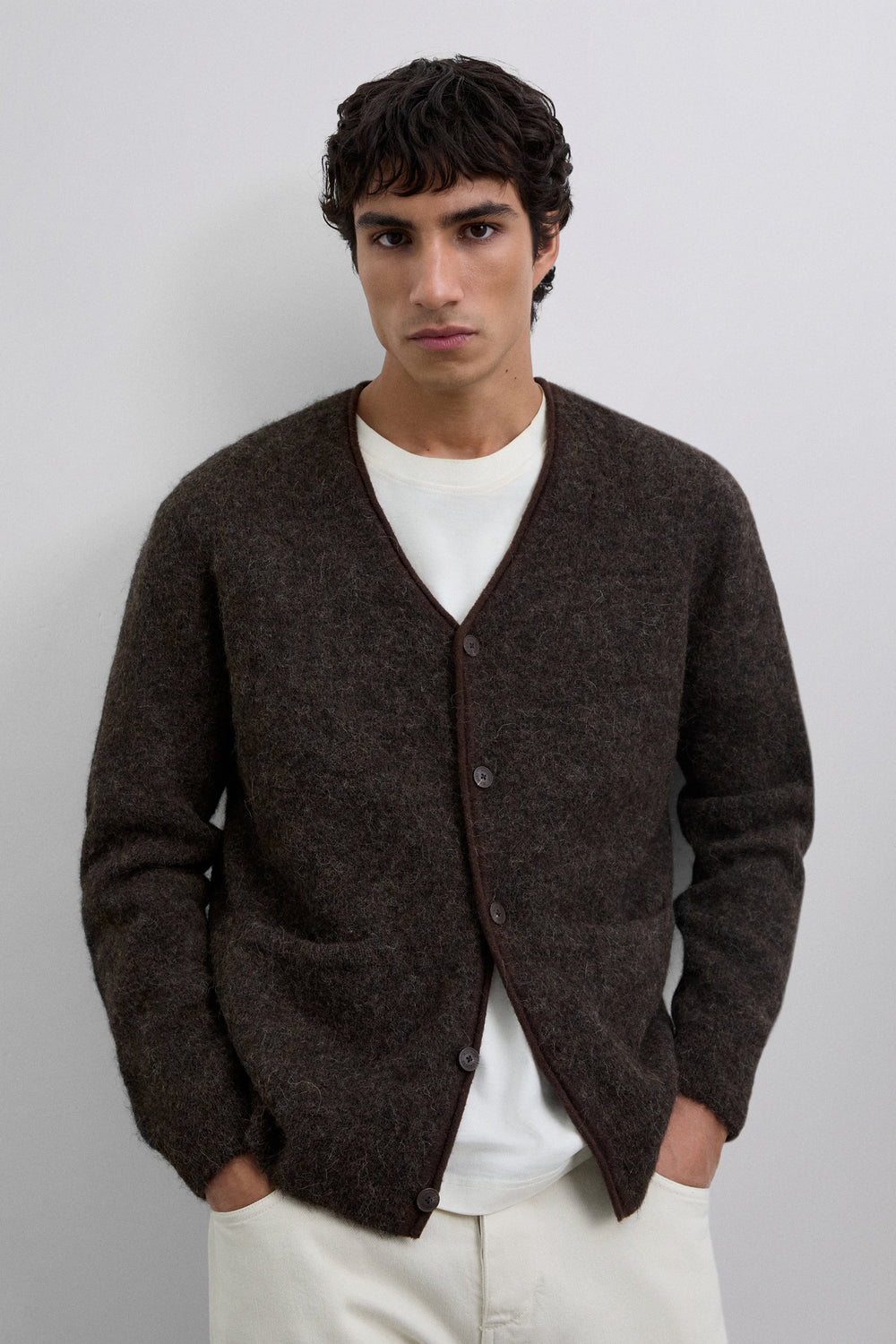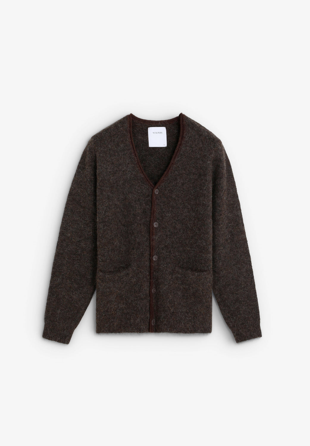 Alpaca cardigan. V-neck. Long sleeves. Front button fastening. Two front pockets. Logo label detail on inside.
