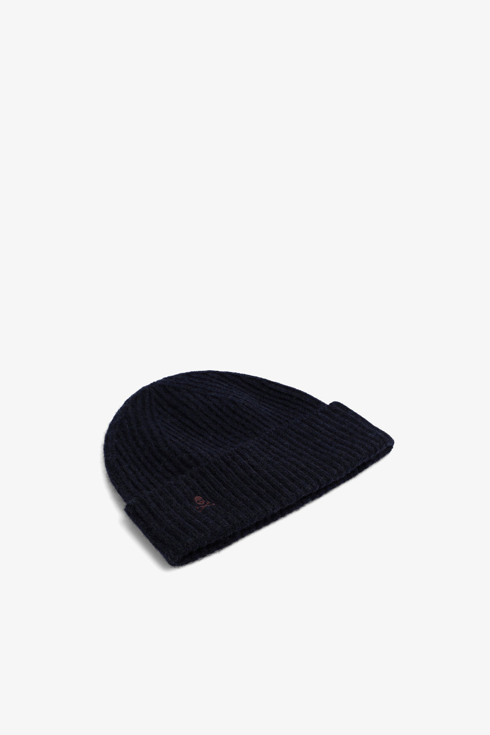 Knitted hat made of a wool and cashmere blend. Finished with a cuff. Contrast logo embroidery on cuff.