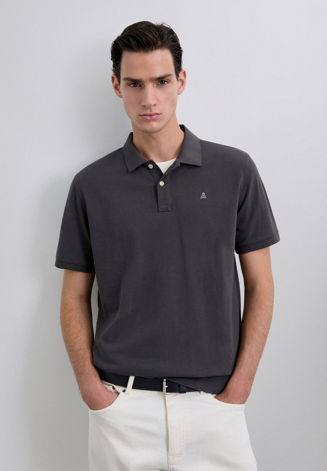 Pique polo shirt made of 100% organic cotton. Short sleeve. Regular fit. Two-button placket. Ribbed collar and cuffs. Contrast embroidered skull on the chest.
