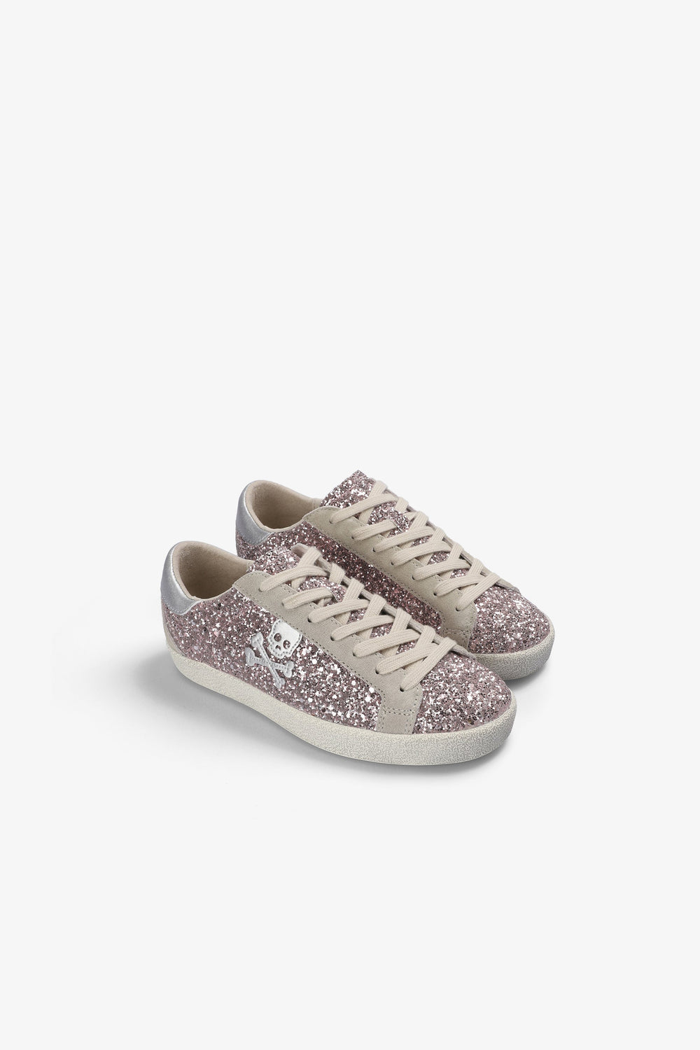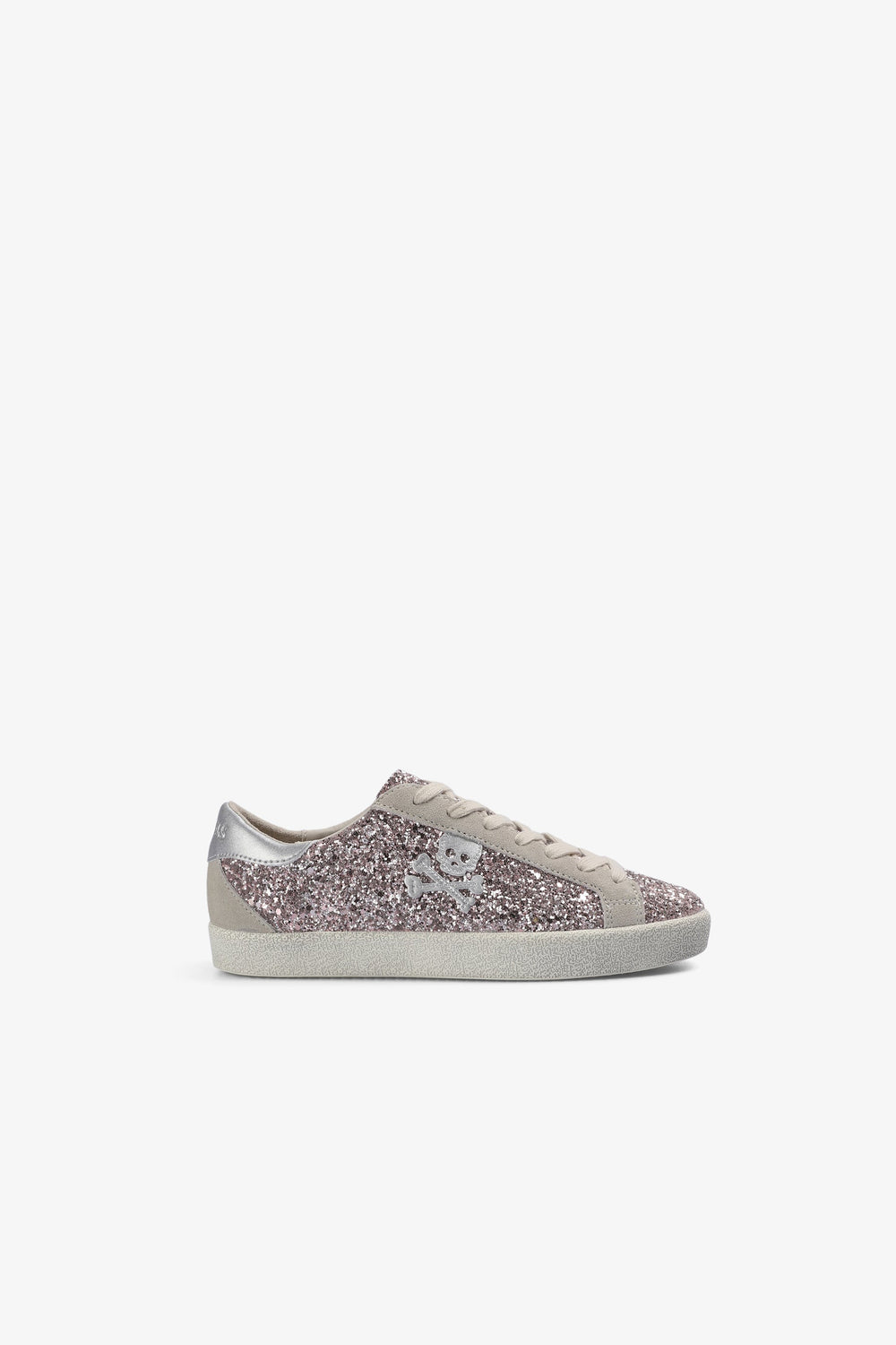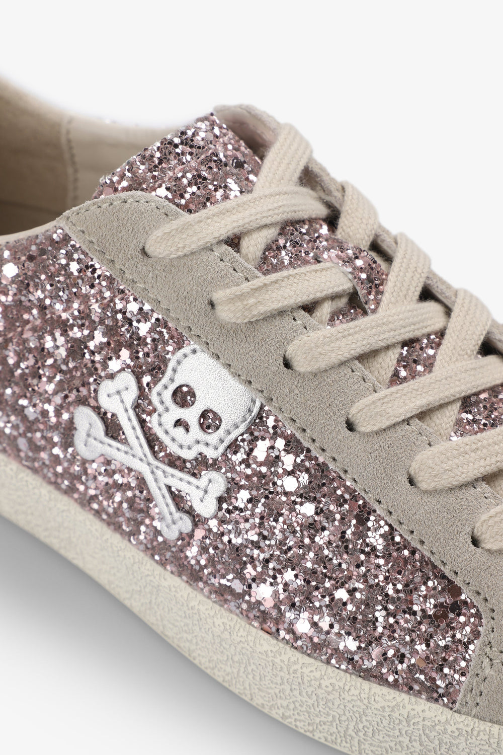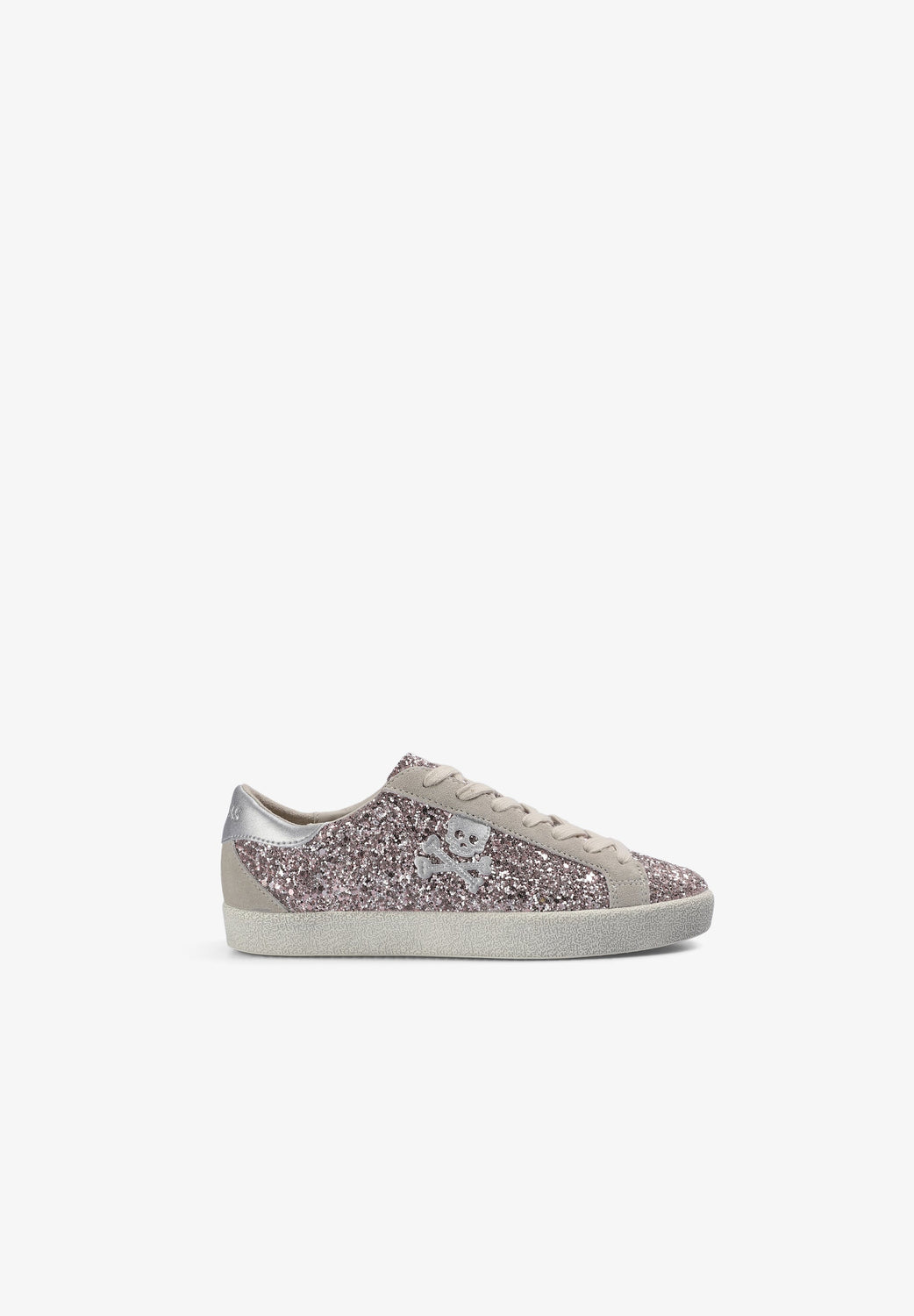 Glitter sneakers. Lace-up fastening. Worn effect rubber sole. Contrast skull on side. Contrasting heel with matching logo.