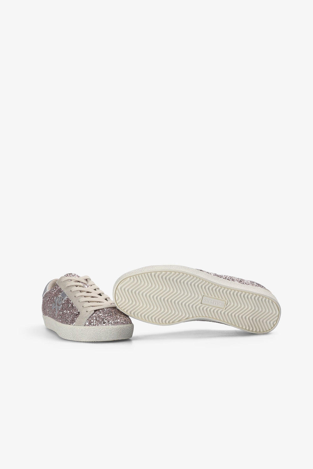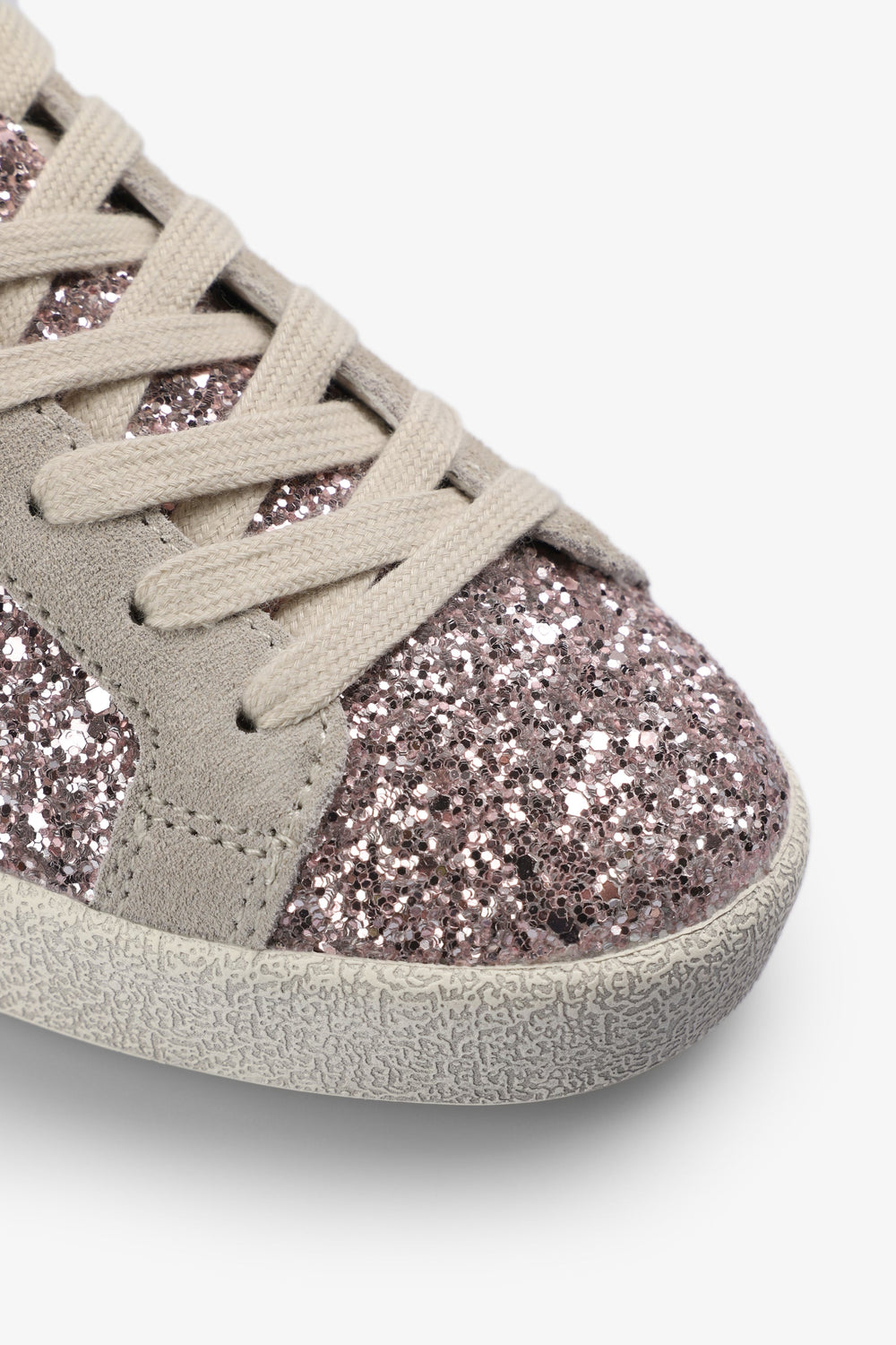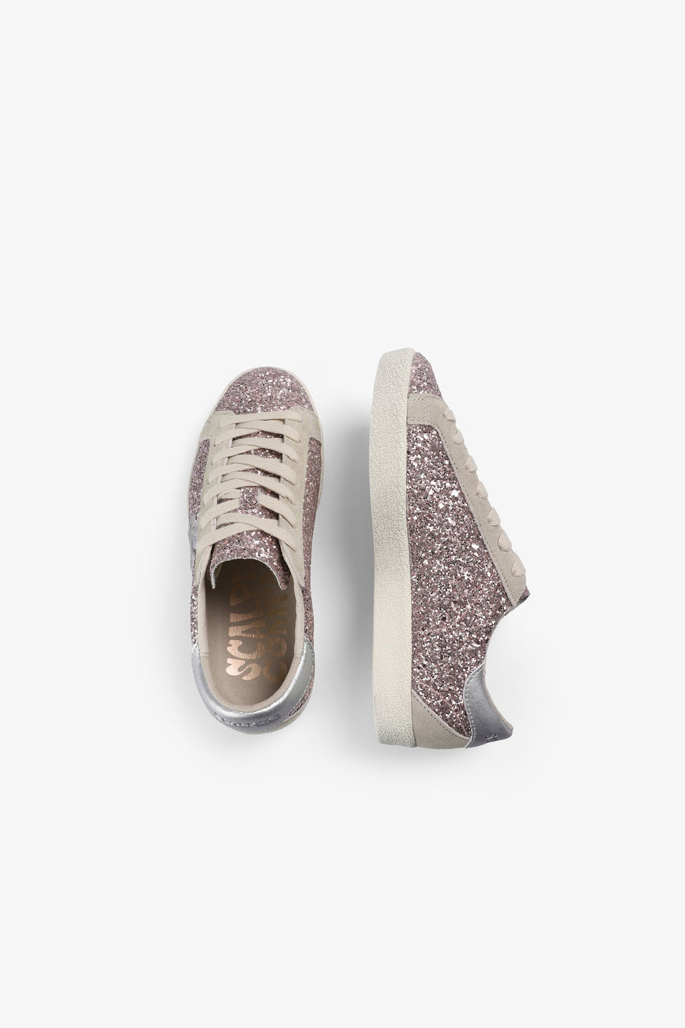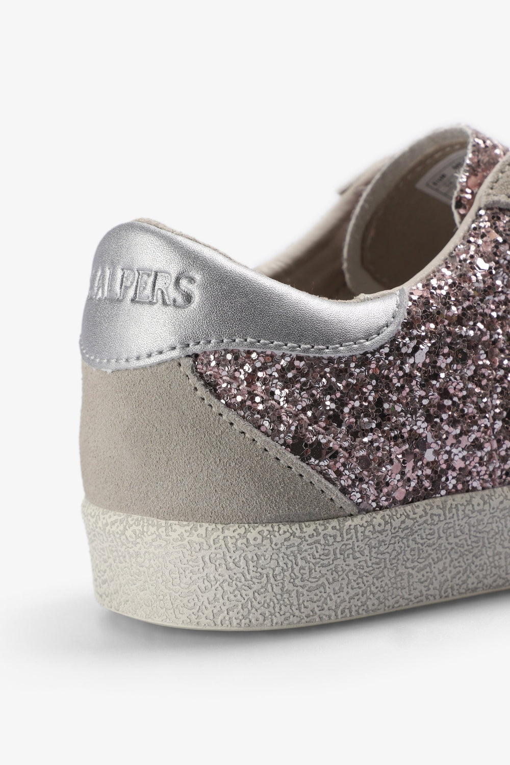 Glitter sneakers. Lace-up fastening. Worn effect rubber sole. Contrast skull on side. Contrasting heel with matching logo.