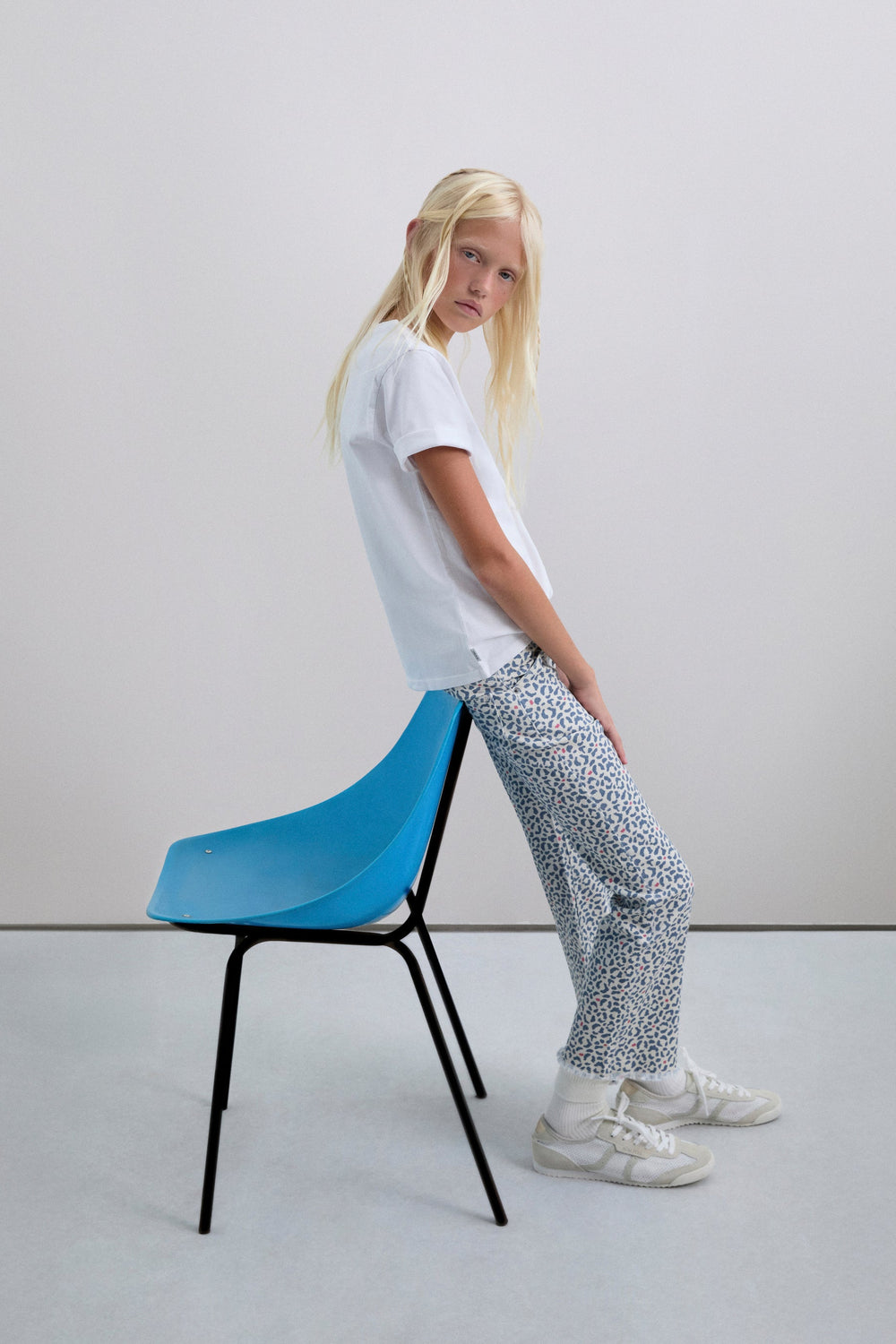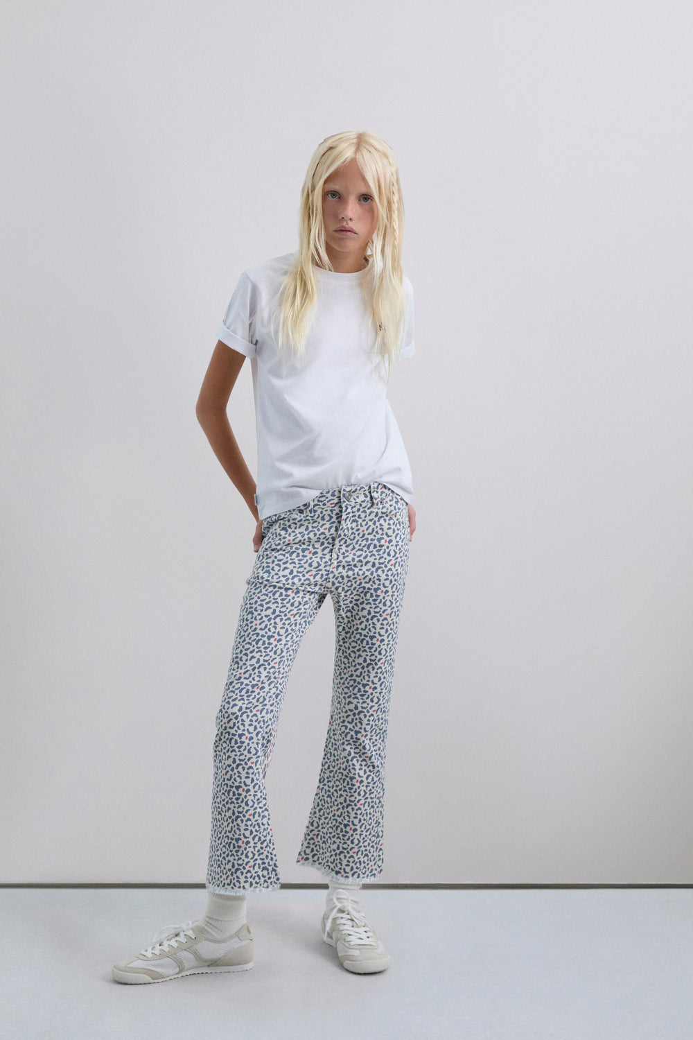 Denim jeans. Two front pockets. Two back pockets with skull and logo label detail. Frayed motif on the hems. Belt loops at the waist. Button and zip fastening. Animal print.