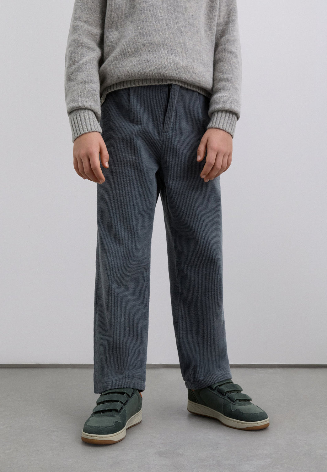 Straight corduroy trousers made of a slightly stretch cotton blend fabric Button closure. Front and back slanted pockets. Back label detail with logo.