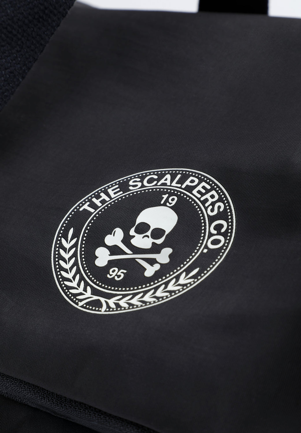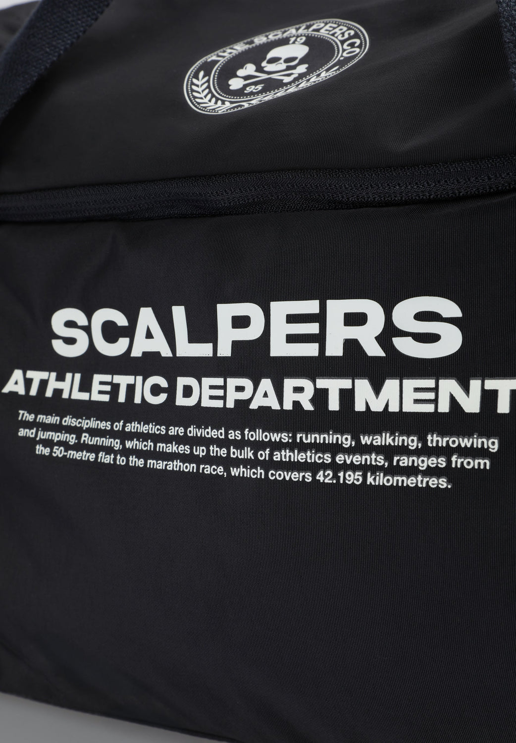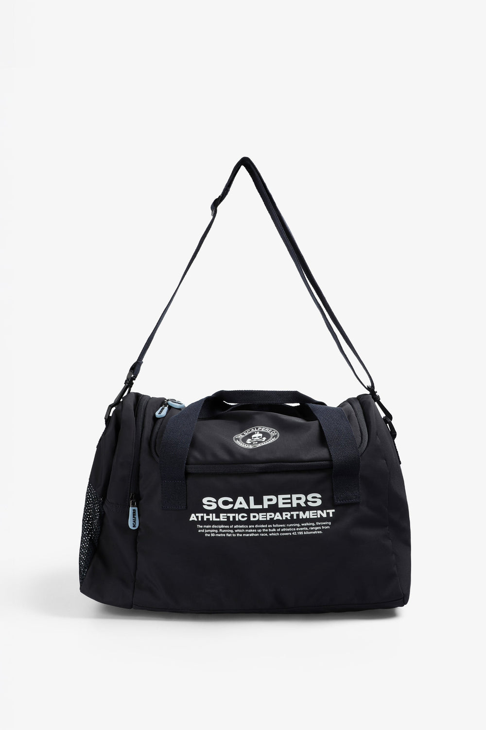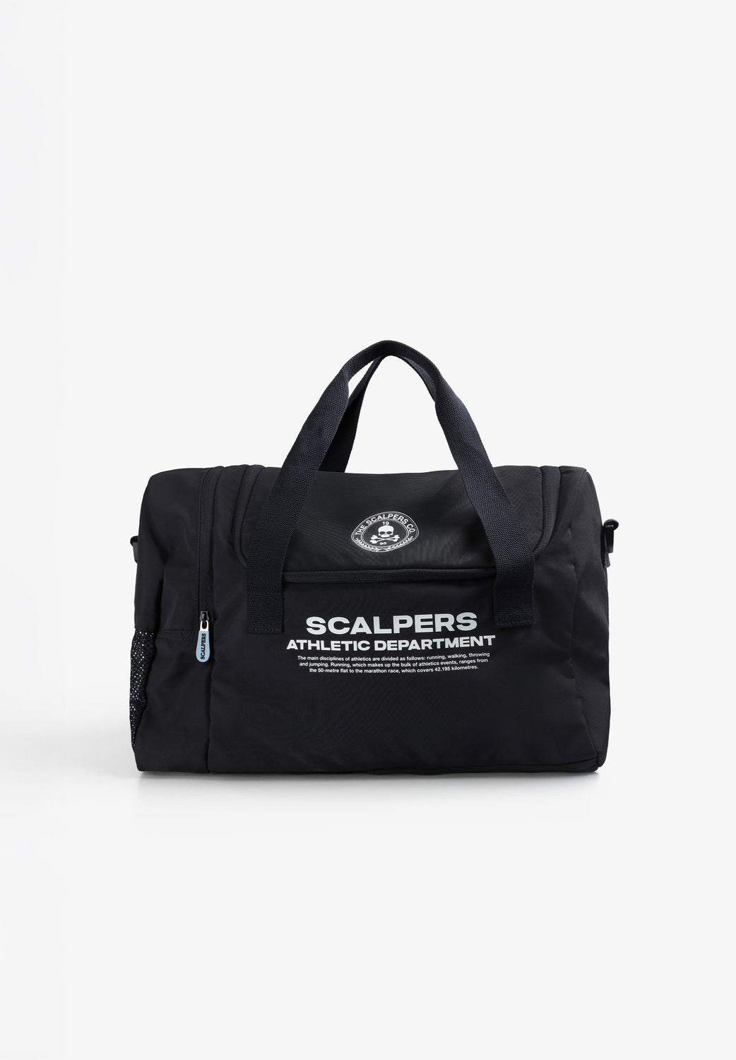 Bag made of a technical fabric. Main compartment with zip closure. One side pocket with zip. Short main shoulder strap and long detachable strap. Front logo and skull print. Logo detail on zip.