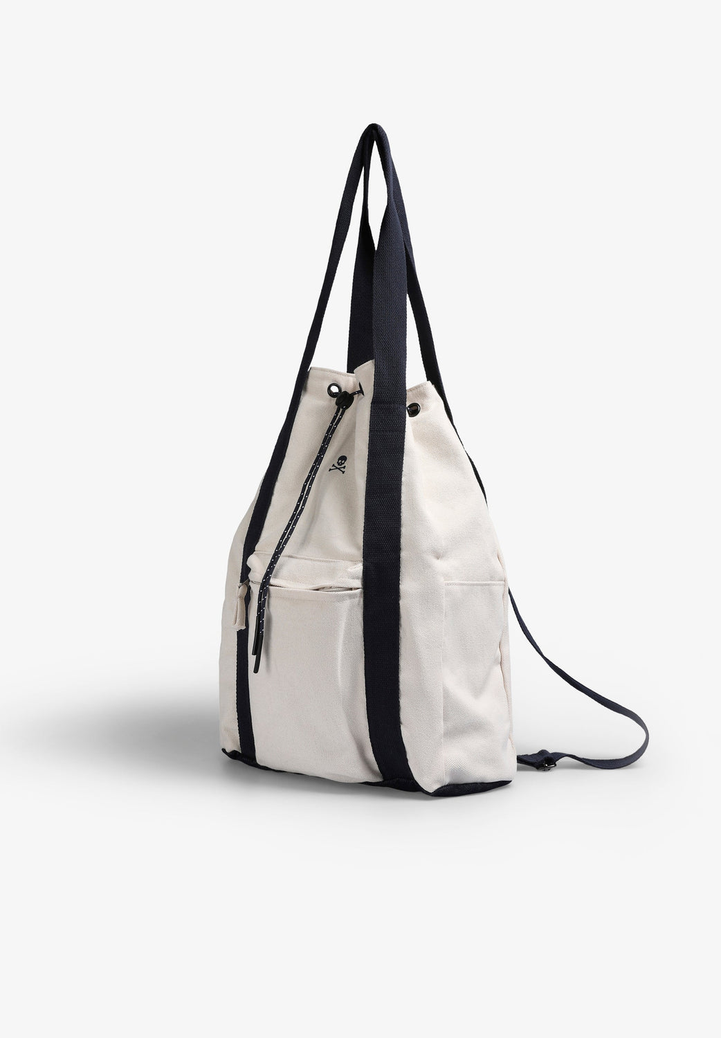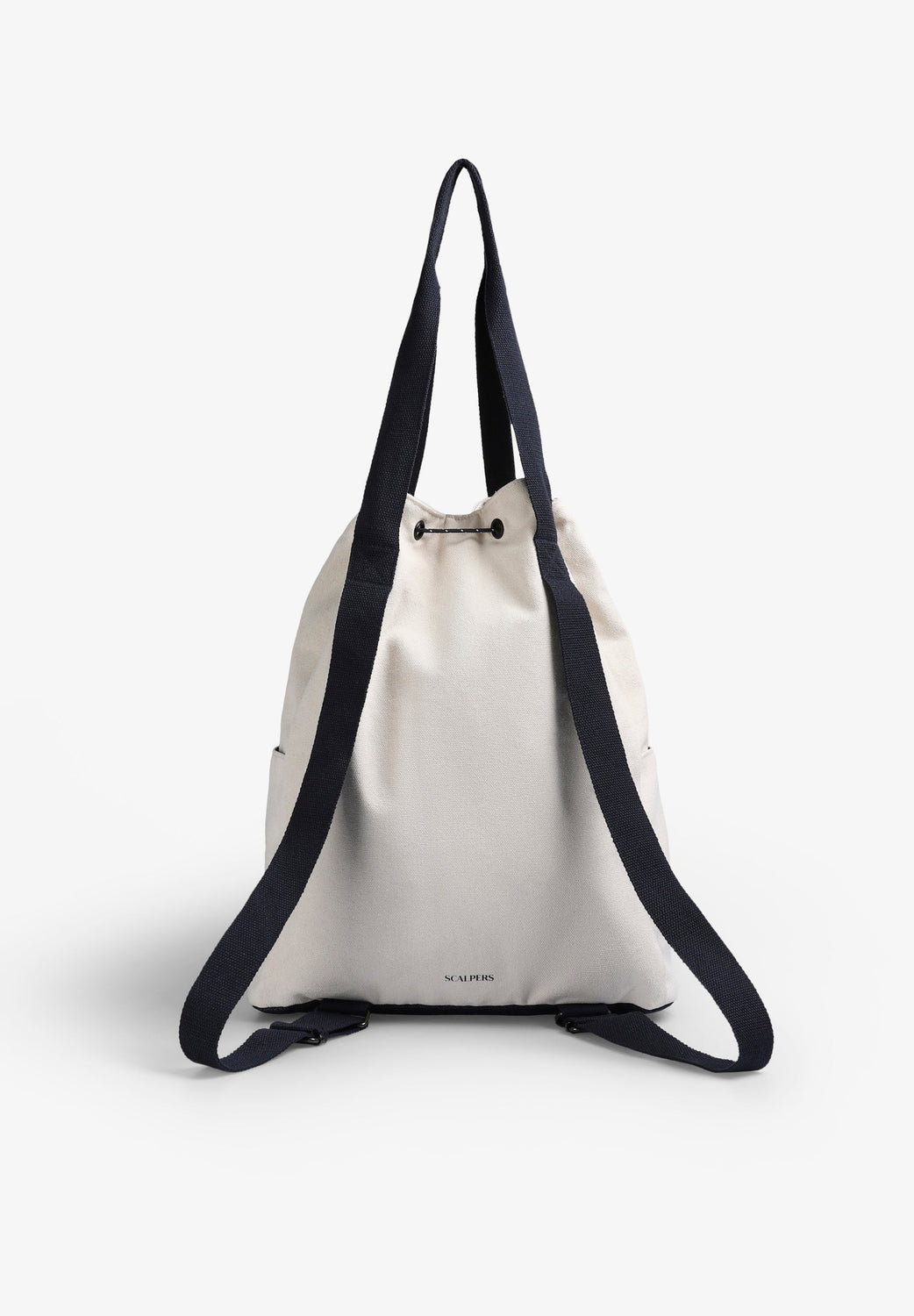 Backpack made of 100% cotton. Lined. Front pocket with zip fastening. Two side compartments. Shoulder straps. Embroidered logo detail on the front. Main fastening with adjustable cords.