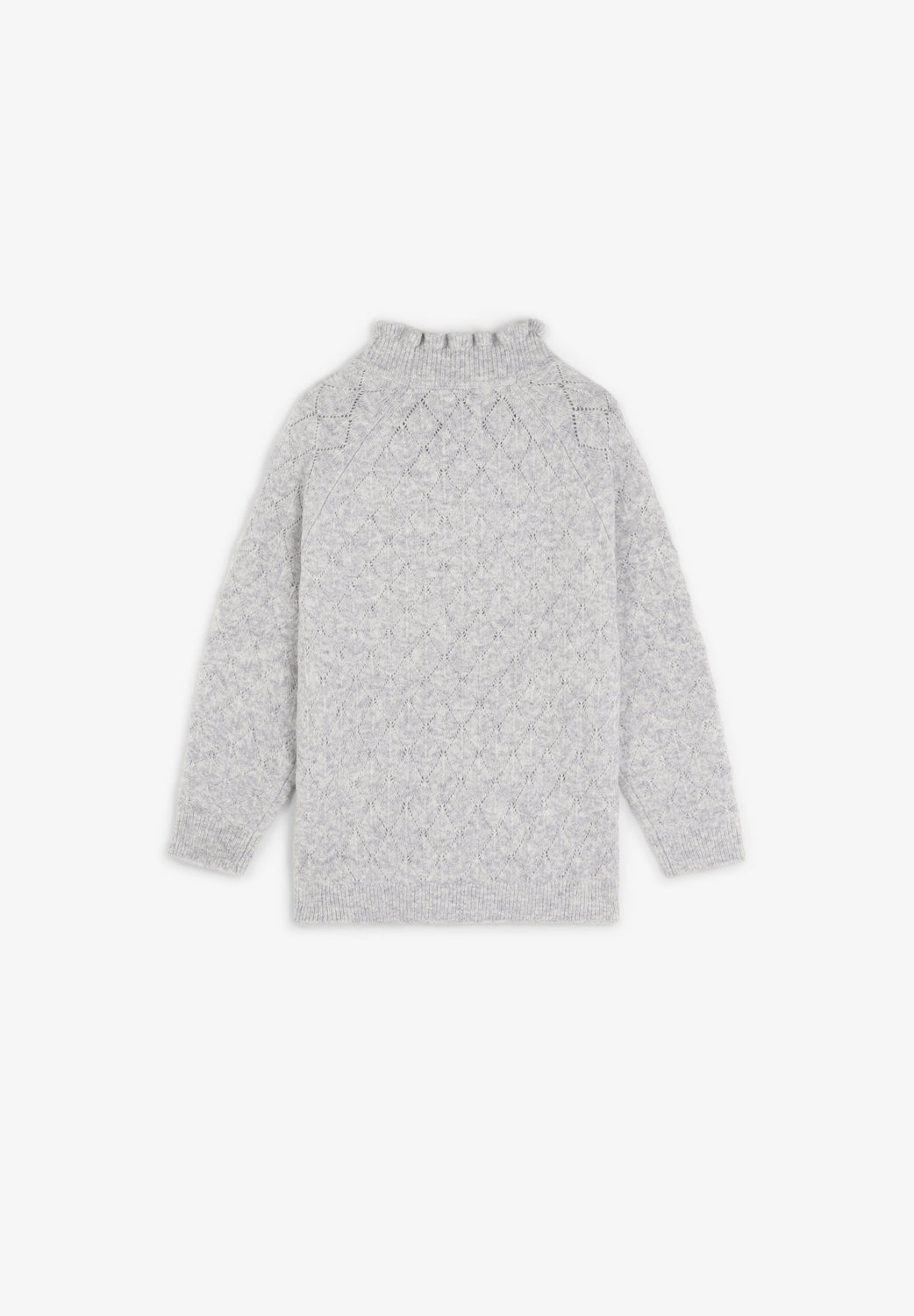 Knit sweater made of a merino wool blend. High neck with ruffles. Long sleeves with ribbed cuffs. Perforated diamond pattern.