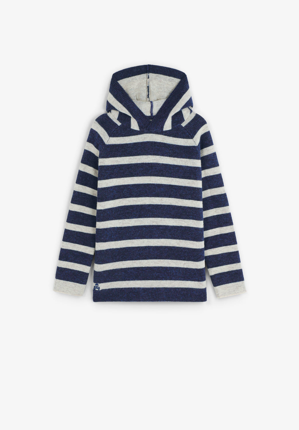 Knitted sweater with hood. Stripe print. Long sleeves. Contrast embroidered skull on the waistband.