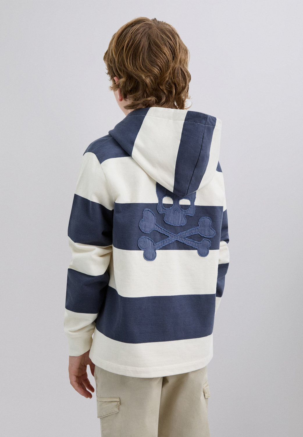 Sweatshirt with adjustable drawstring hood, made of 100% BCI cotton. Stripe print. Embroidered motif on chest and skull on back. Half neck with front button.