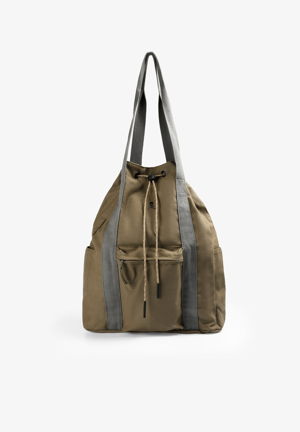 Bag made of 100% cotton. Double strap. Adjustable zip, inner pocket and outside cargo-style pocket. Contrast skull and logo detail: