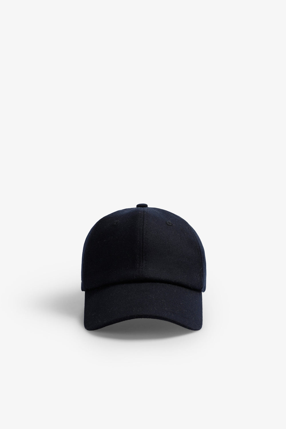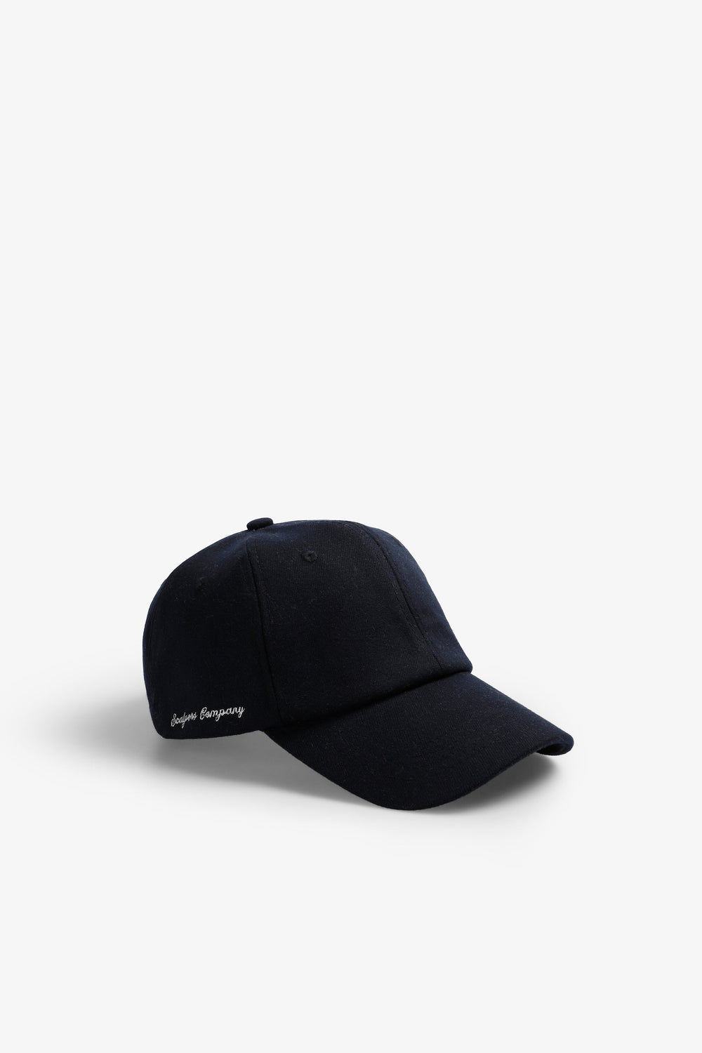 Wool effect cap with adjustable back closure and contrast embroidered lettering detail on the side.