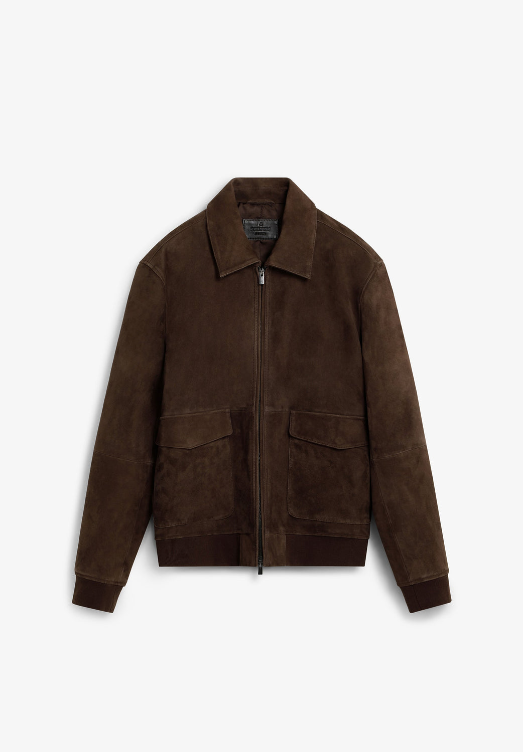 Jacket made of 100% leather. Front zip fastening. Ribbed cuffs and hem. Two front pockets with flap fastening.