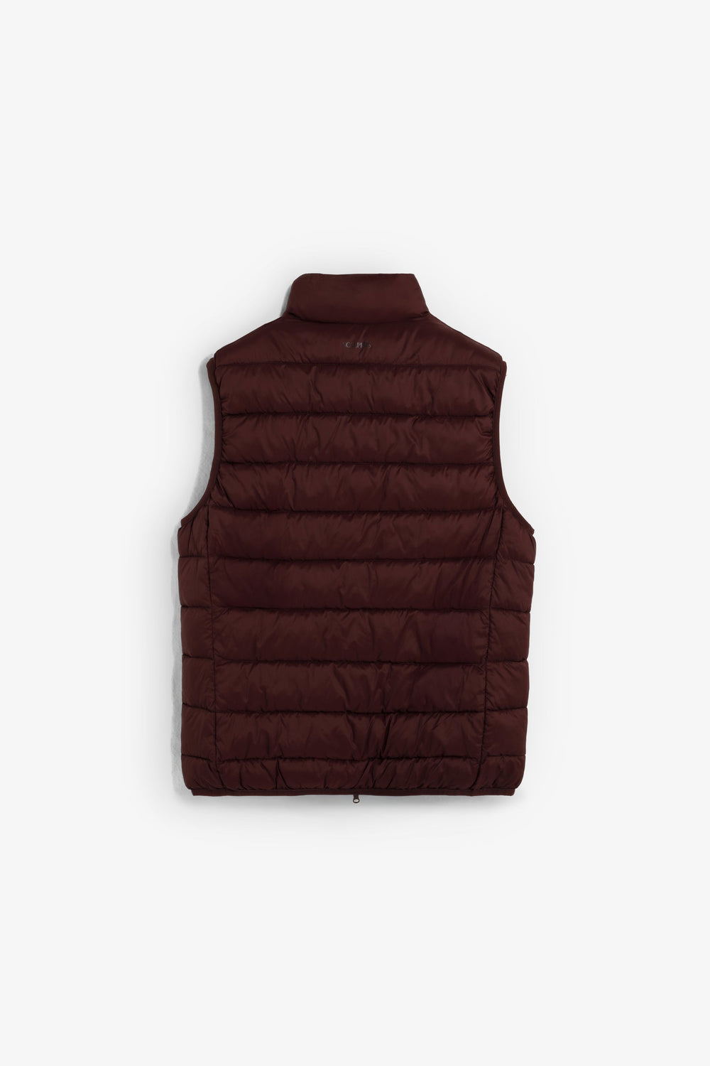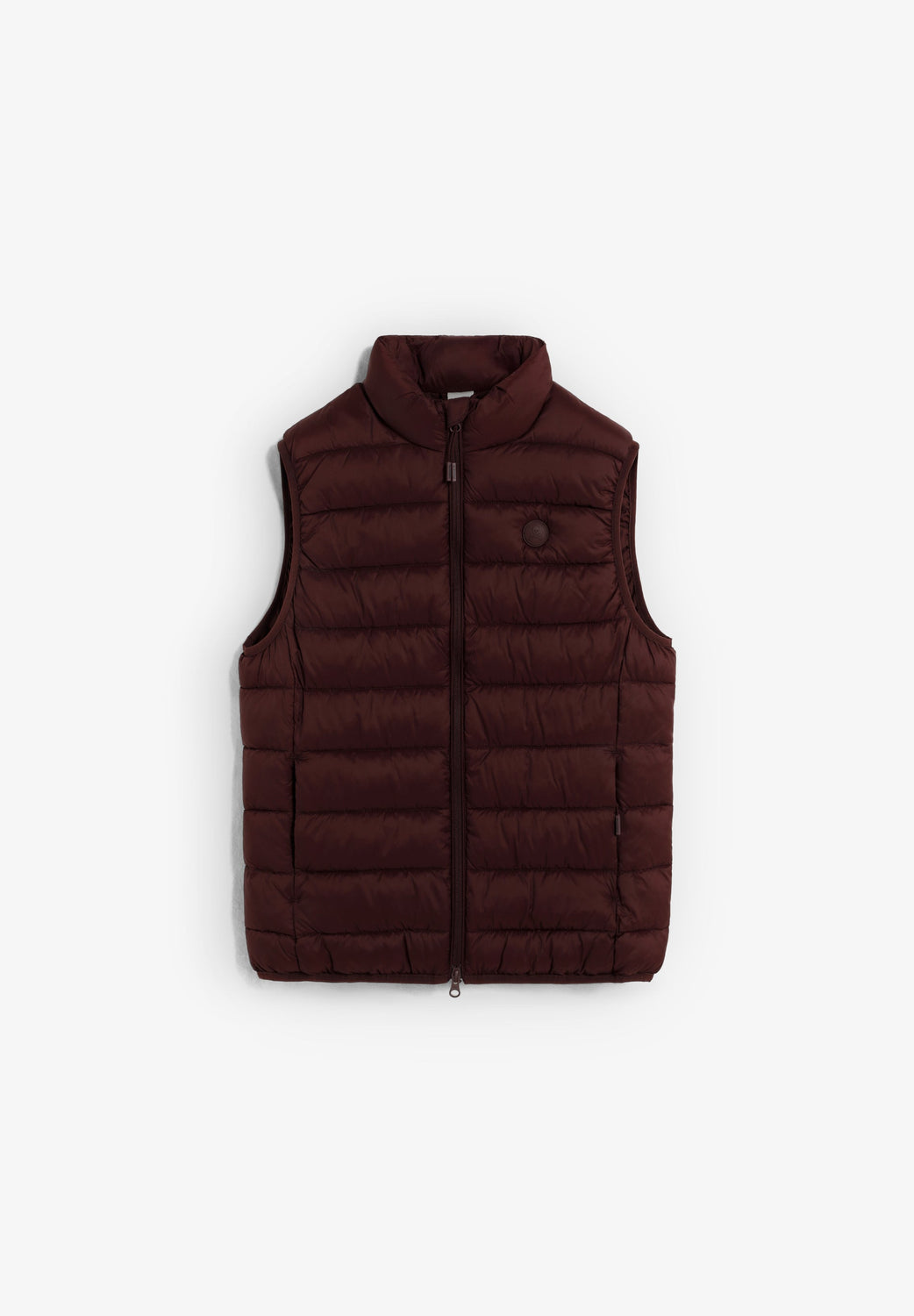 Puffer vest made of cotton and recycled polyester fabric. Slim fit. High collar. Double slider zip fastening. Zip pockets and an inner pocket. Logo detail on the chest