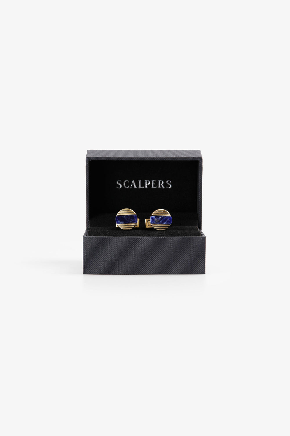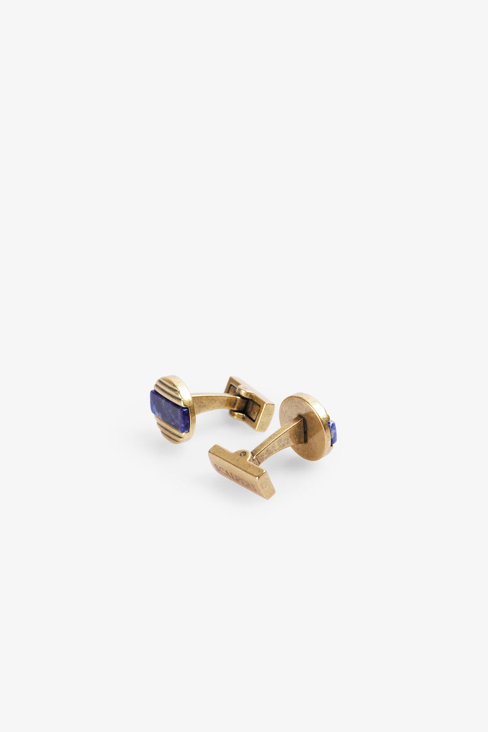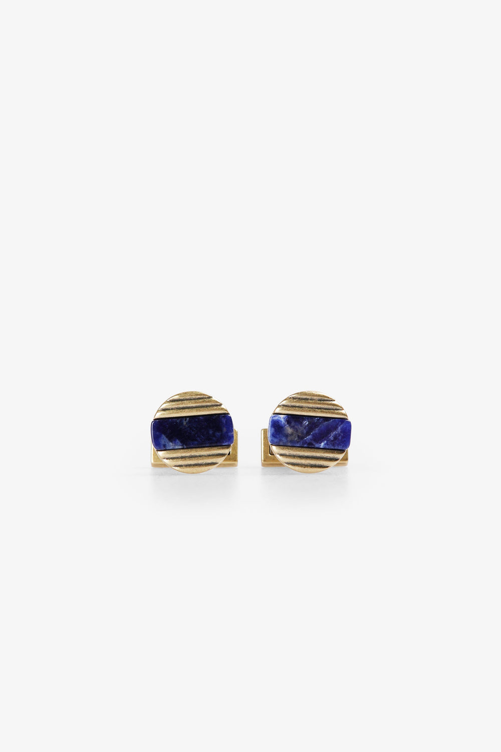 Round metal cufflinks with natural stone. Logo detail on the back.