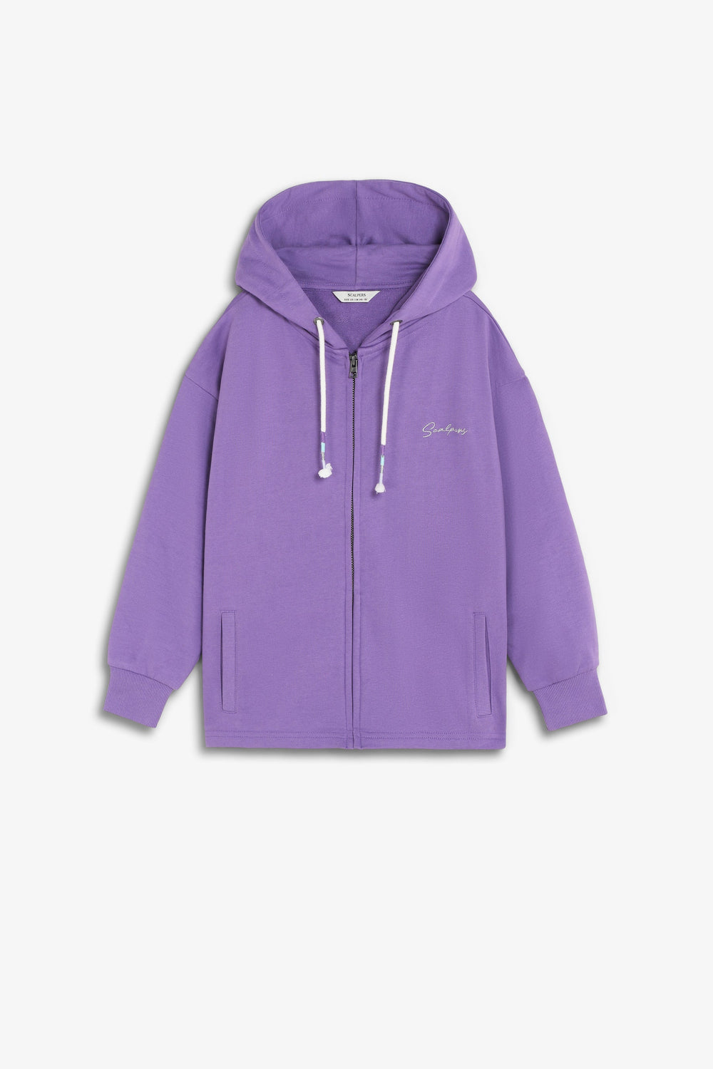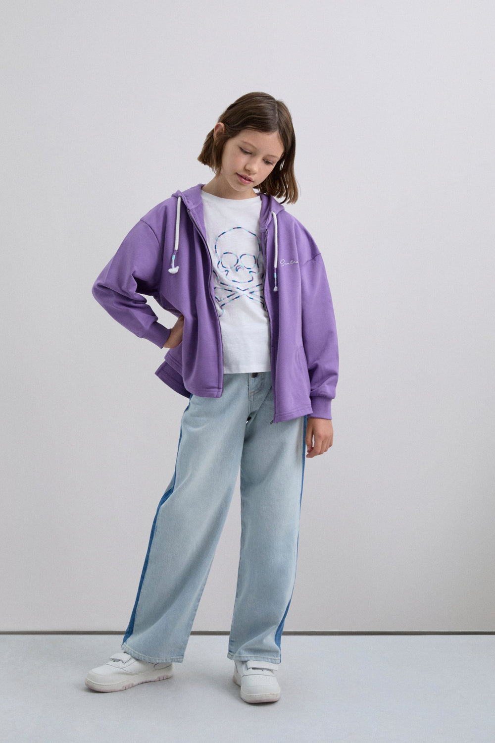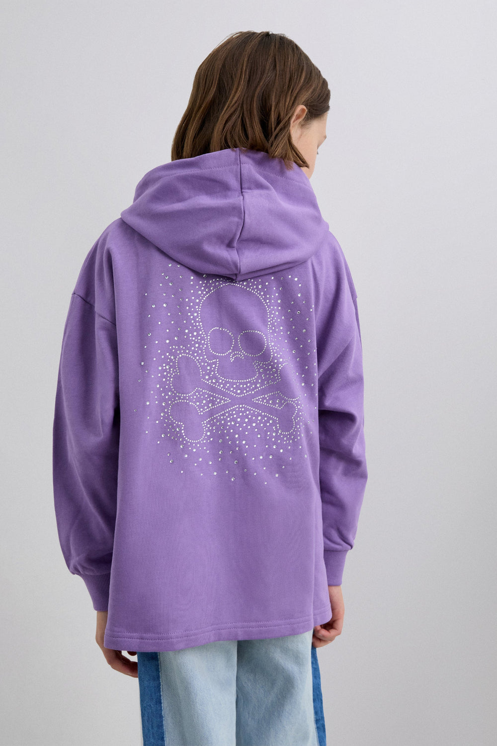 Sweatshirt with an adjustable drawstring hood. Front zip fastening. Long sleeves with ribbed trims. Embroidered logo on chest and studded skull on back.