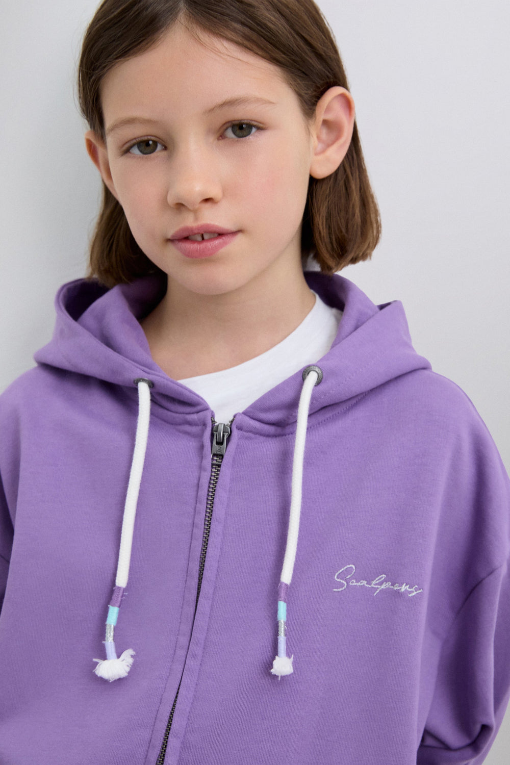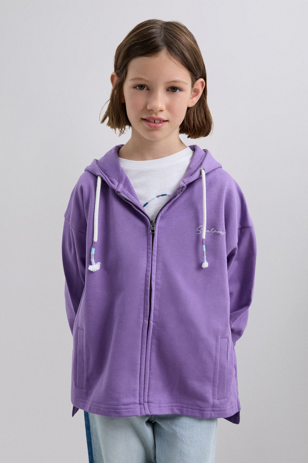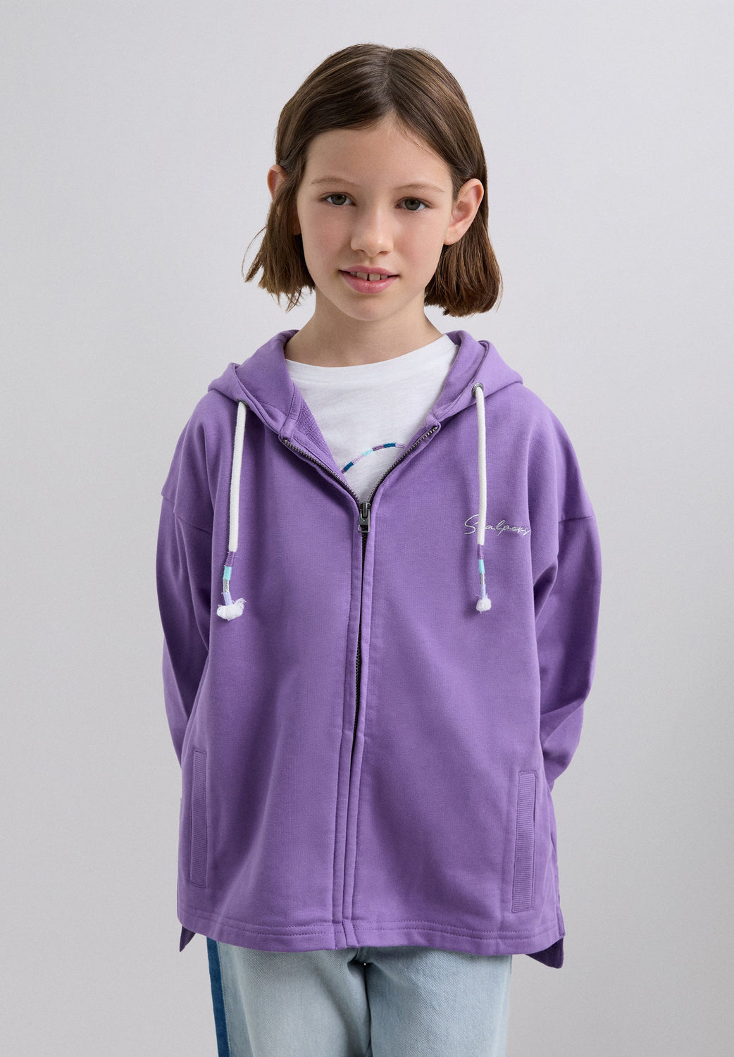 Sweatshirt with an adjustable drawstring hood. Front zip fastening. Long sleeves with ribbed trims. Embroidered logo on chest and studded skull on back.
