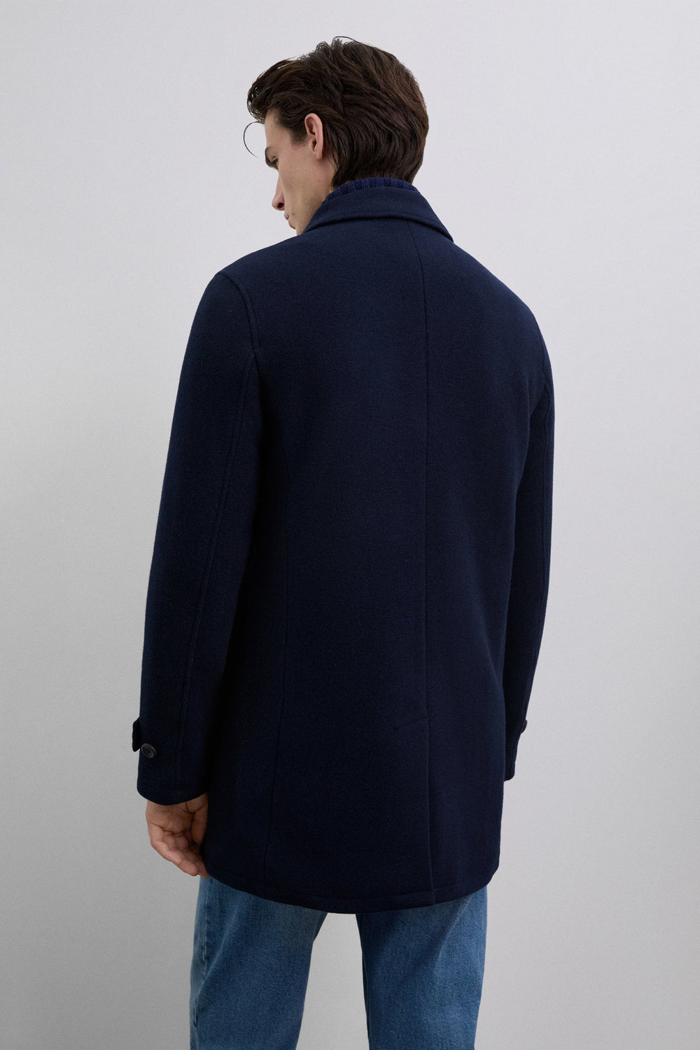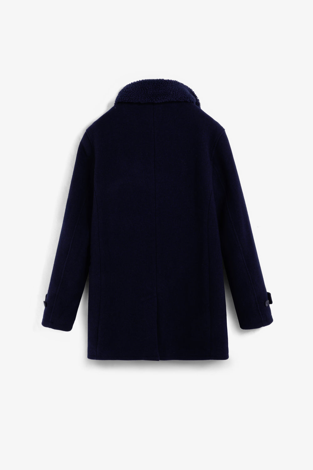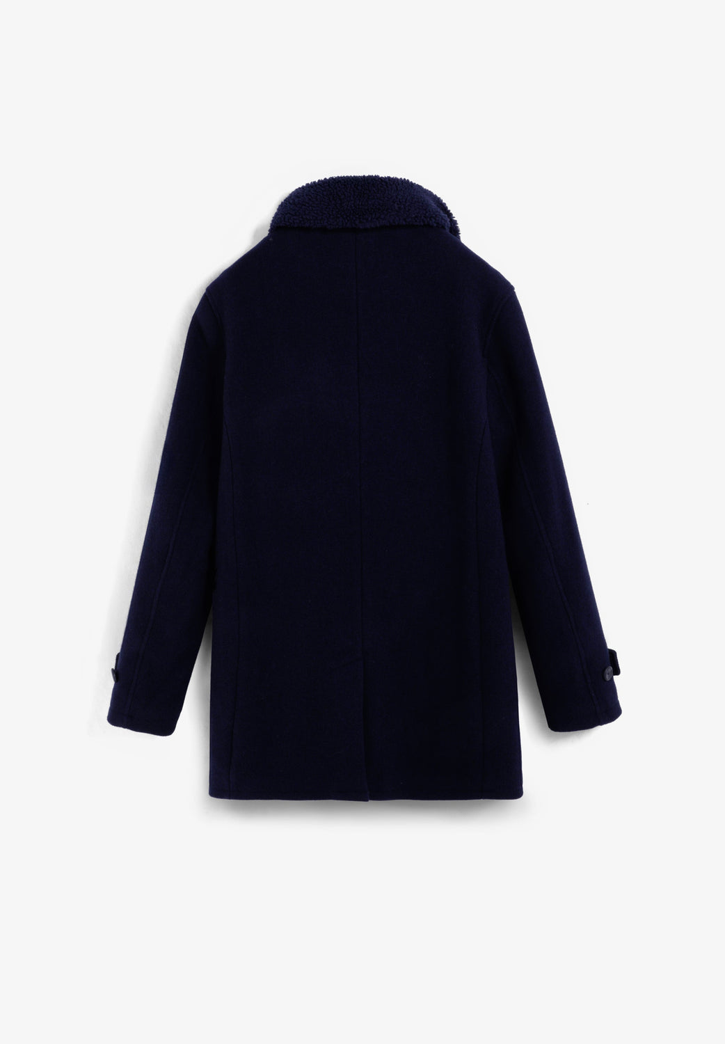 Double-breasted coat made of wool. Button fastening. Cuff detail with tab. Two large, slanted, front welt pockets. Inner pocket. Detachable detail on collar