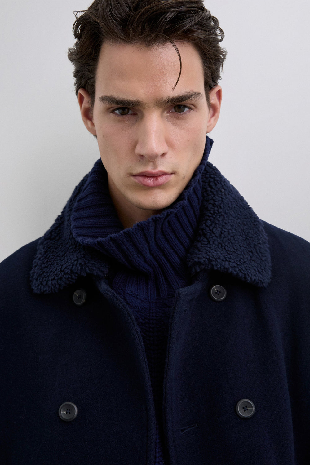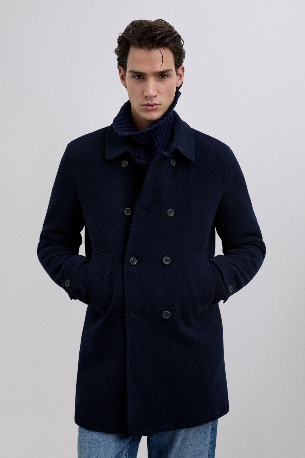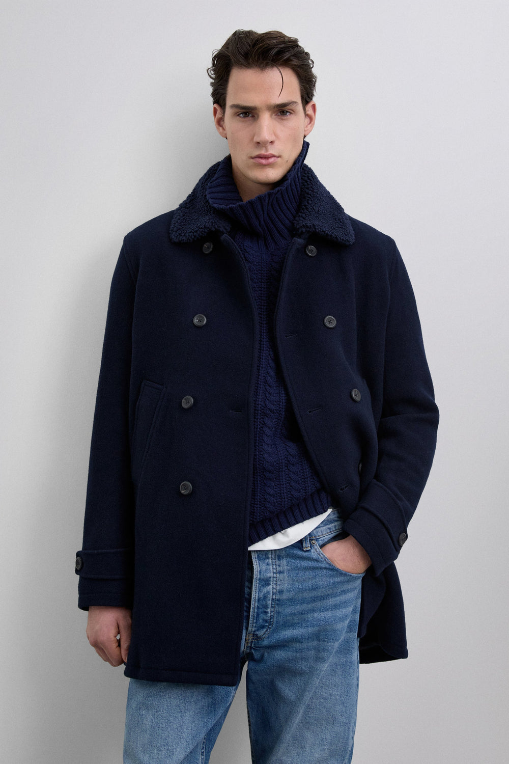 Double-breasted coat made of wool. Button fastening. Cuff detail with tab. Two large, slanted, front welt pockets. Inner pocket. Detachable detail on collar