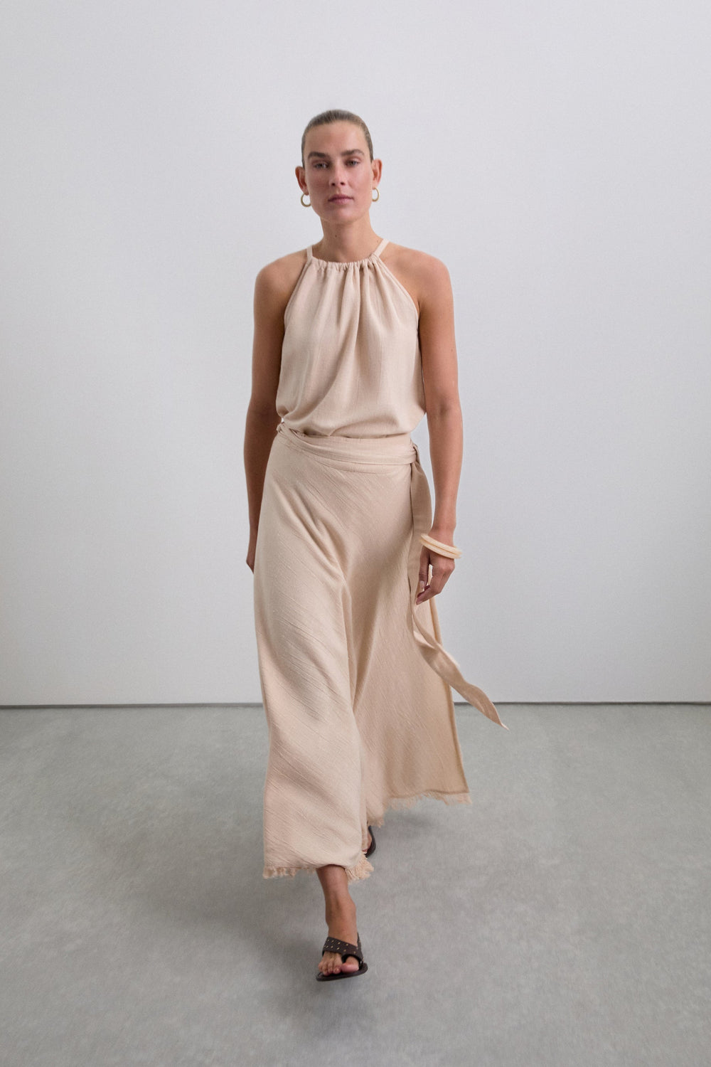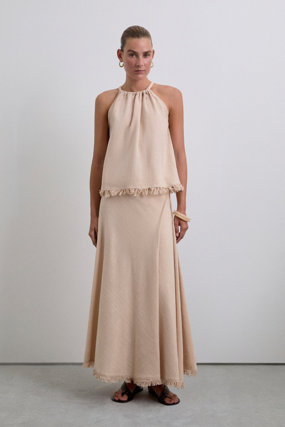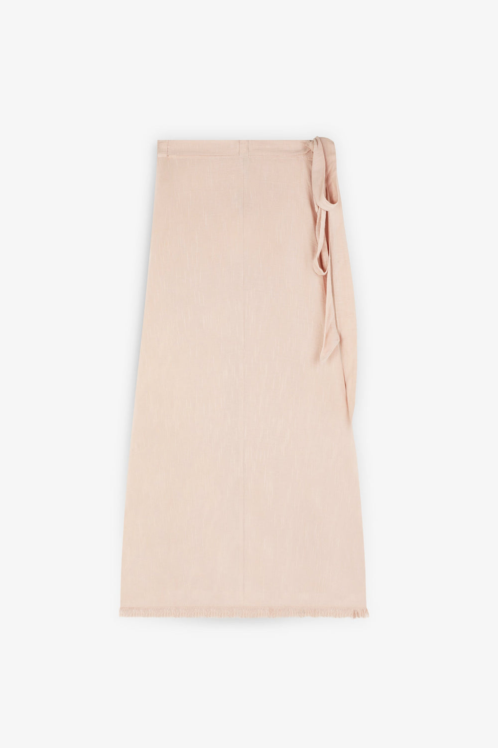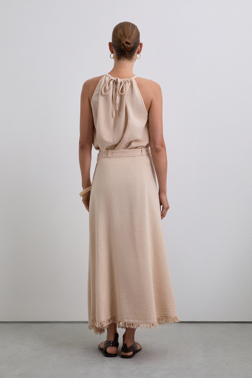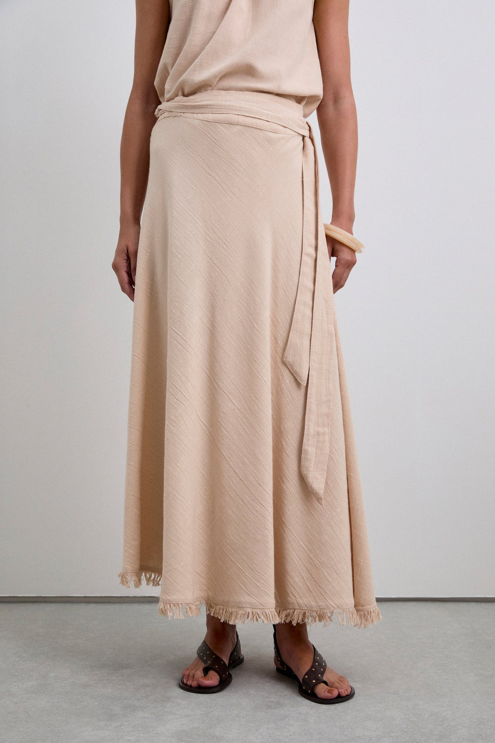 Cotton midi skirt with fringed hem detail. Adjustable side tie detail.
