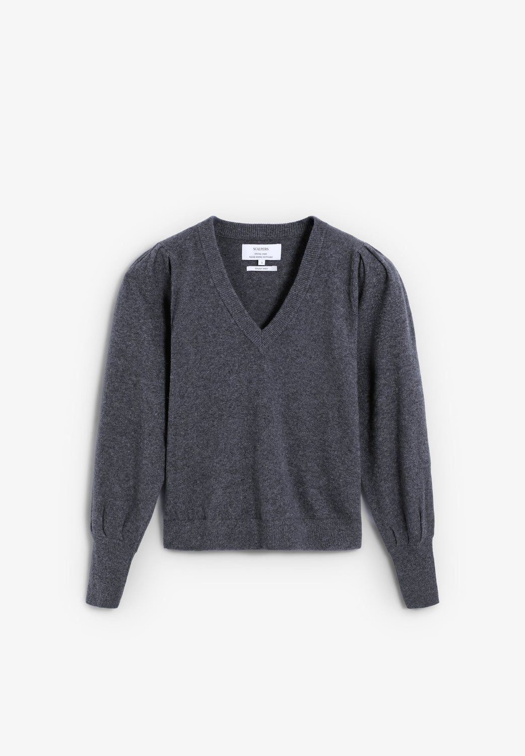 Sweater made of a wool blend with V-neck. Regular fit. Long, slightly puffed sleeves with ribbed cuffs. Matching embroidered skull detail on the back.