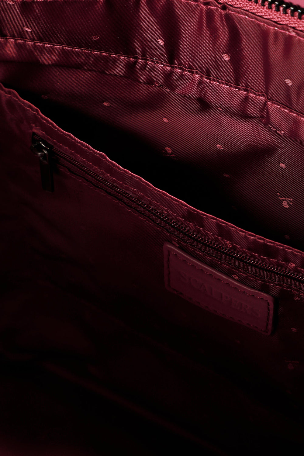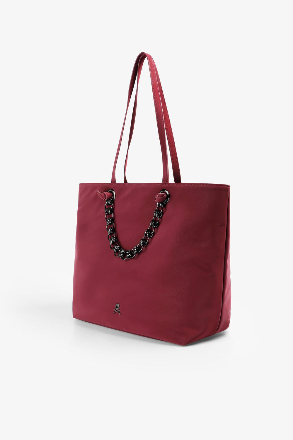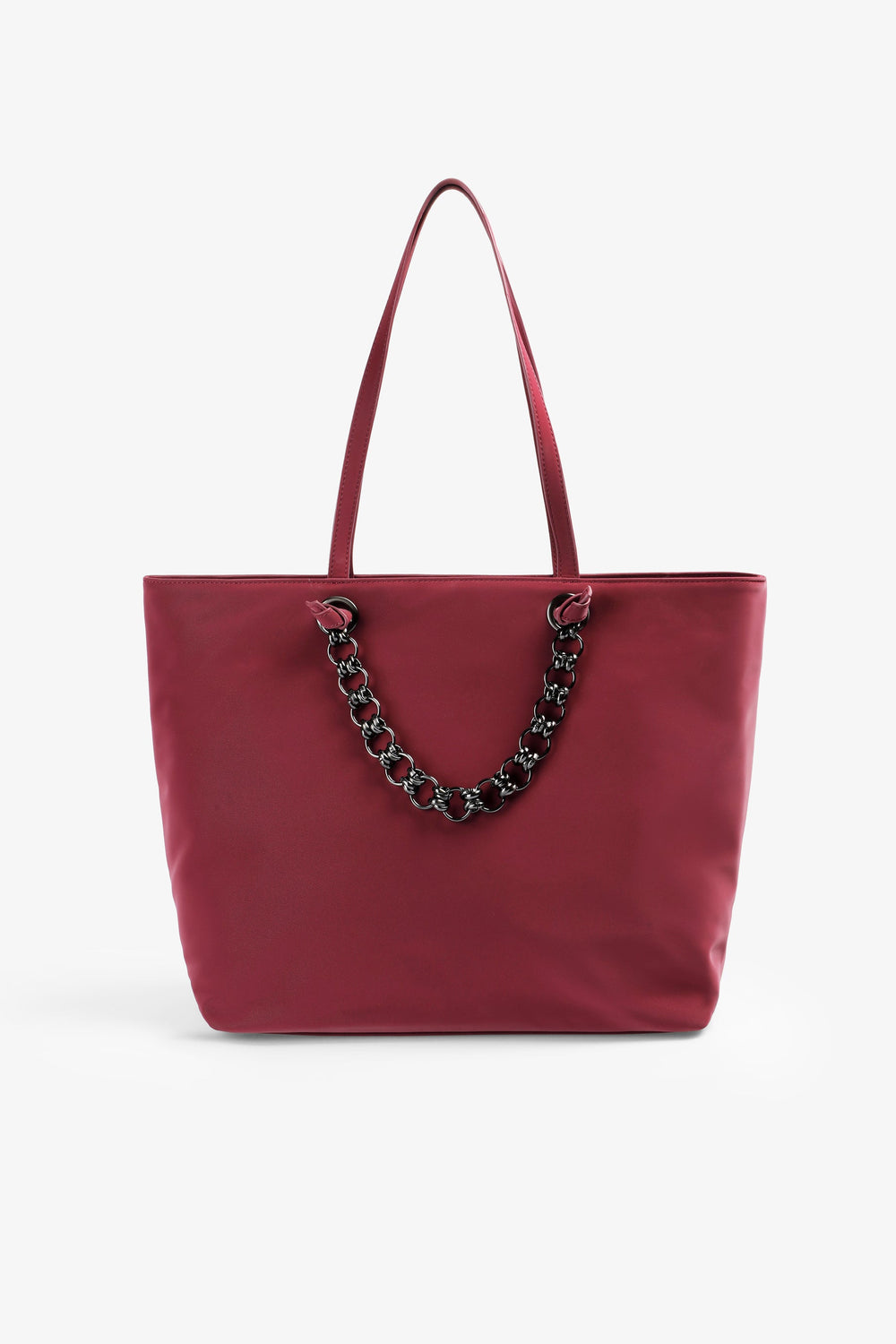 Tote bag made from synthetic leather. Inner lining with two pockets, one zipped. Zip fastening. Shoulder strap. Chain and metallic logo detail on the front