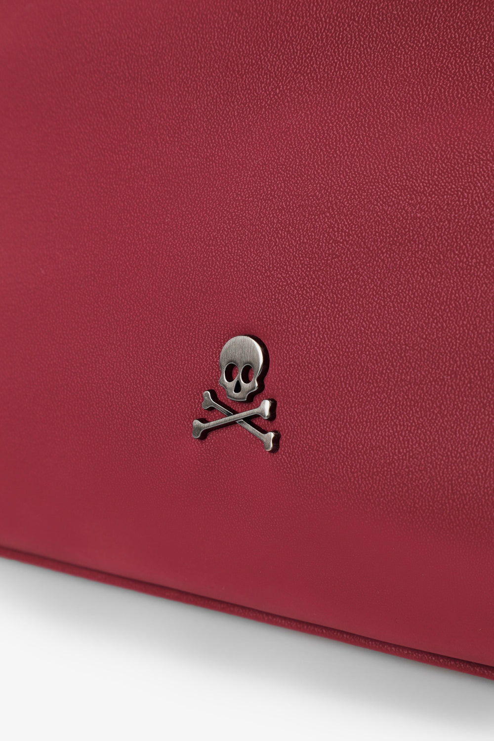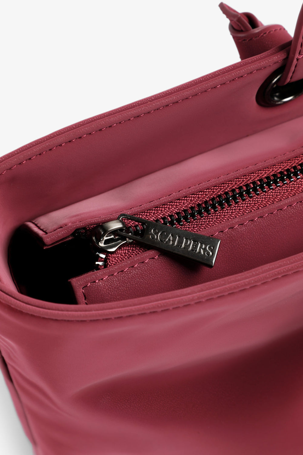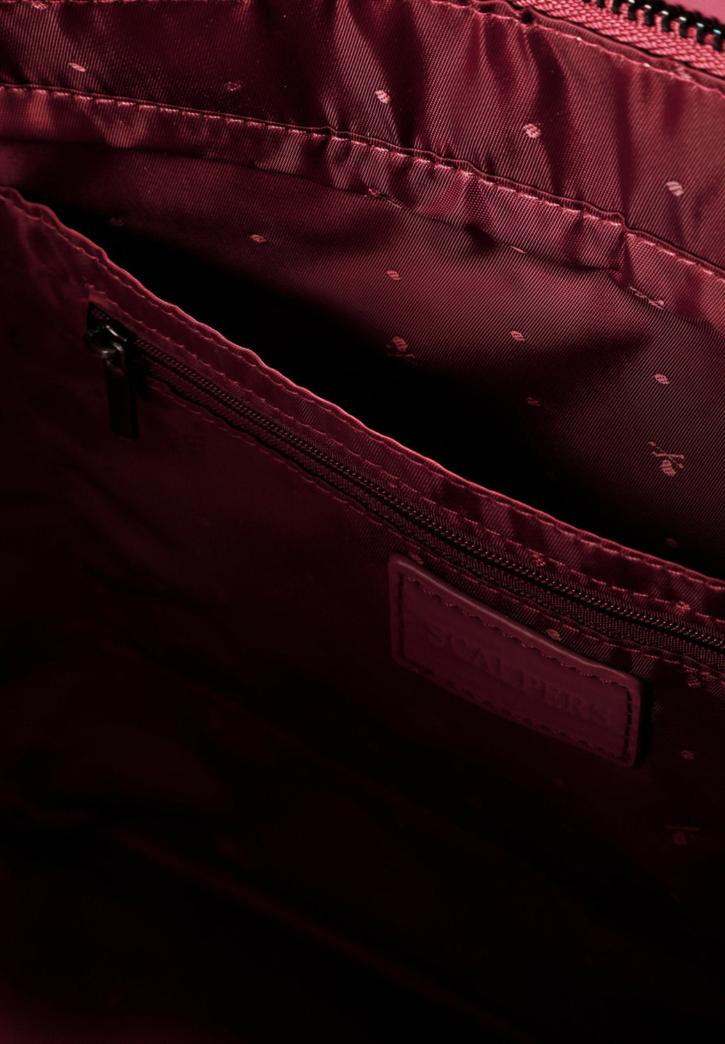 Tote bag made from synthetic leather. Inner lining with two pockets, one zipped. Zip fastening. Shoulder strap. Chain and metallic logo detail on the front