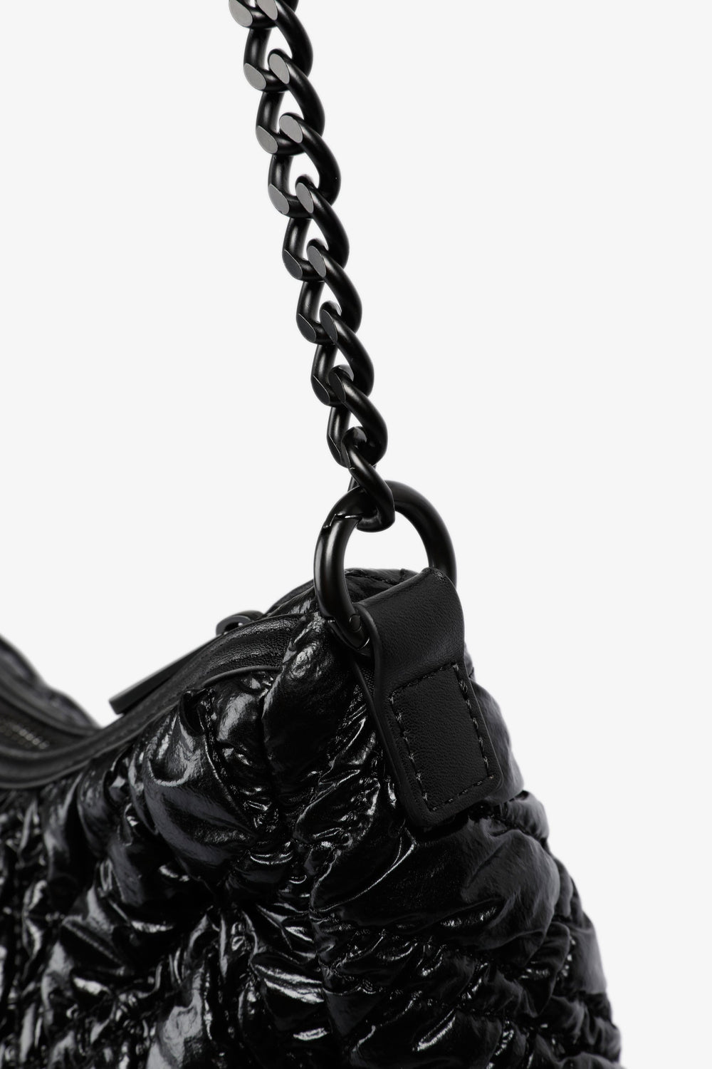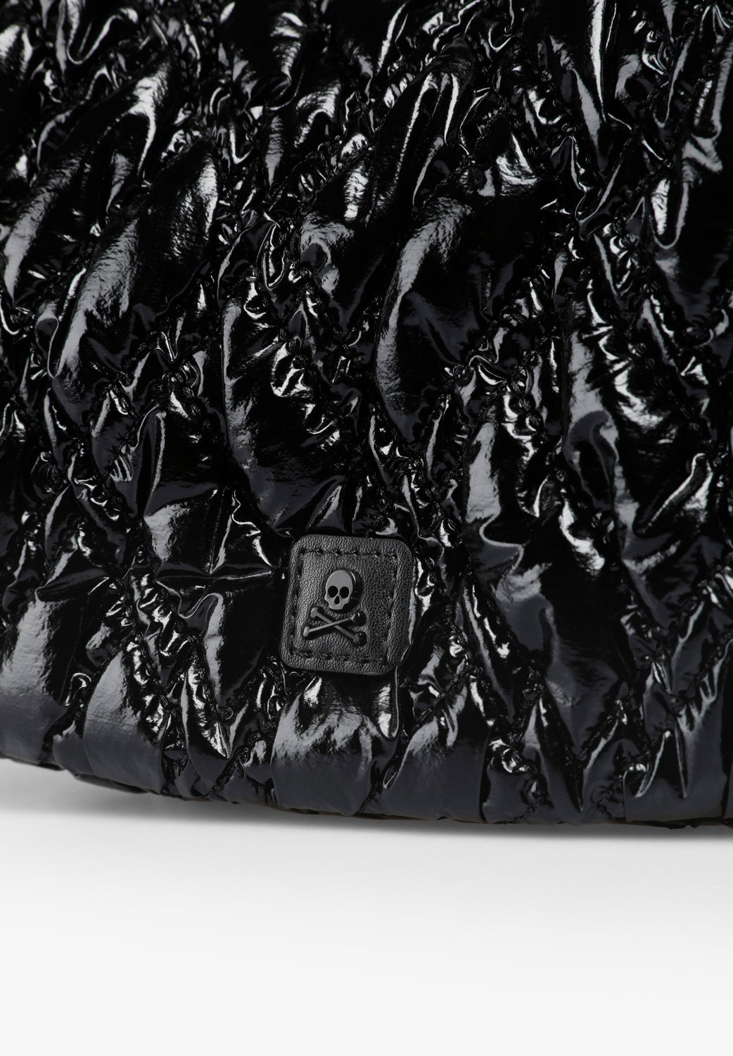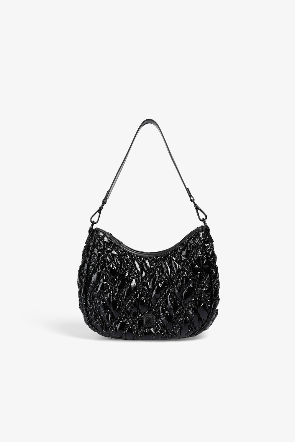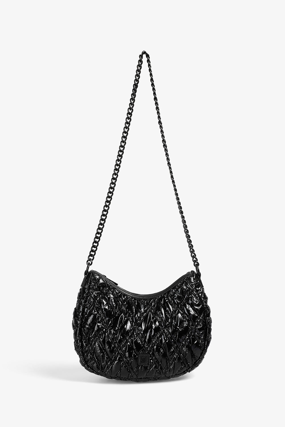 Quilted PU shoulder bag.  Inner lining with zip and zip fastening. Double handle, short and chain option. Logo patch detail on the front.