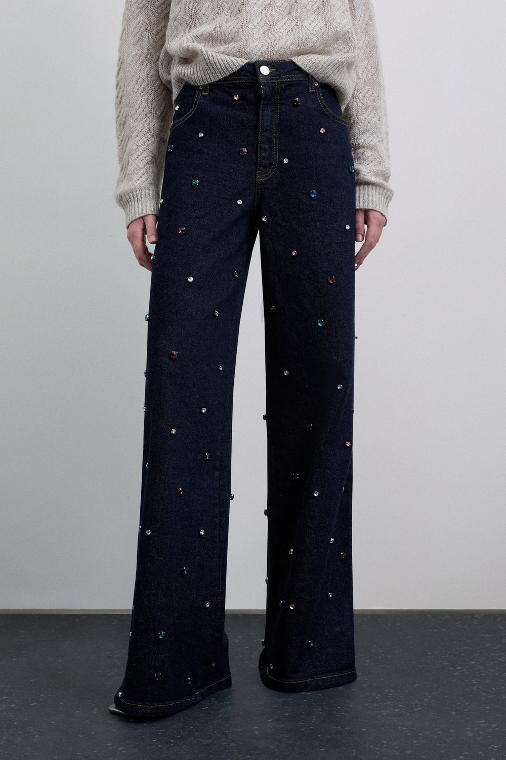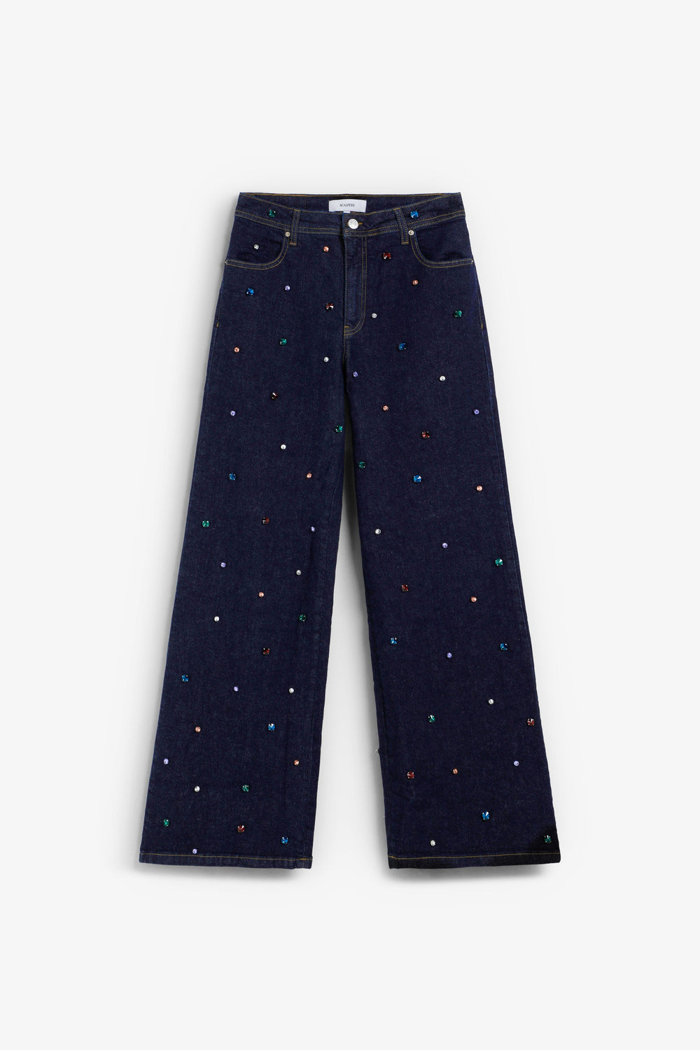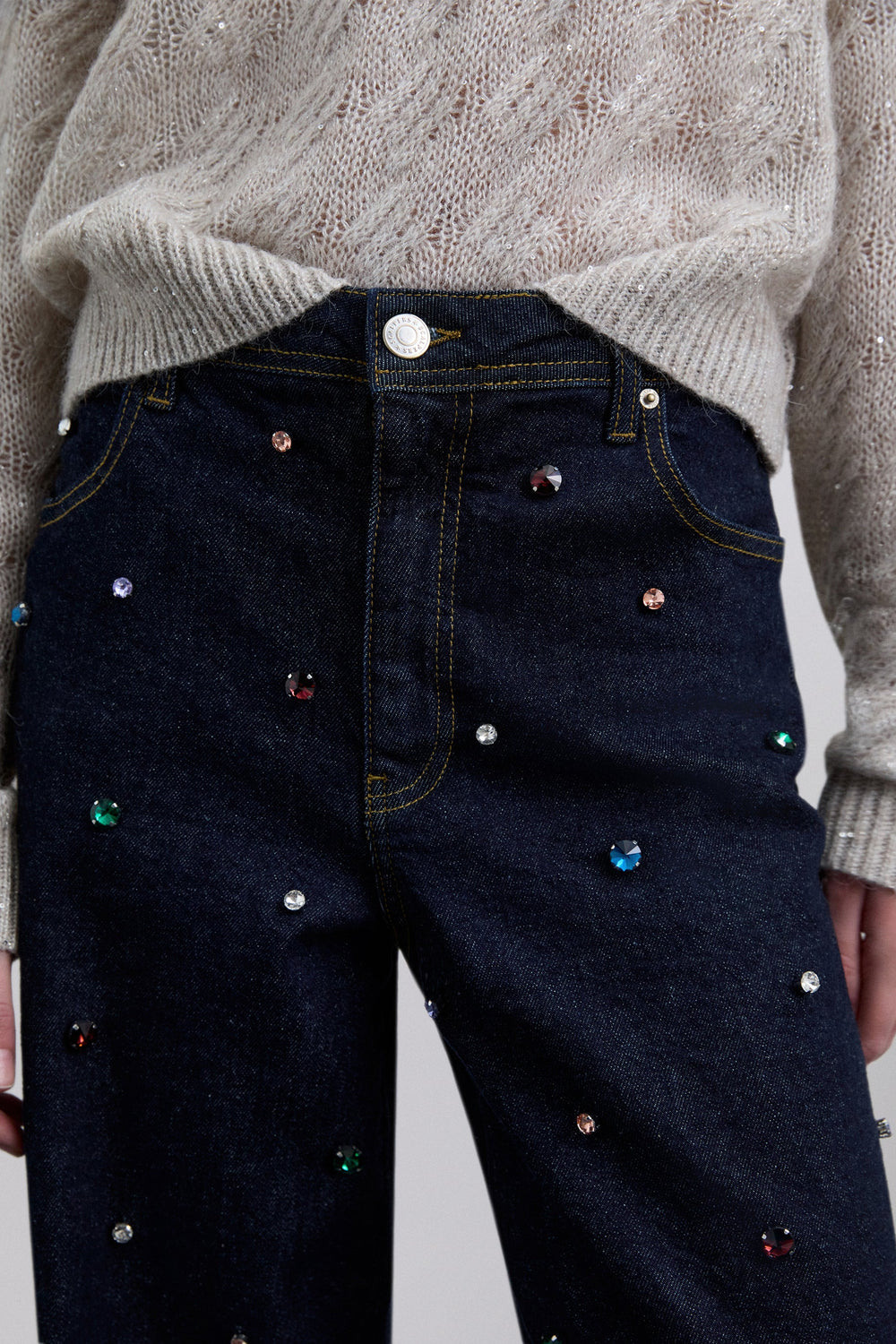 High-waisted, relaxed fit, full-length jeans. Made of dark indigo stretch fabric. Multicoloured sparkly bead detailing on the front. Matching jacket available.