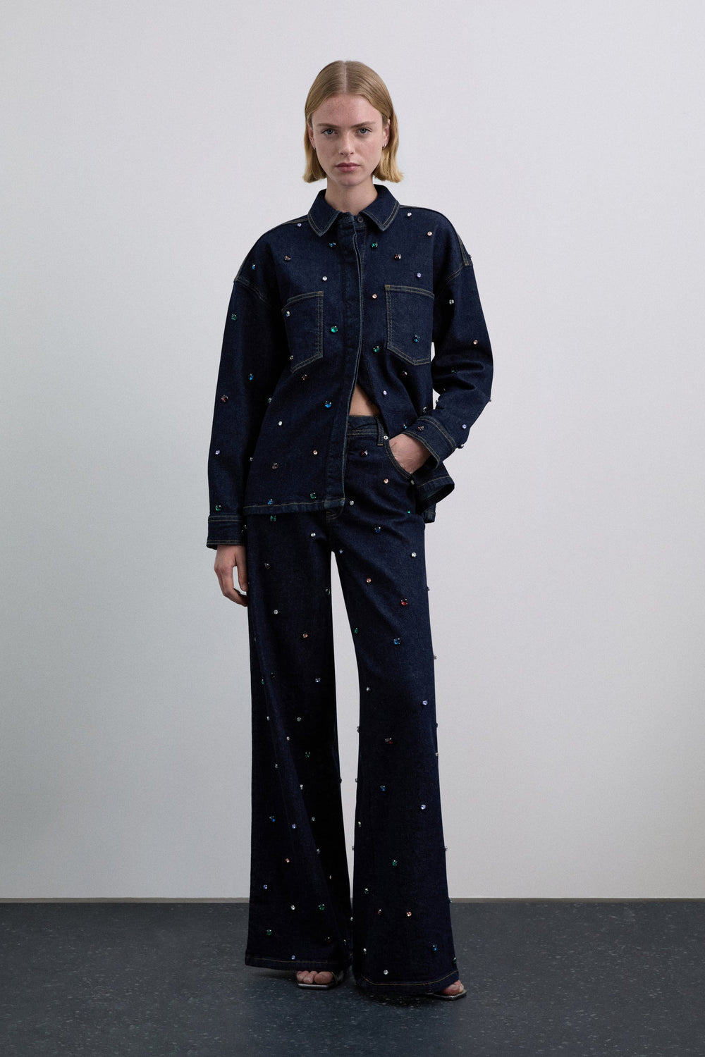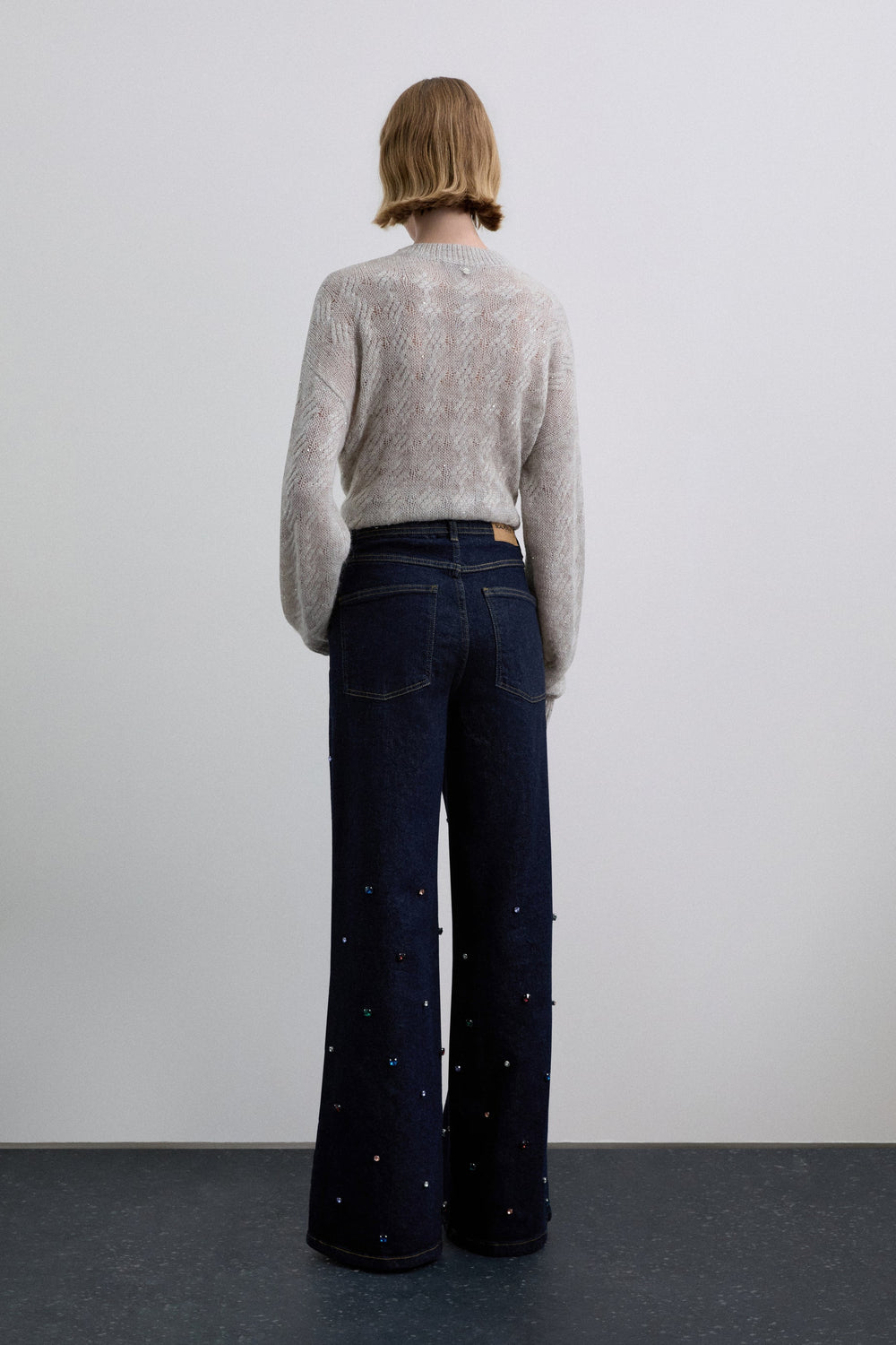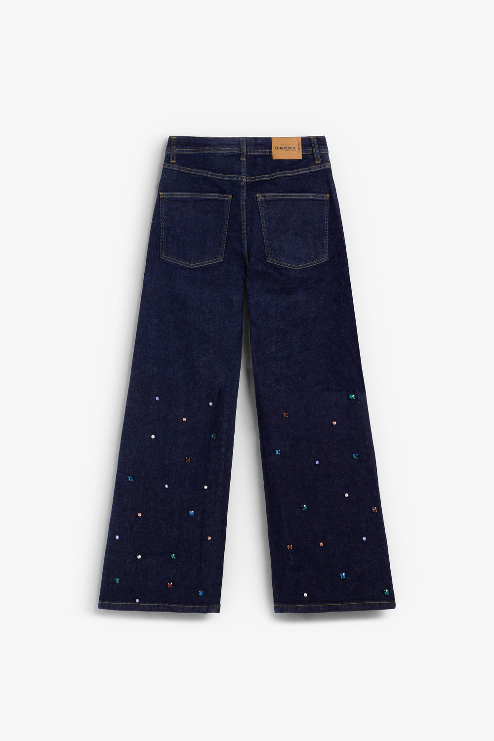 High-waisted, relaxed fit, full-length jeans. Made of dark indigo stretch fabric. Multicoloured sparkly bead detailing on the front. Matching jacket available.