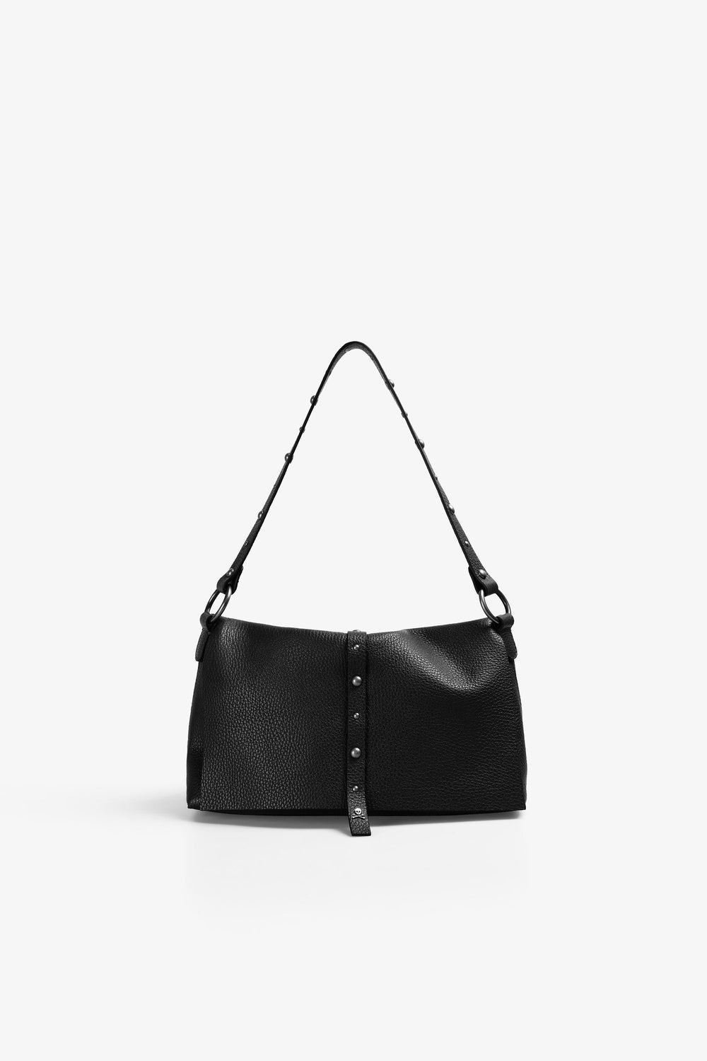 Bag made of 100% leather with stud details. Closing placket. Short handle and long strap.