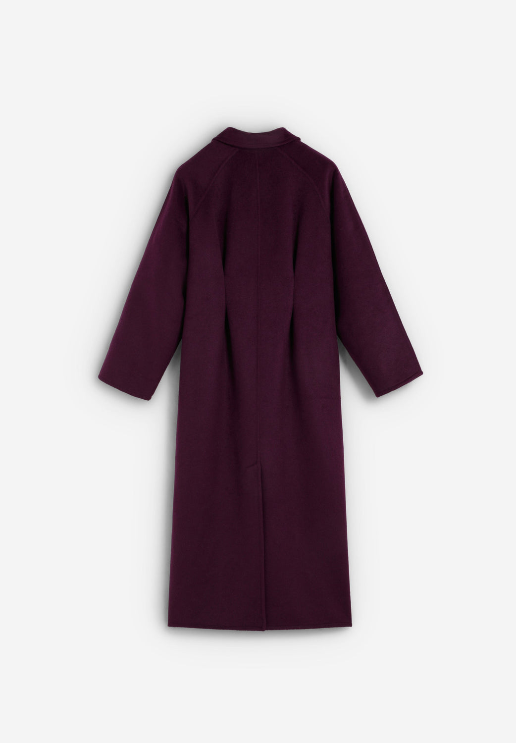 Long coat made of a wool blend. Handmade coat with raglan sleeves. This garment has a detachable scarf at the neck, five button fastening and pleats at the back.
