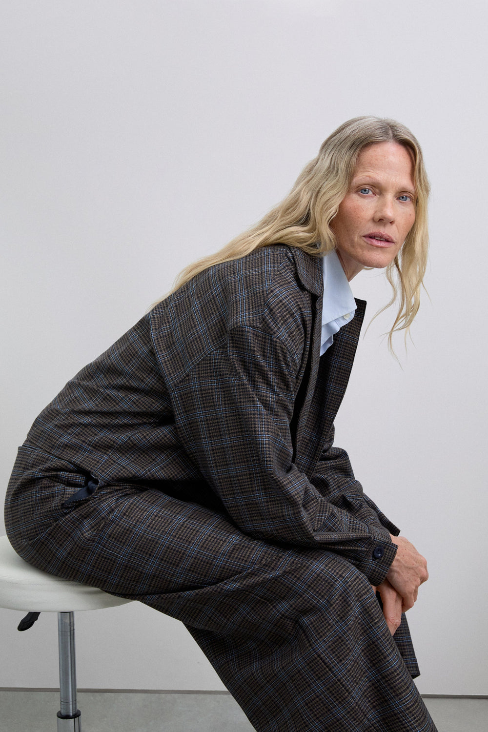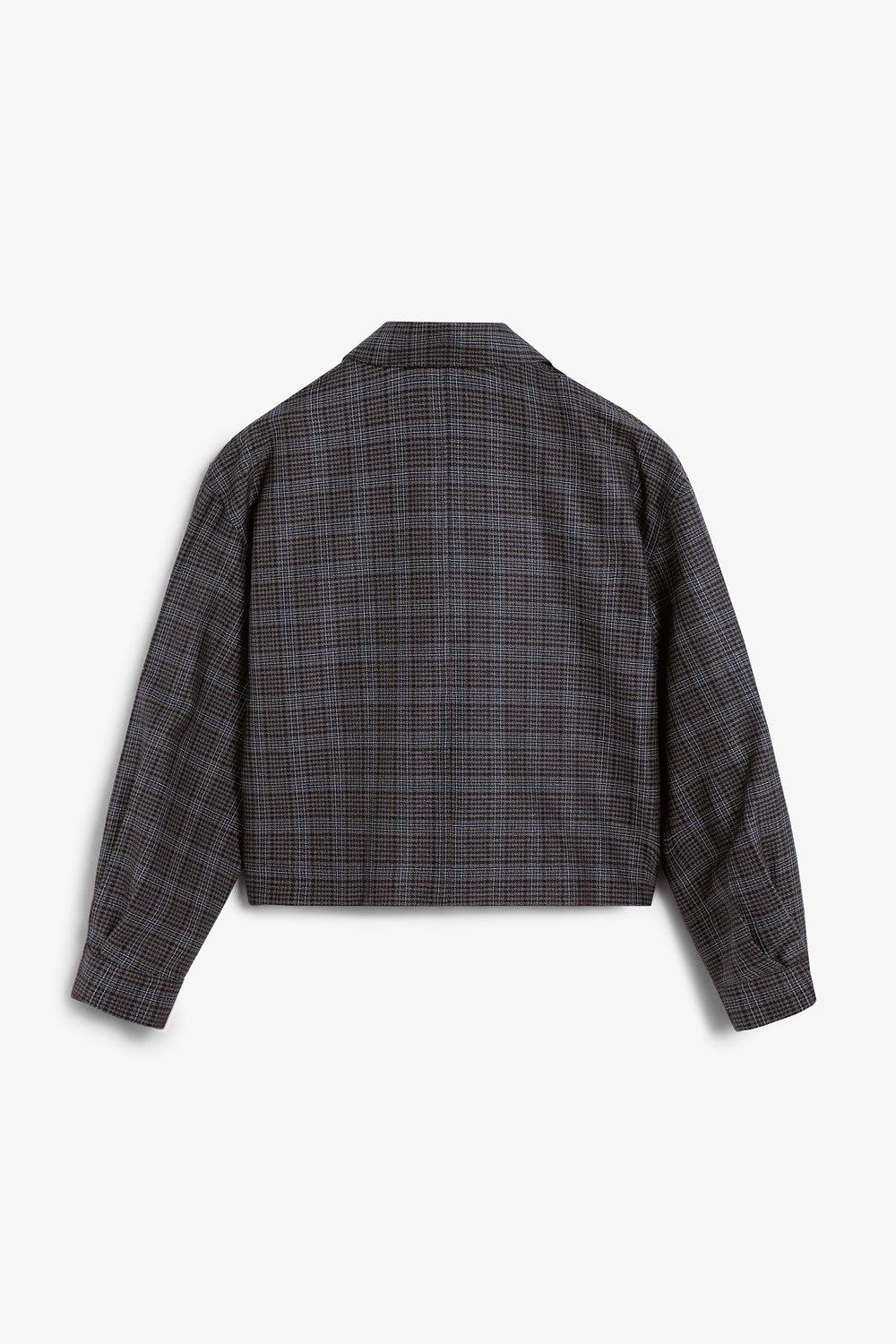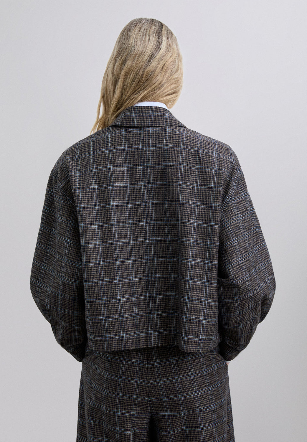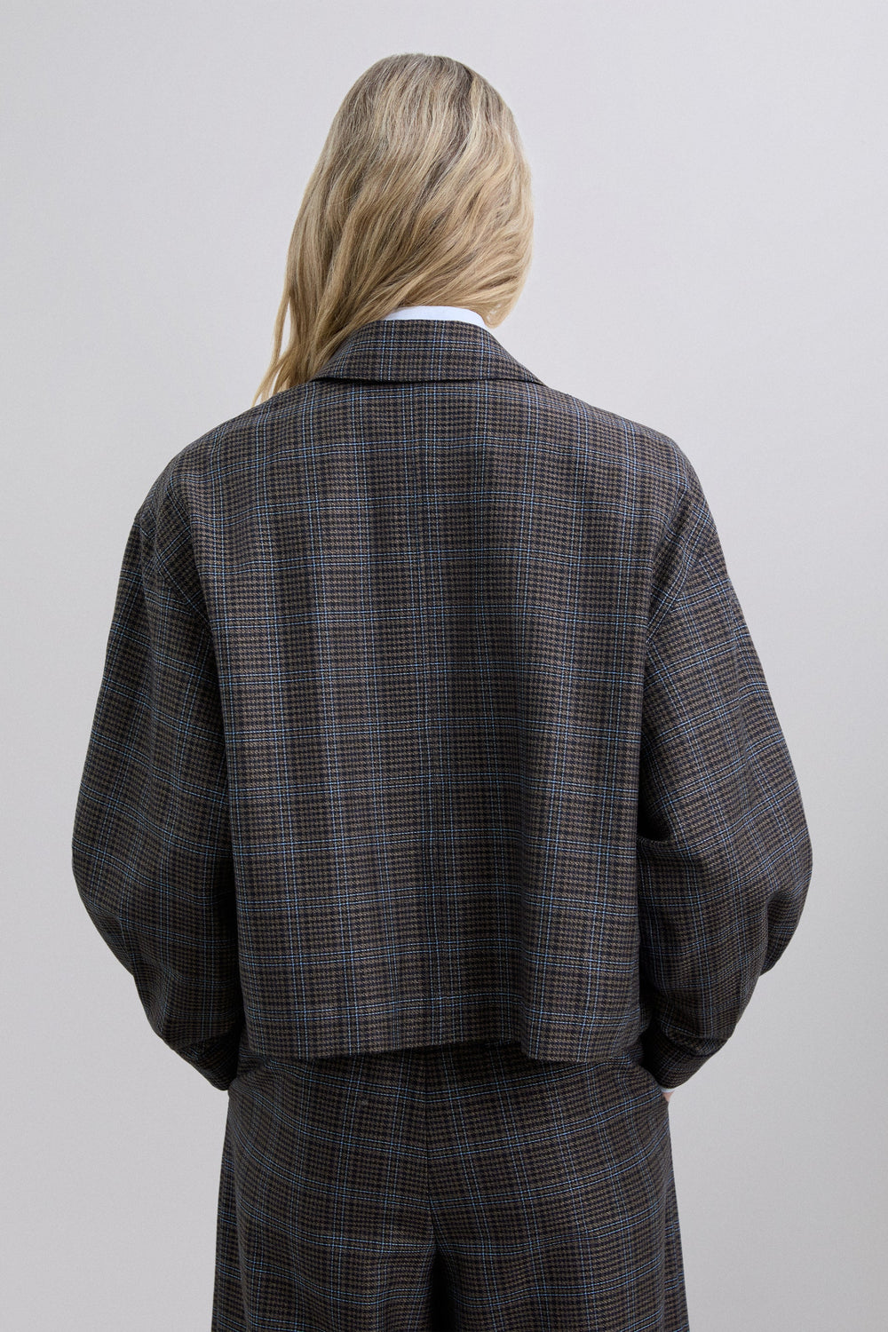 Check print cardigan. Shirt collar. Long sleeves. Waist adjusters. Cuffs with button fastening. Front button fastening.