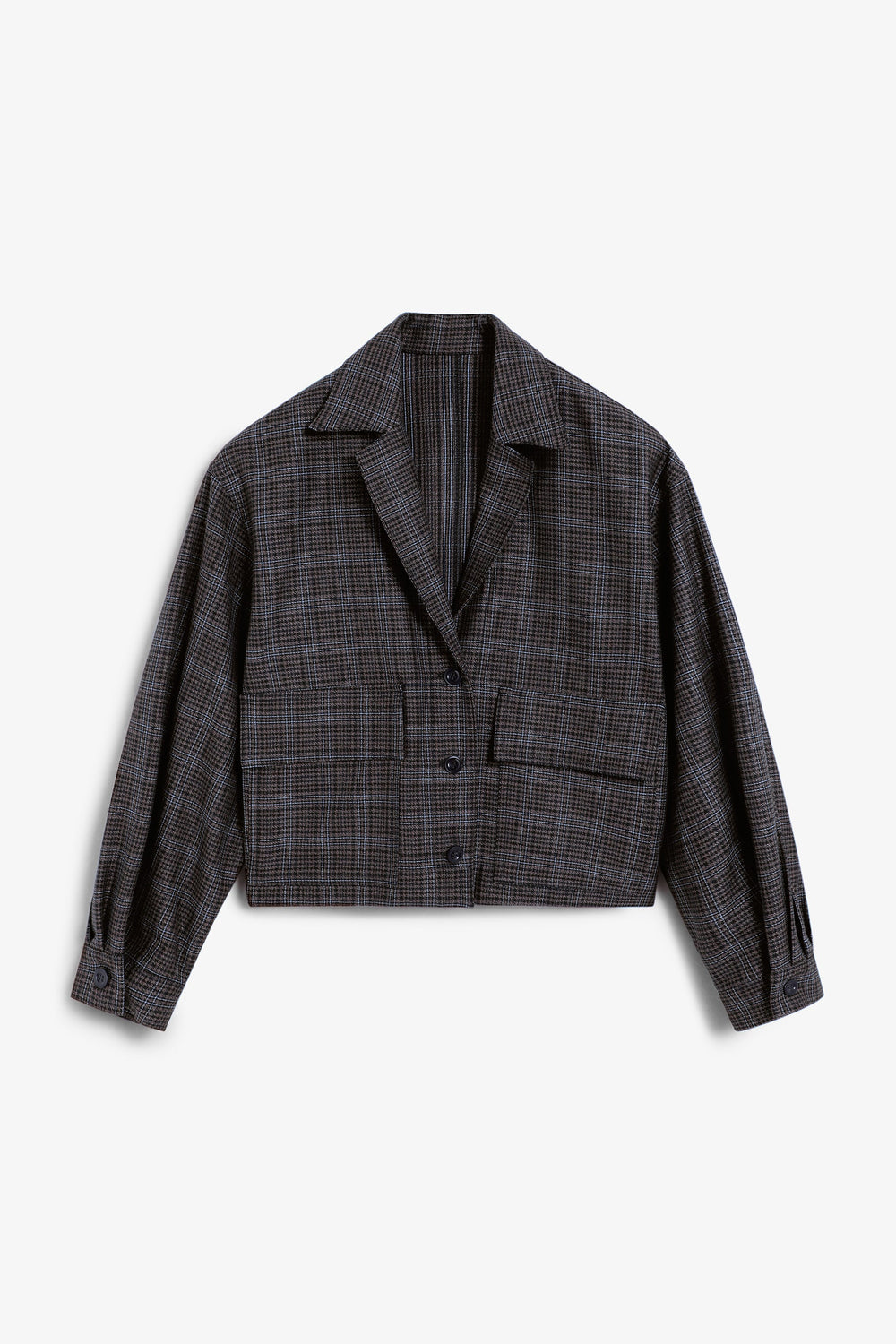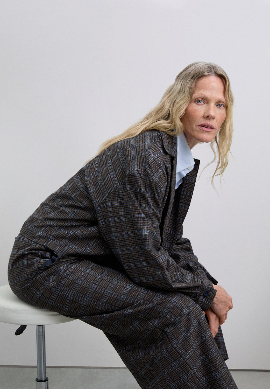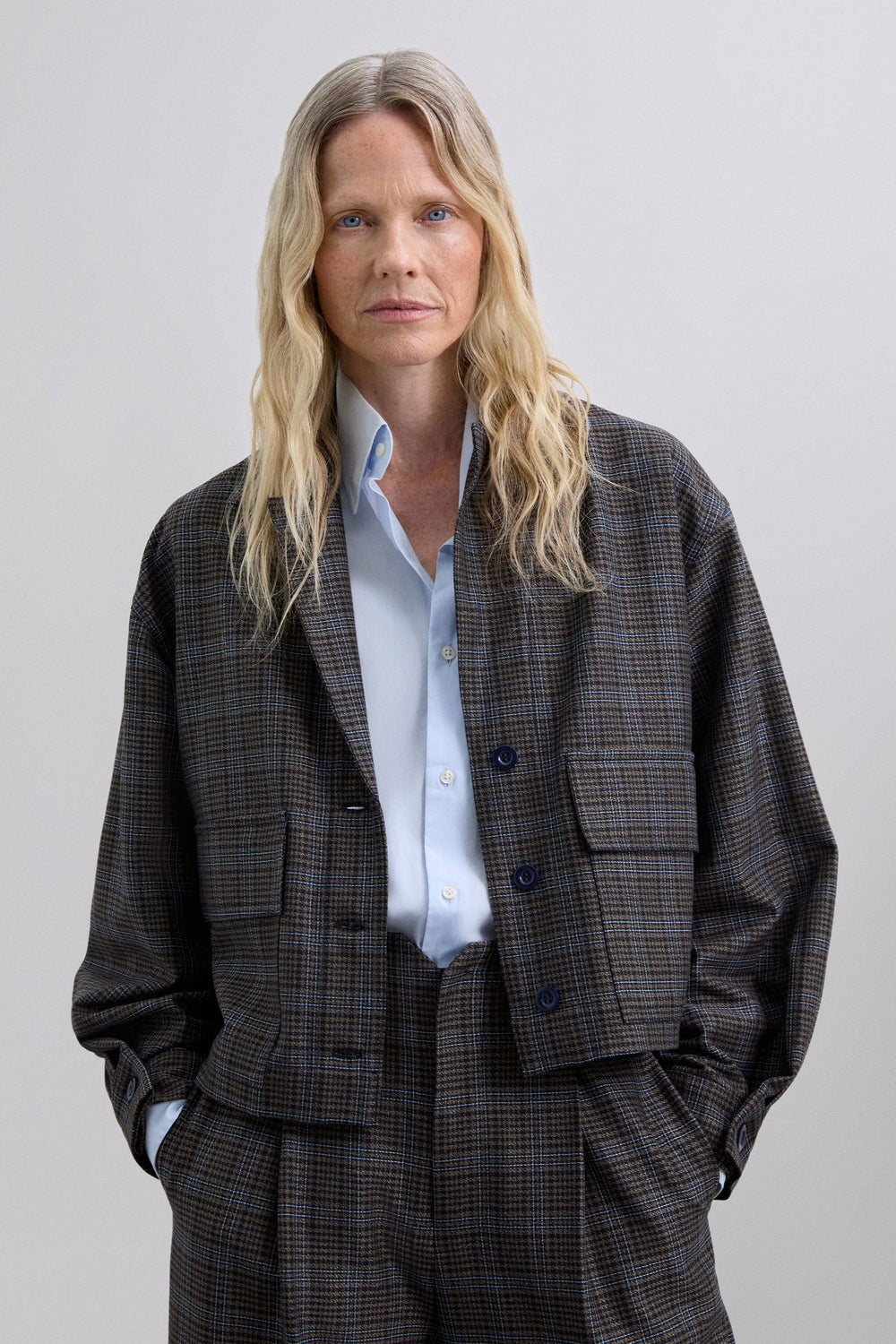 Check print cardigan. Shirt collar. Long sleeves. Waist adjusters. Cuffs with button fastening. Front button fastening.