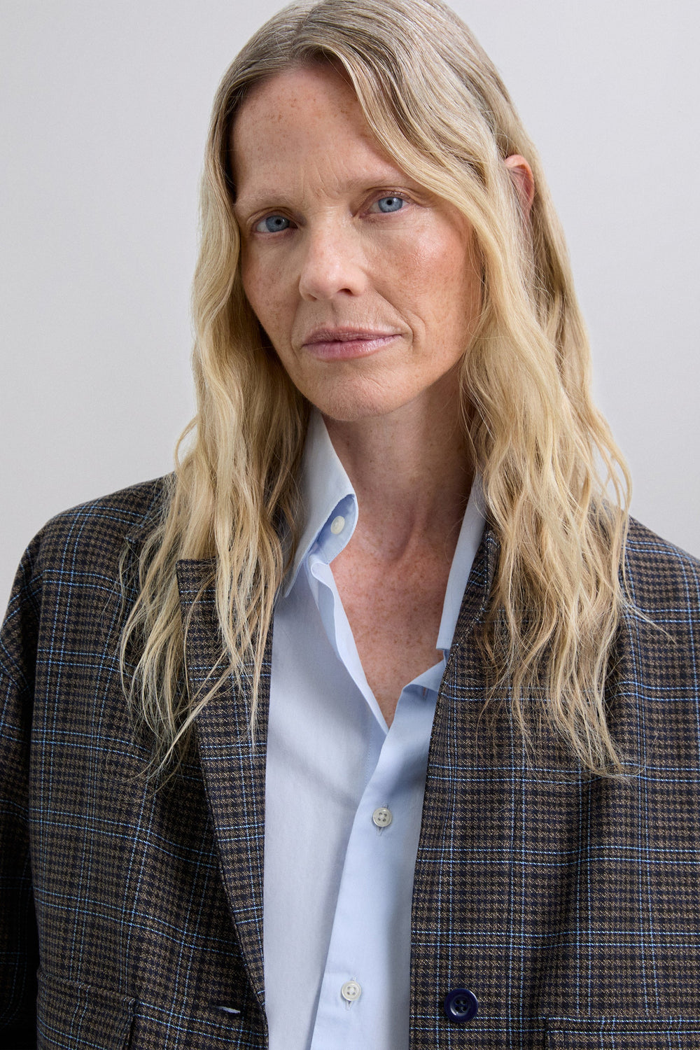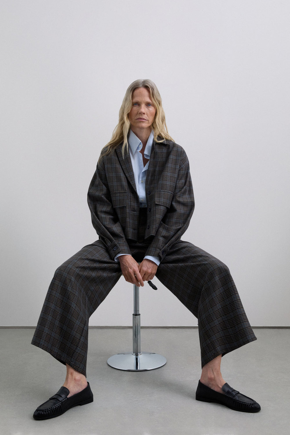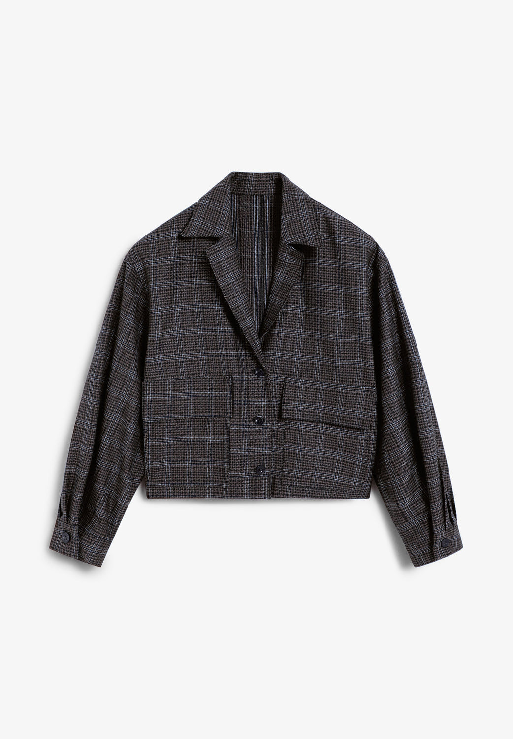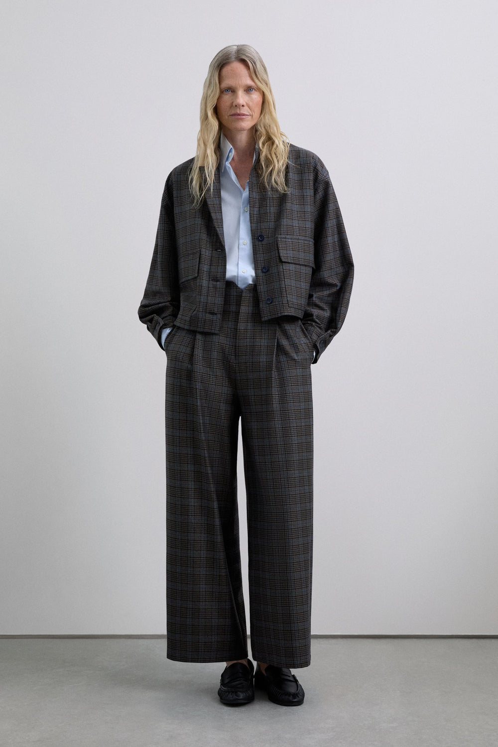 Check print cardigan. Shirt collar. Long sleeves. Waist adjusters. Cuffs with button fastening. Front button fastening.