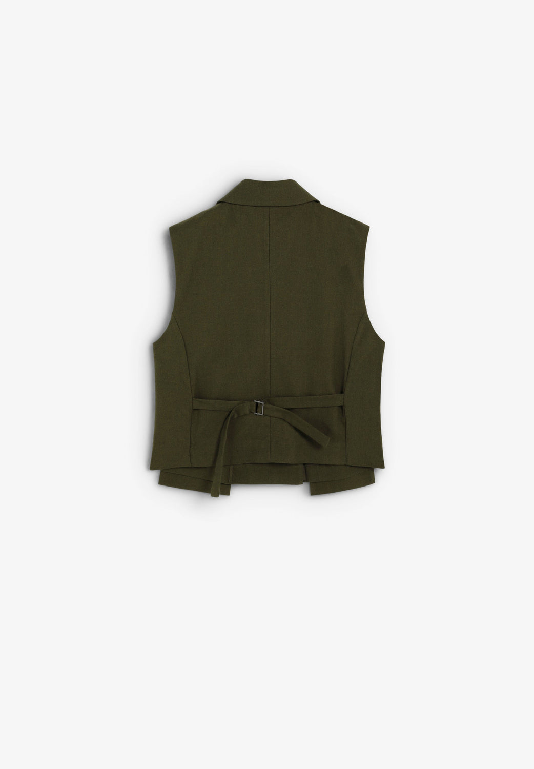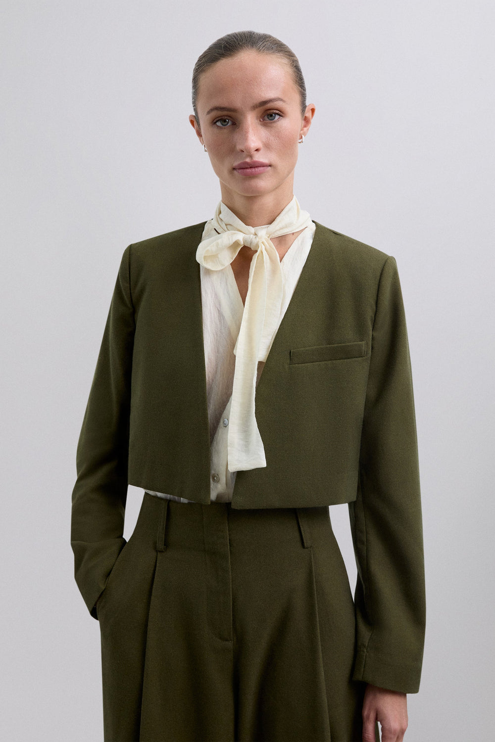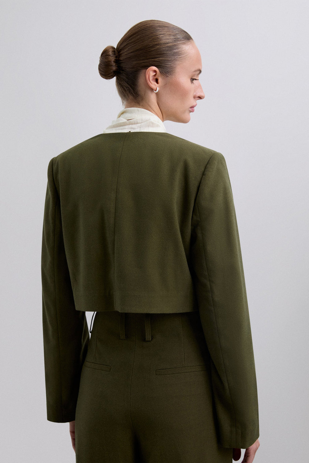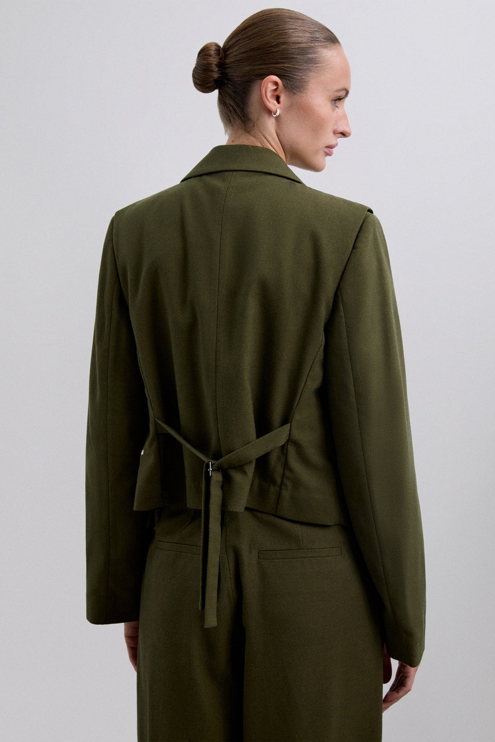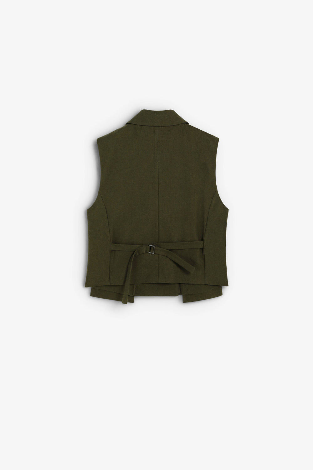 Blazer made of a viscose blend. Detachable into a waistcoat and a cropped jacket. Sleeveless waistcoat with lapel collar, button fastening and adjustable back. Cropped jacket, collar without lapel, long sleeves and chest welt pocket.