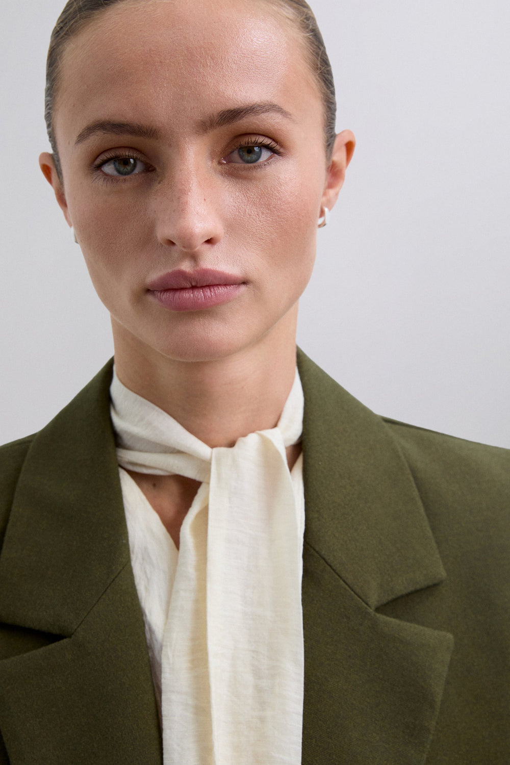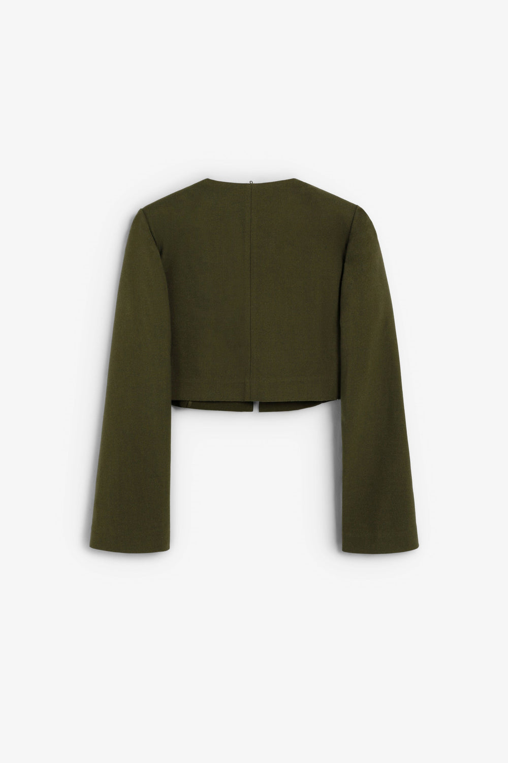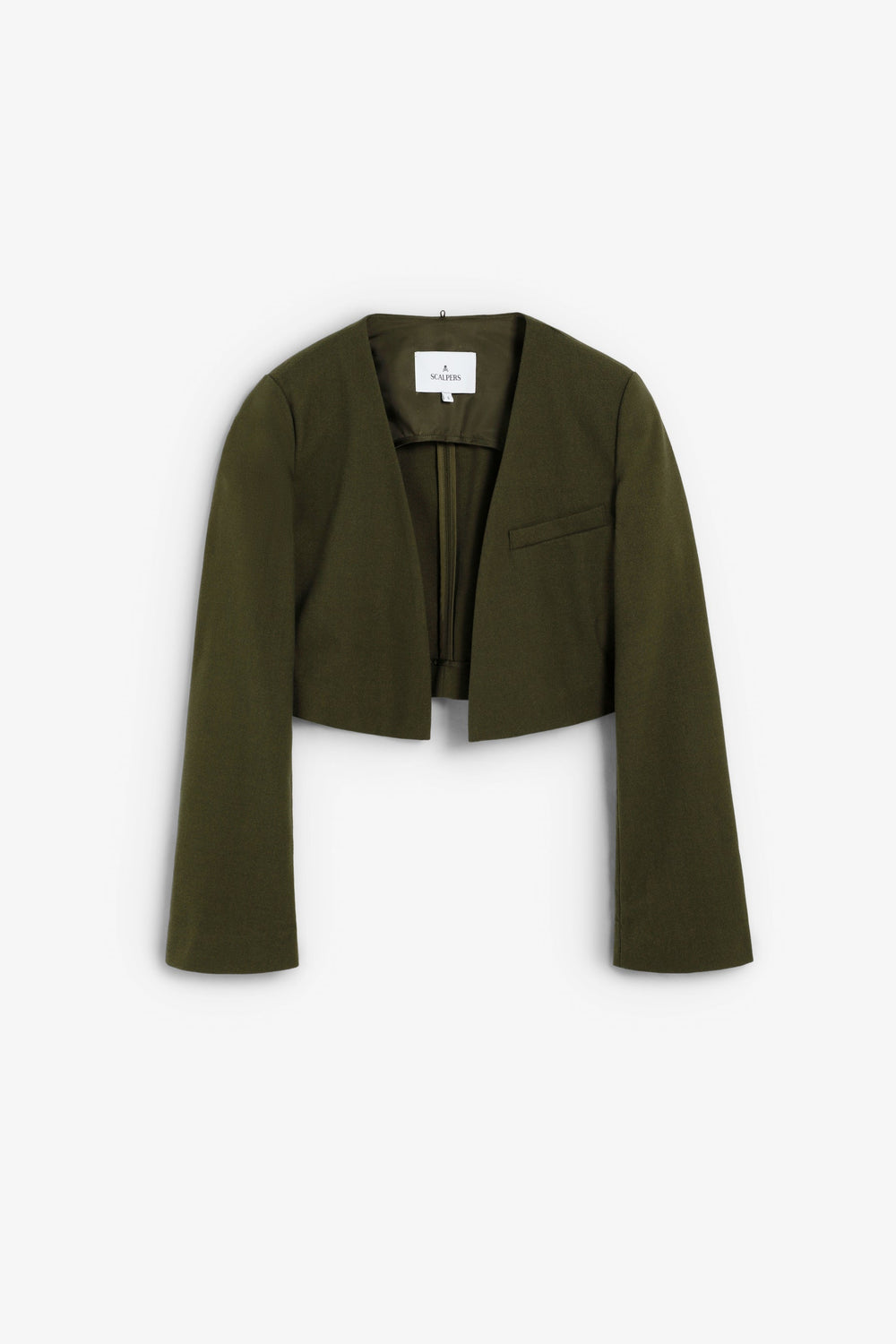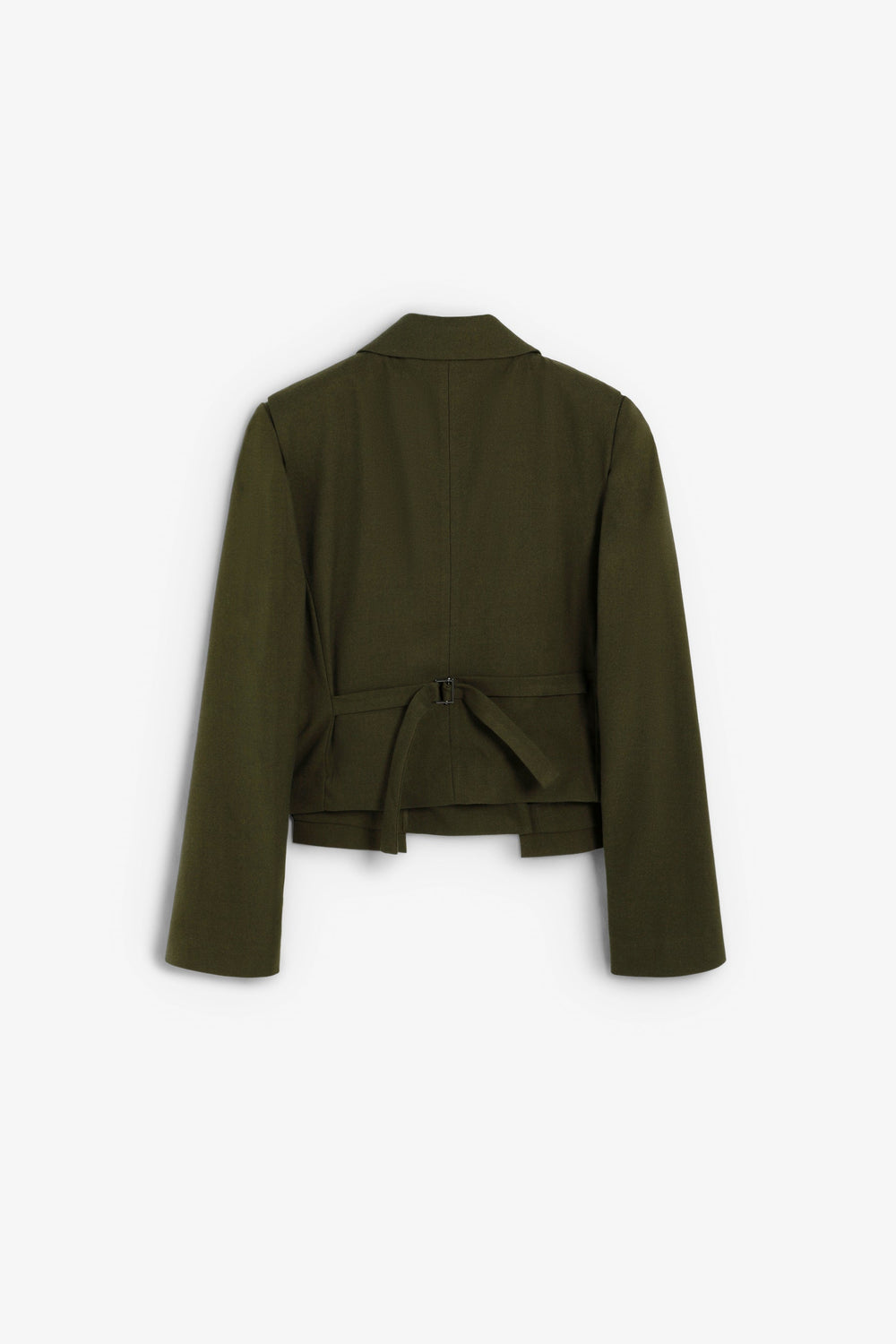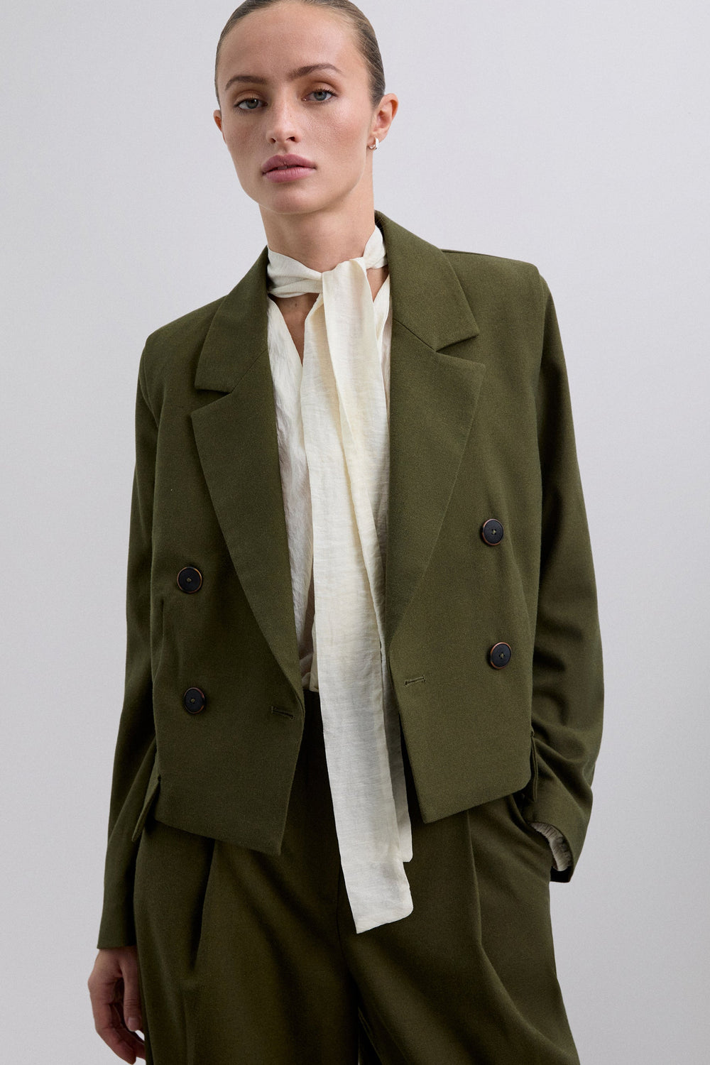Blazer made of a viscose blend. Detachable into a waistcoat and a cropped jacket. Sleeveless waistcoat with lapel collar, button fastening and adjustable back. Cropped jacket, collar without lapel, long sleeves and chest welt pocket.