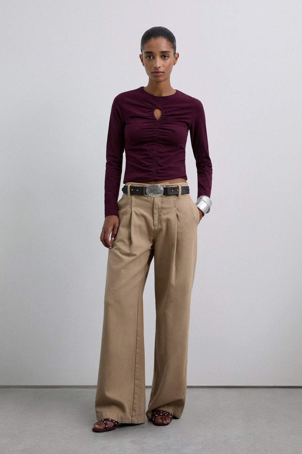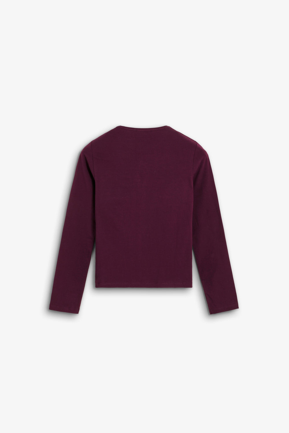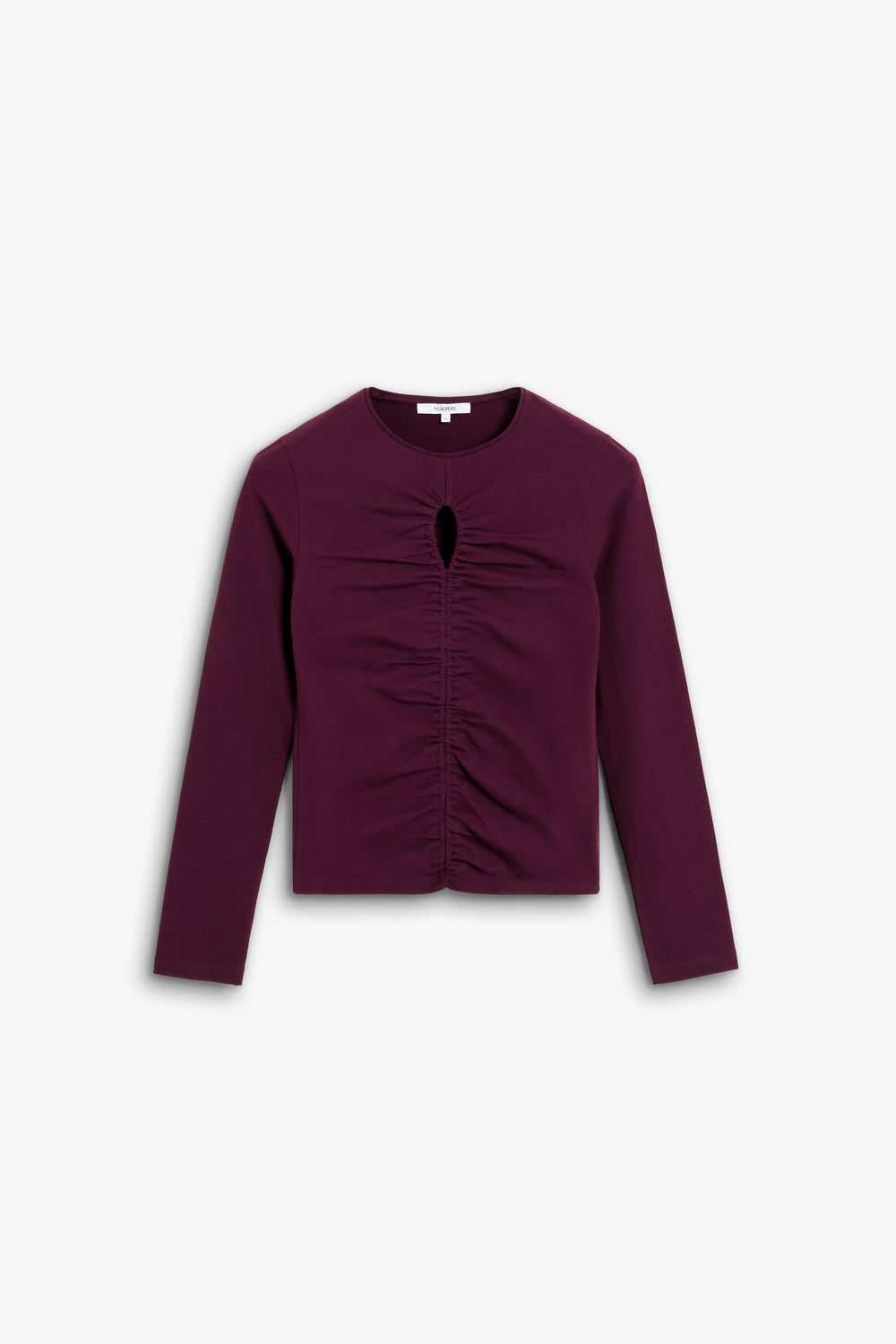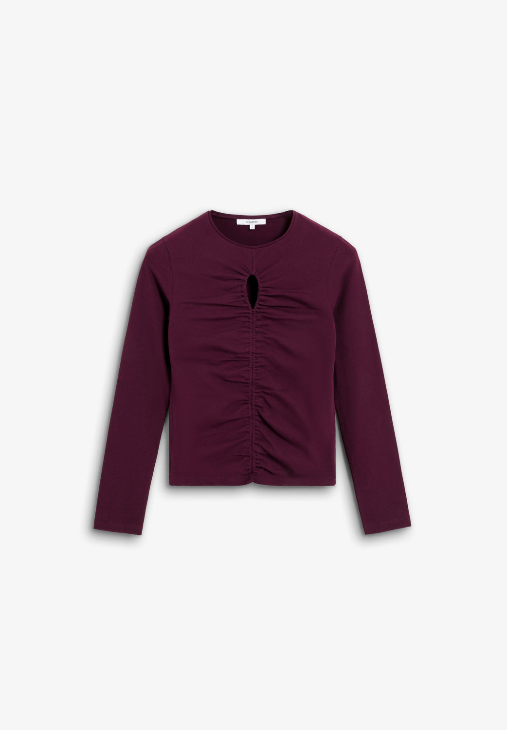 T-shirt made of slightly stretchy cotton fabric. Slim fit, round neck and long sleeves. Opening detail on the neckline and front gathers.