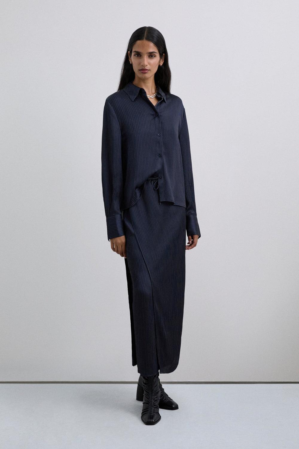 Long pinstripe skirt. Elastic waistband with adjustable drawstring Straight cut with side slit