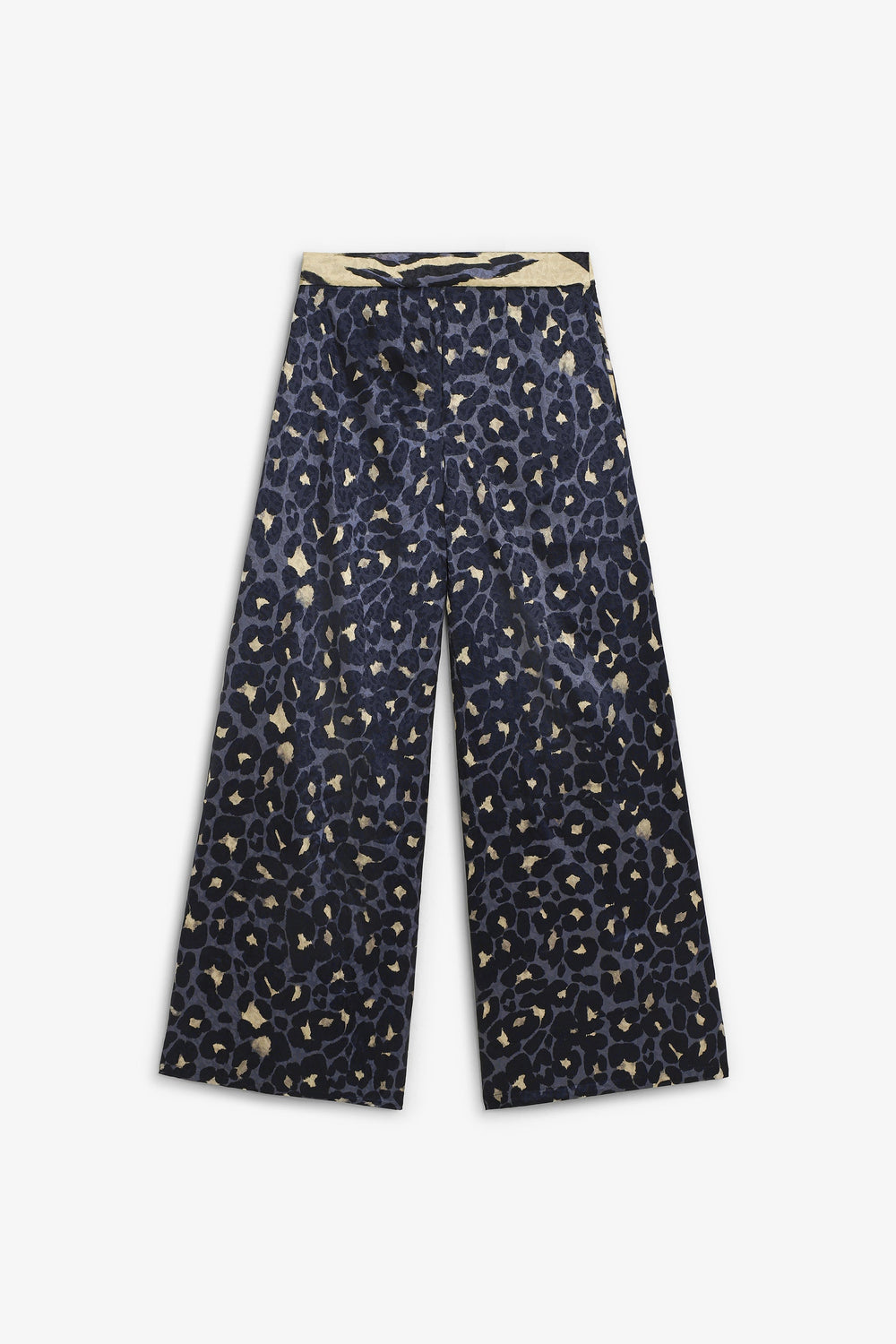 Flowing trousers. Zip fastening concealed by a placket with hook and button. Elastic waistband. Two side pockets. Animal print. Flowing fabric with satin finish.