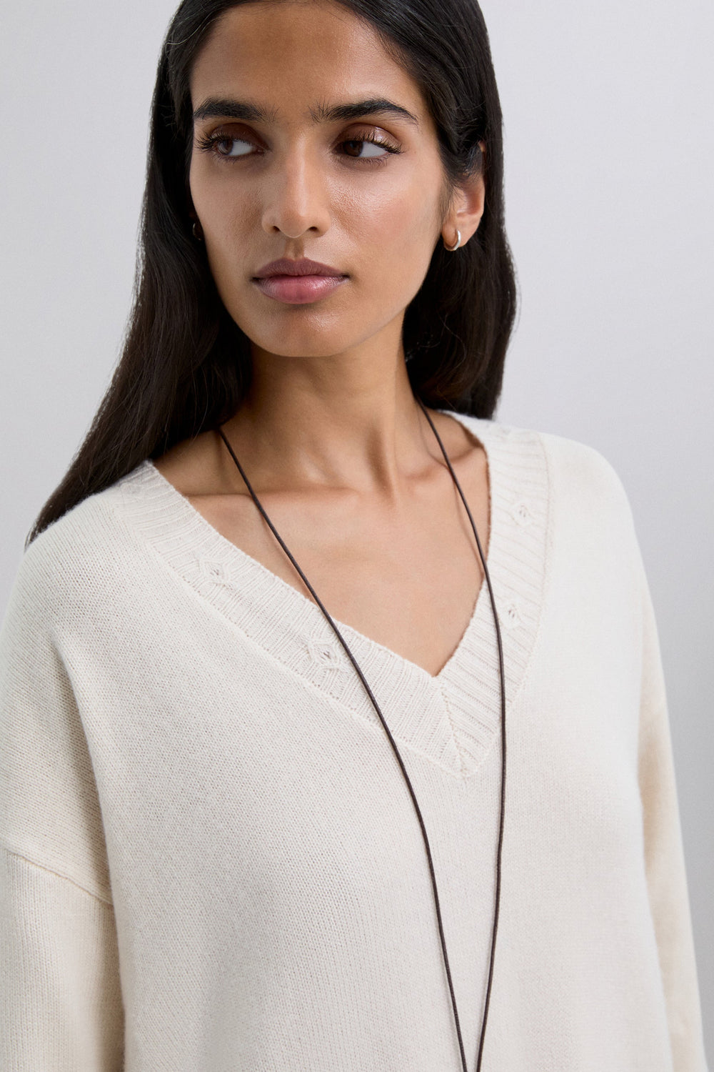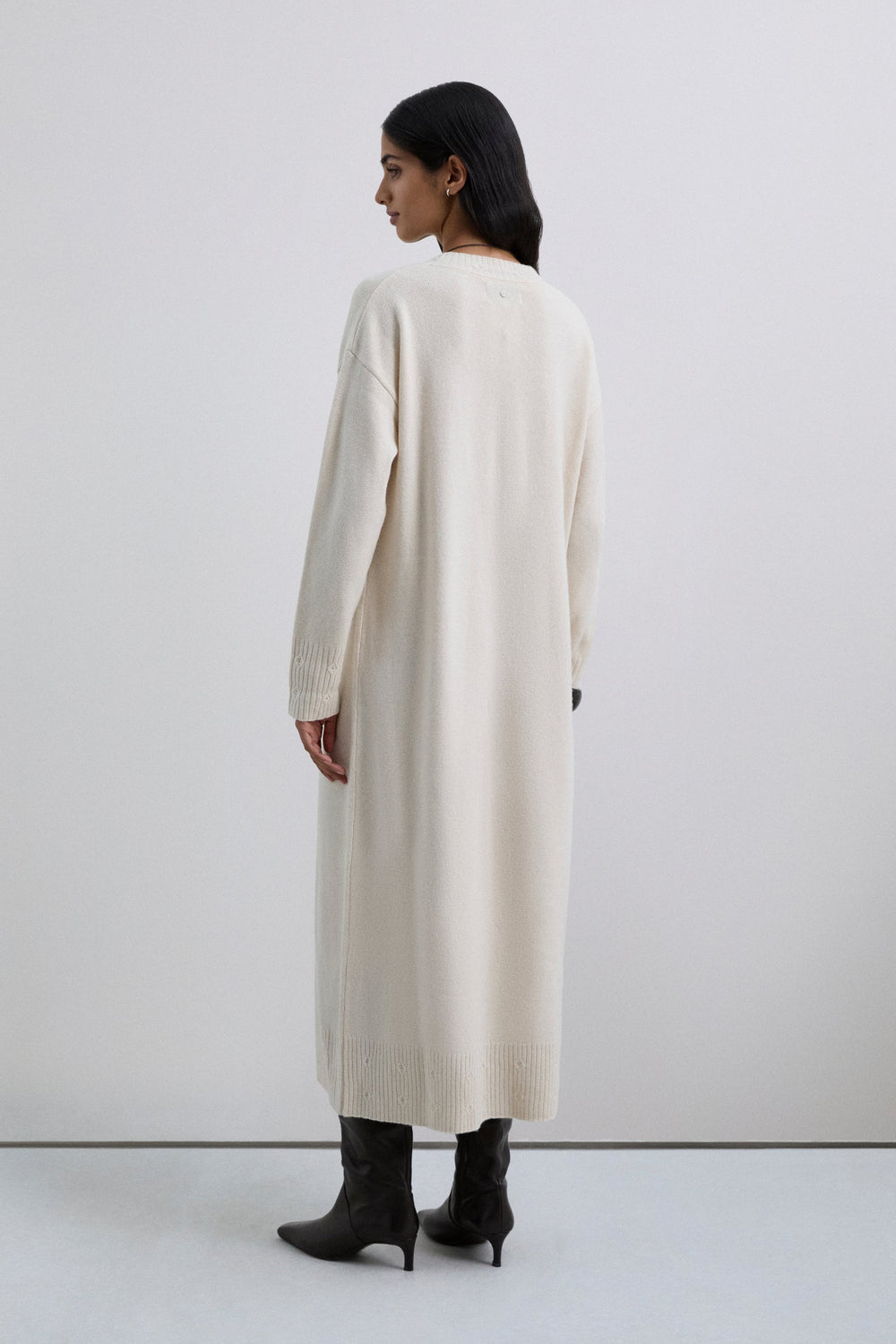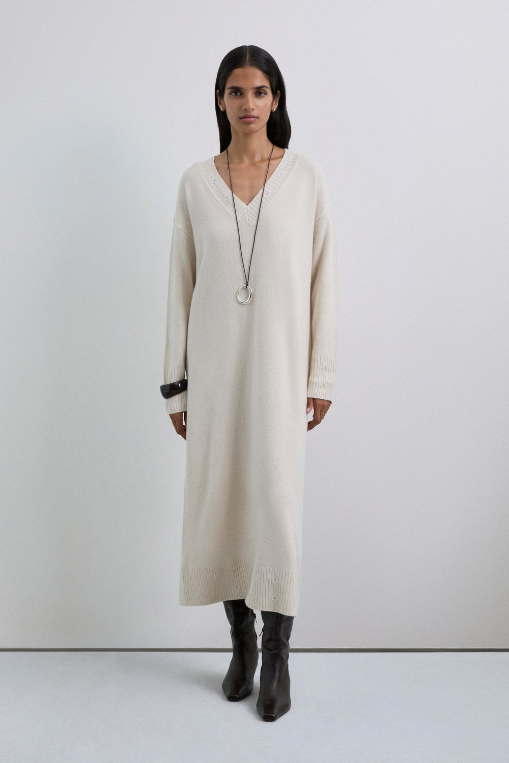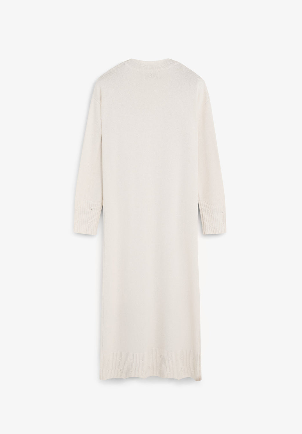 Loose fit midi-length dress with V-neckline and long sleeves. Special stitching details on the neckline, cuffs and hem. Mini holes around the bottom.