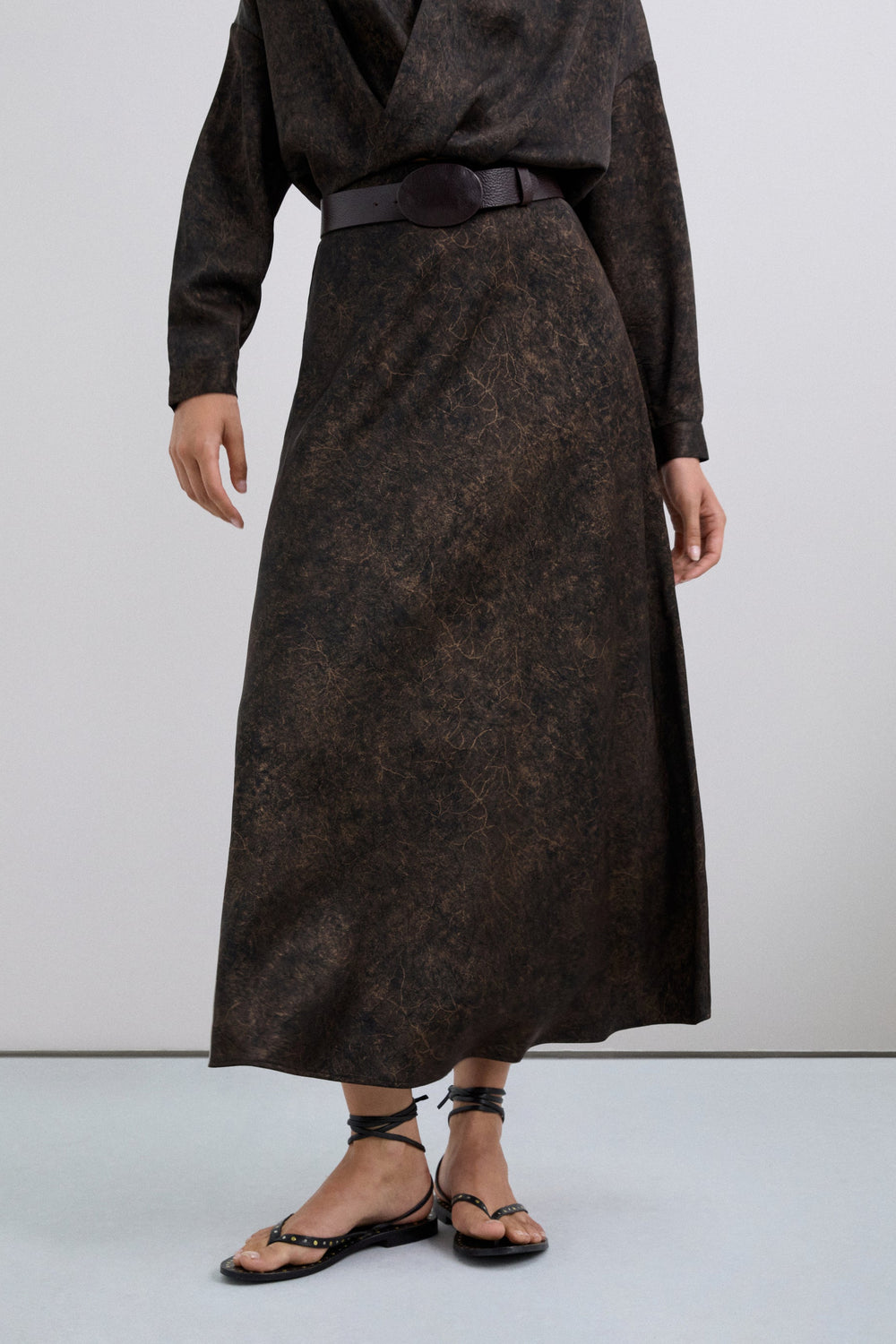 Flowing fabric skirt with satin finish. Marbleised effect print. Regular fit. Midi cut. Concealed side zip fastening.