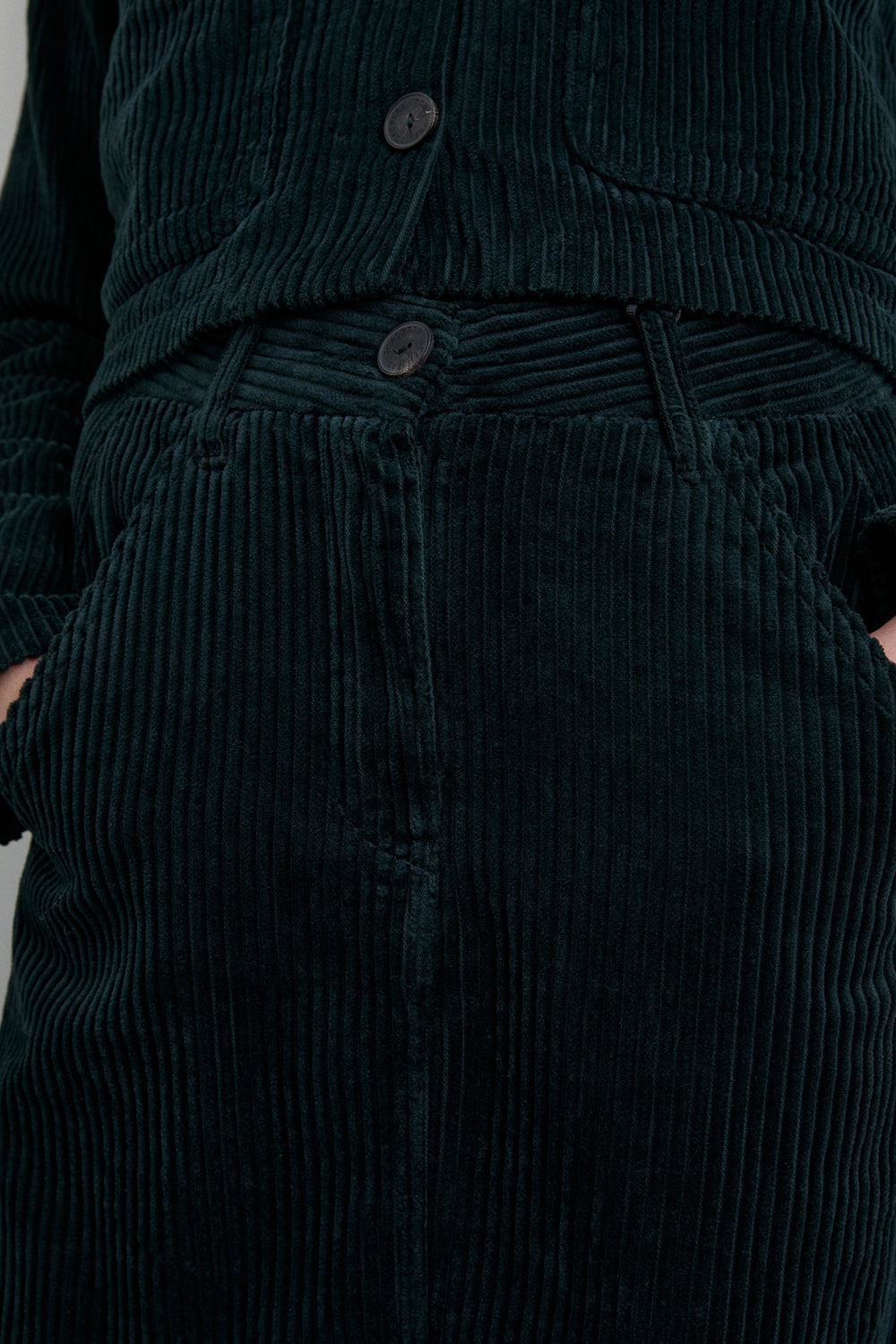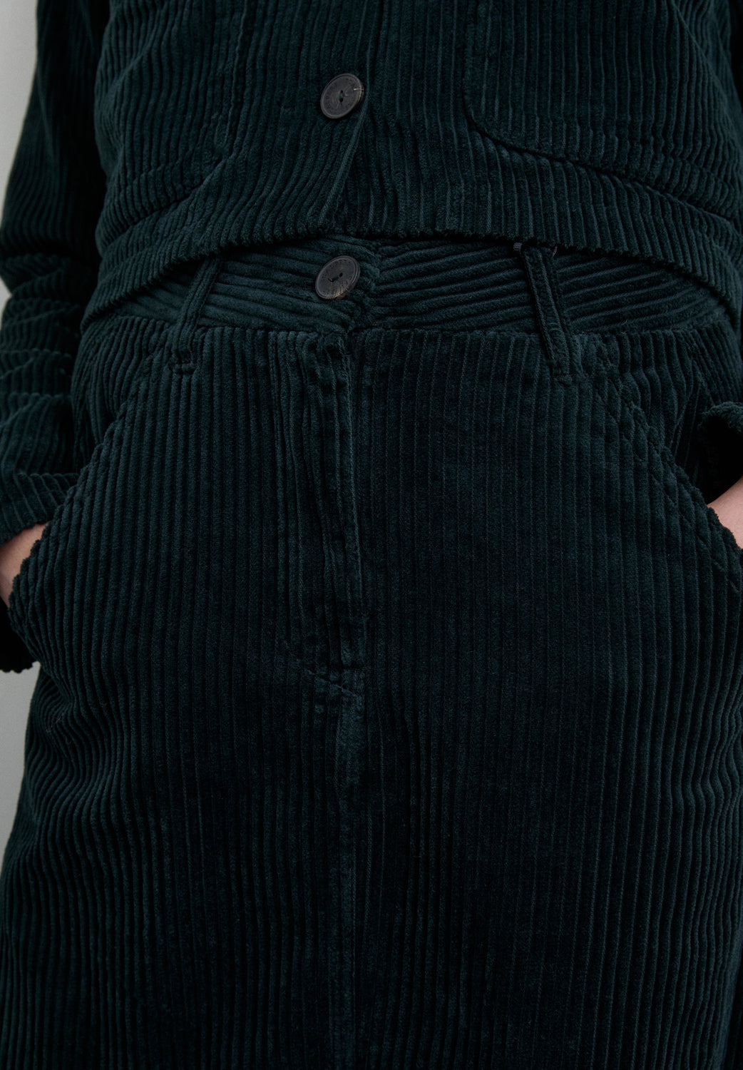 Corduroy skirt made of cotton. Pockets on the front. Zip and button fastening. Midi length. Belt loops.