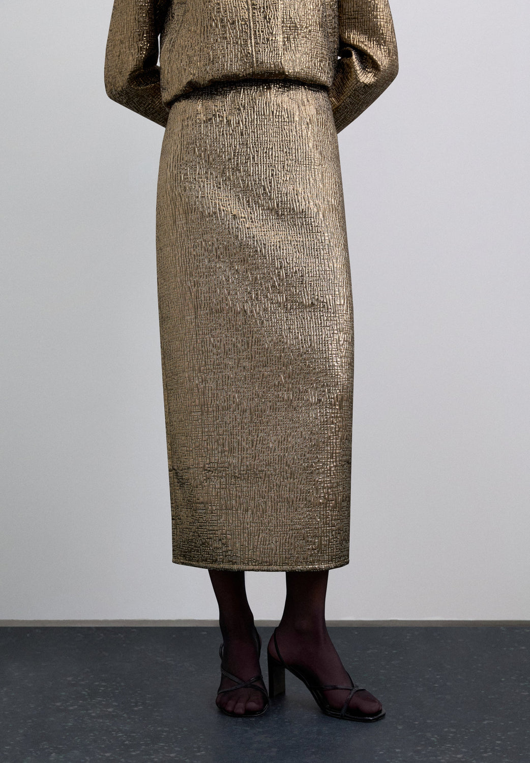 Straight skirt in gold jacquard, mid-rise and midi length. It features a discreet back slit for ease of movement and invisible zip fastening.