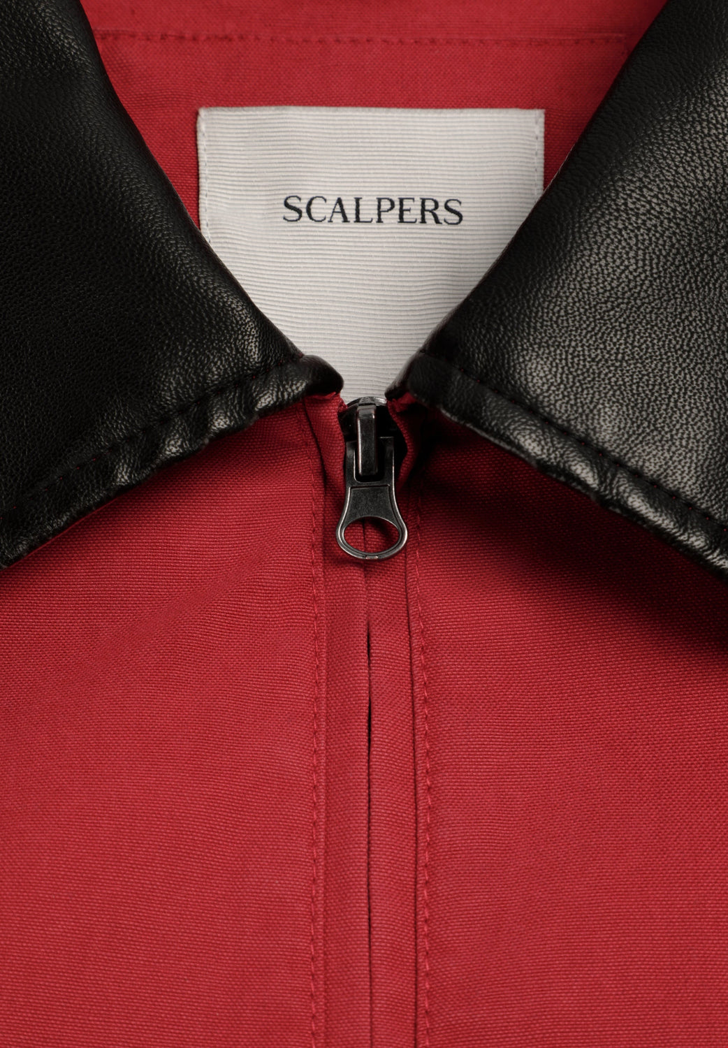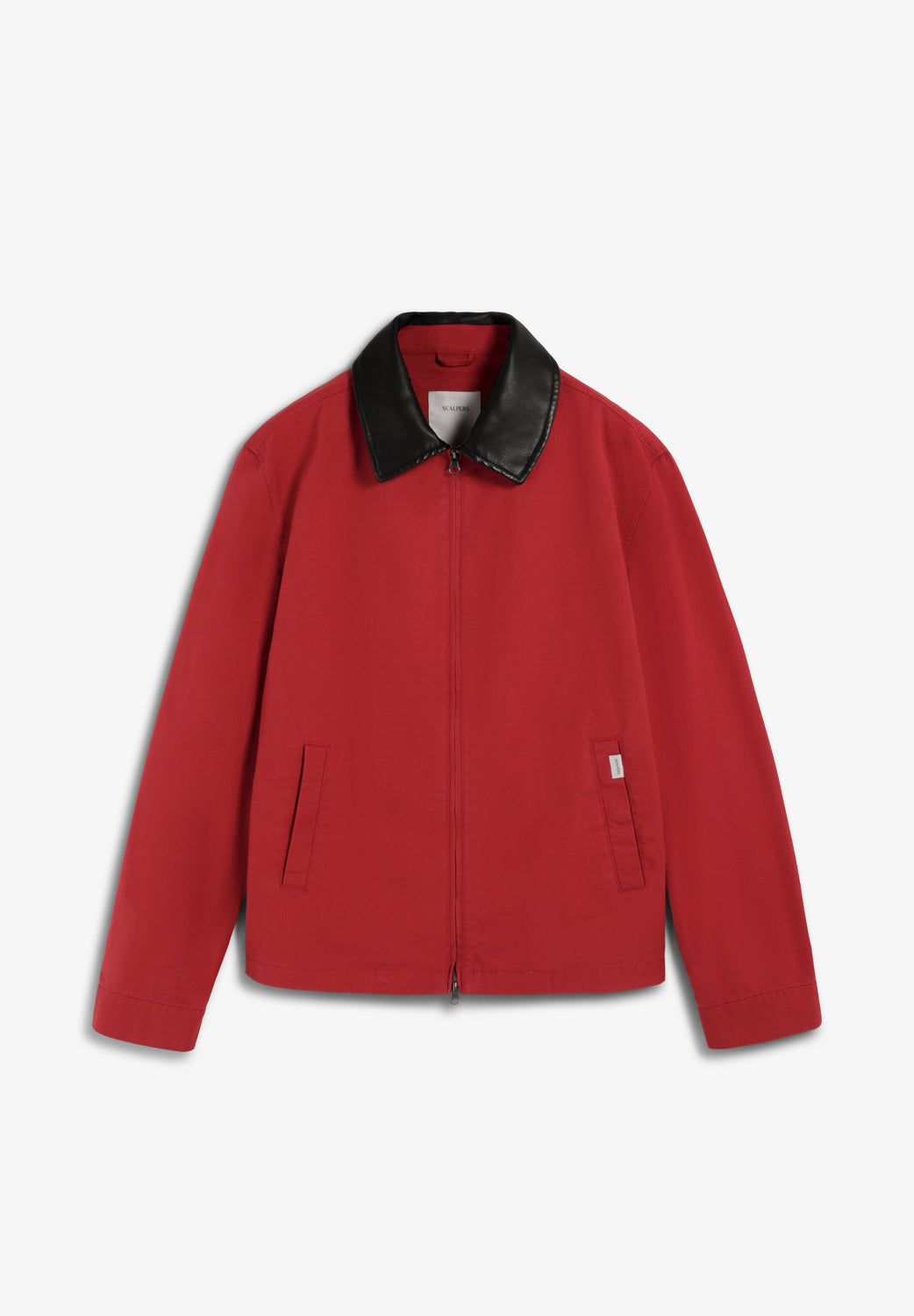 Canvas bomber jacket made of 100% BCI cotton. Contrast leather collar. Two front slant welt pockets. Double-pull zip fastening at front. Adjustable cuffs with press-studs.