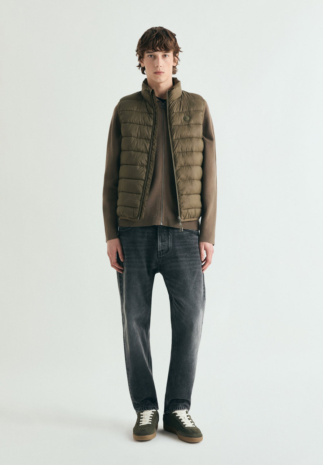 Puffer cardigan. Water repellent. Inner lining made of technical fabric. Concealed side pockets with fleece lining. Engraved double slider zip fastening. Rubberised patch with matching logo on chest.