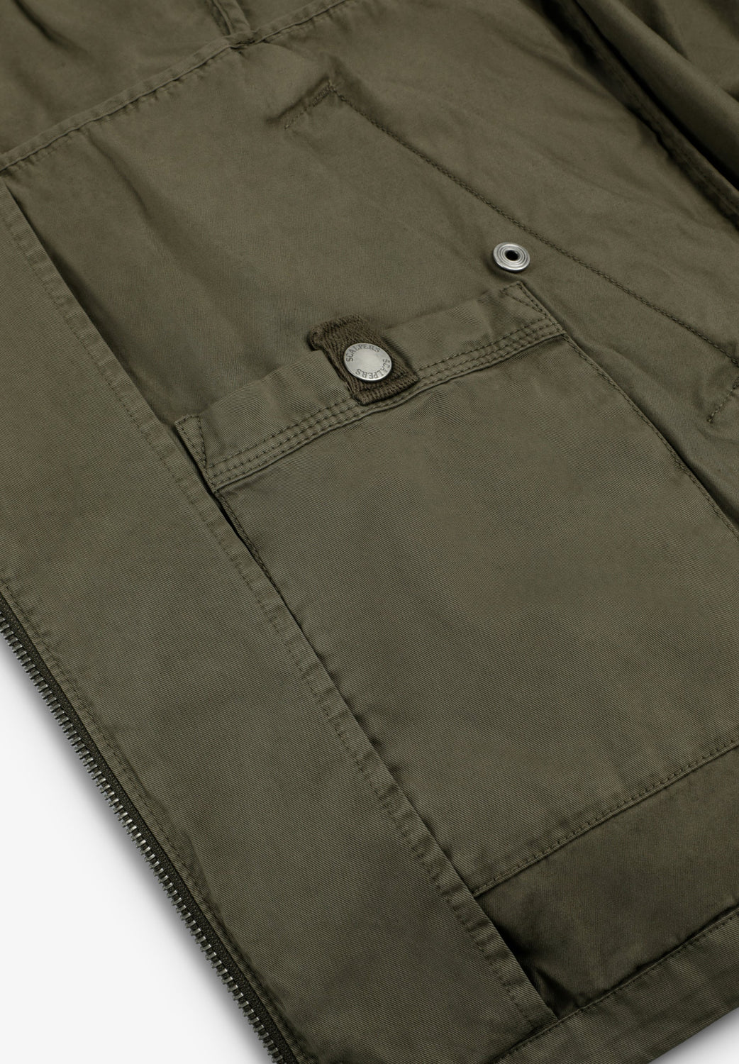 Jacket made of 100% BCI cotton. Hooded. Stand-up collar with adjustable drawstring. Three front pockets with press-stud fastening. Inner pocket. Stand-up collar Tonal skull on left sleeve.