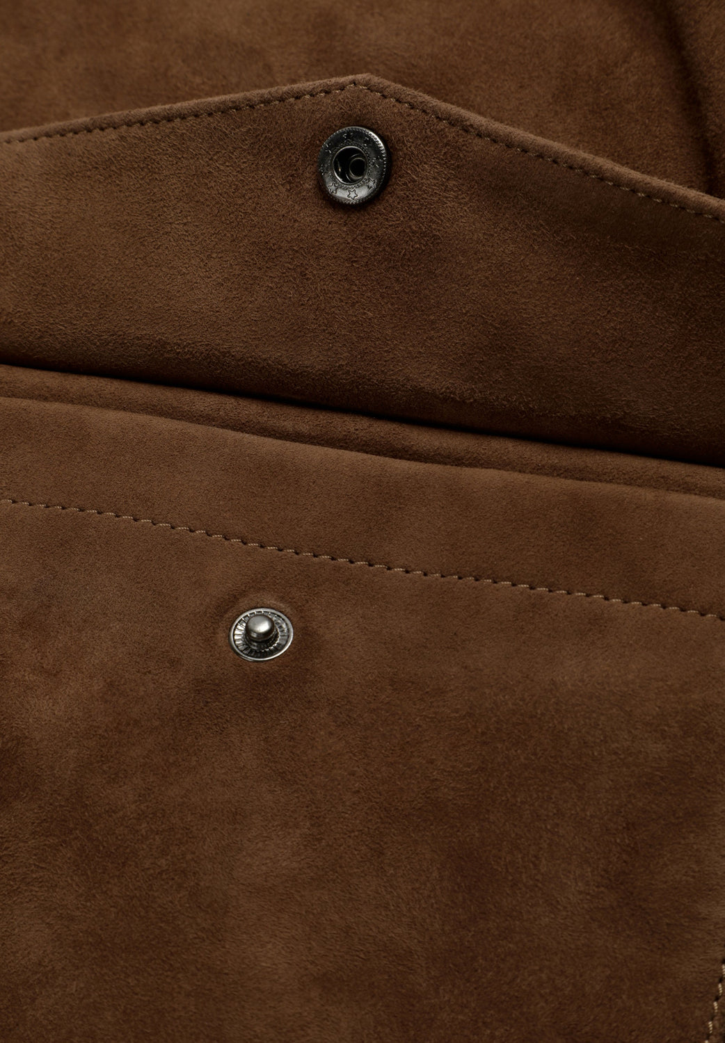 Jacket made of 100% suede. Bomber style. Shirt collar. Double entry pockets with flaps. Ribbed cuffs and hem. Back yoke. Double slider zip fastening.